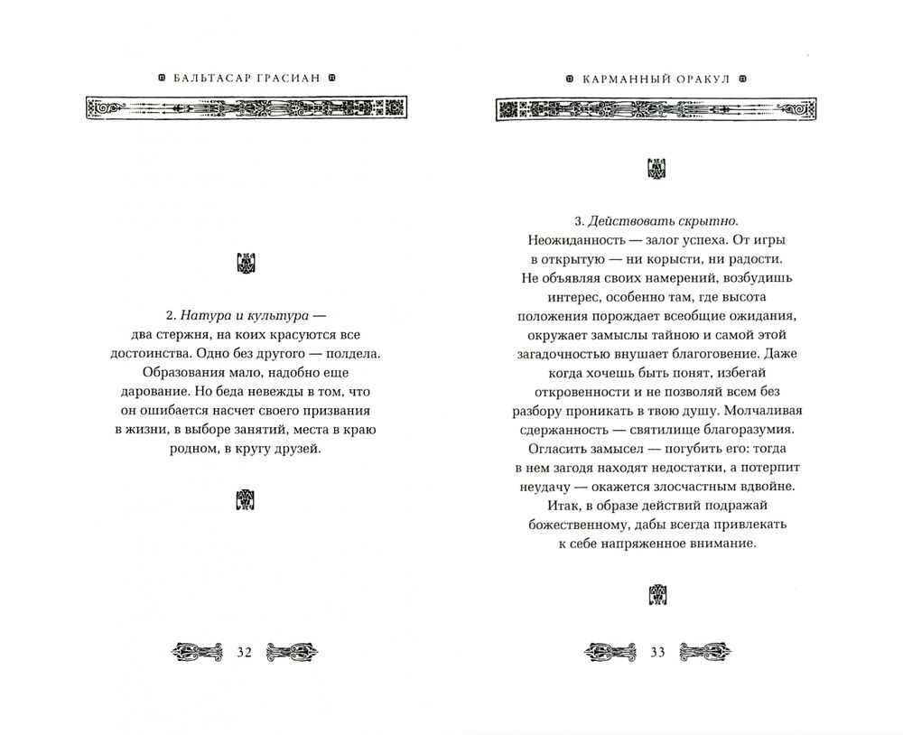 Бальтасар Грасиан – крупнейший испанский философ-моралист и писатель XVII в., обновивший сам дух испанской литературы и создавший руководства на все случаи жизни. Сочинения Грасиана долго были в забвении, пока Шопенгауэр и Ницше вновь не открыли философа читающей публике. "Карманный оракул" – наука внимания к себе, наука, превращающая жизнь в роман. Чтение "Карманного оракула" не только помогает разобраться в парадоксах и странностях психической жизни, в том числе современного человека, но и разгадать загадки культуры испанского барокко.