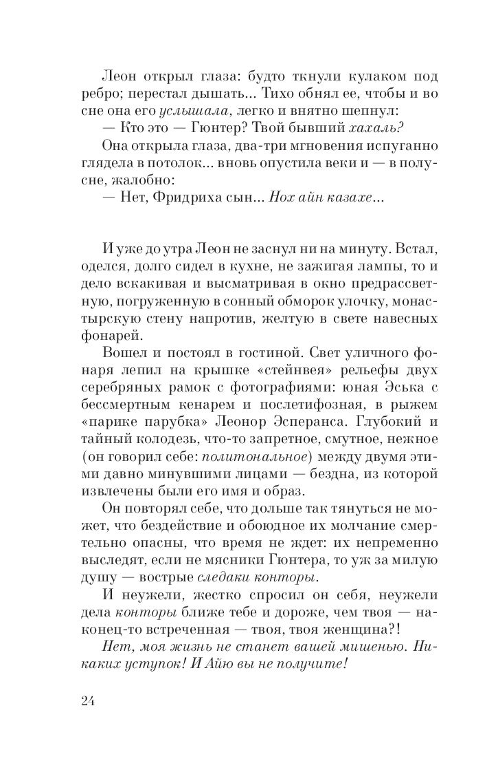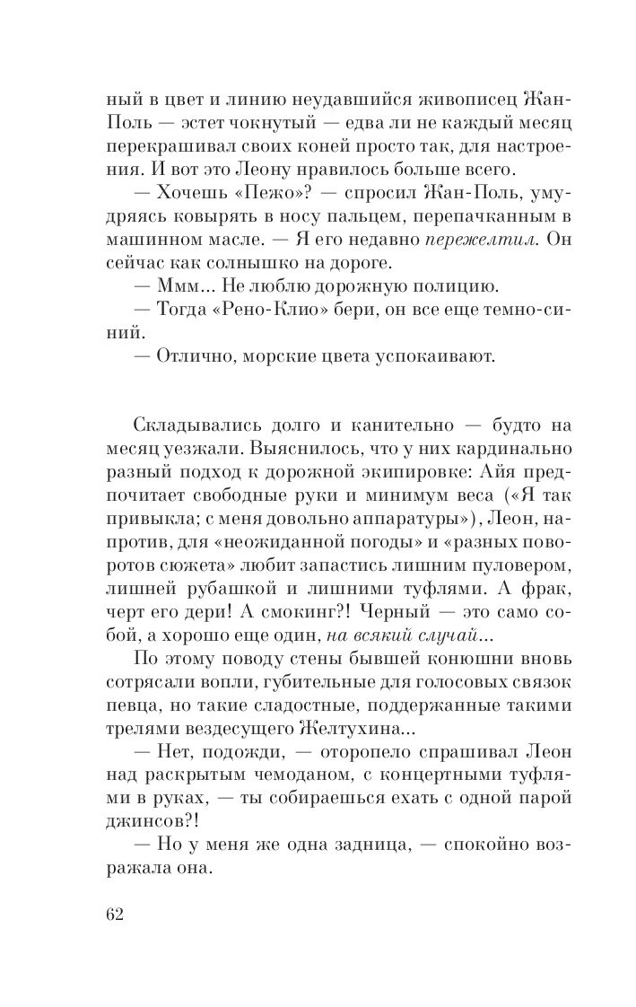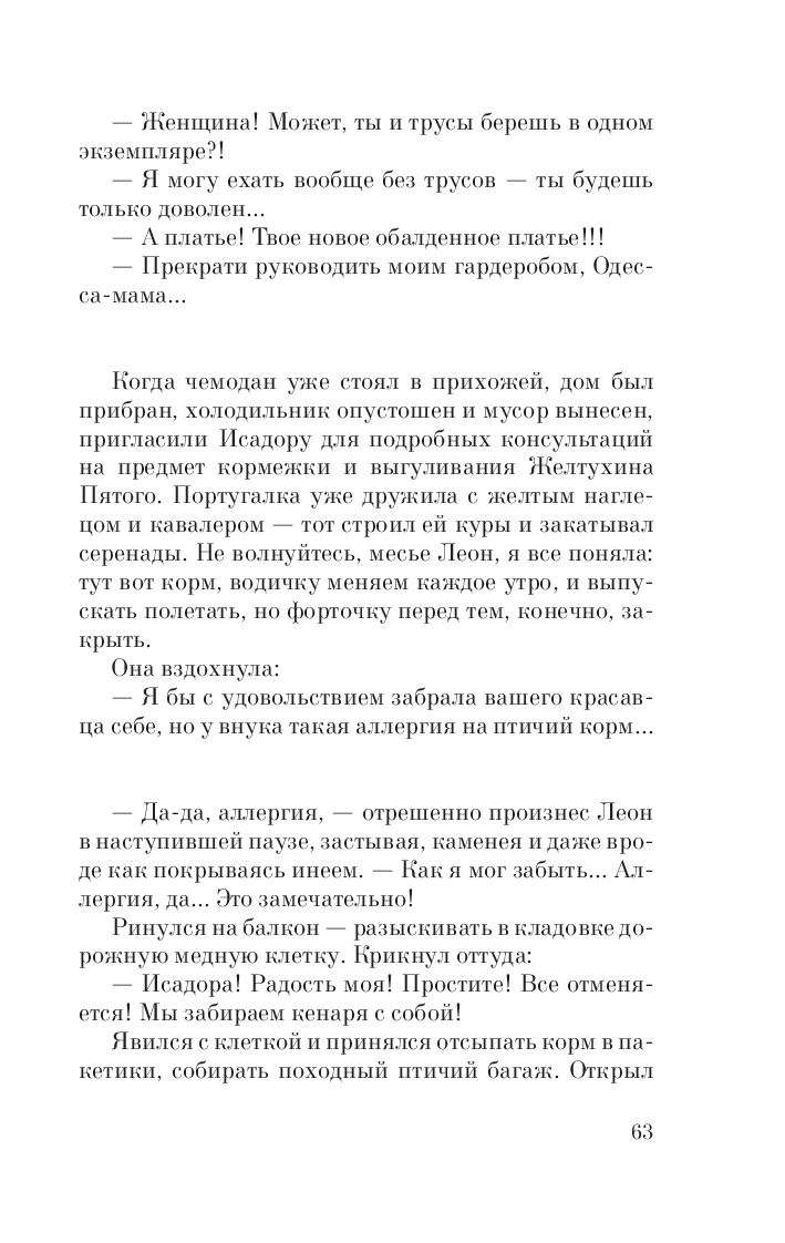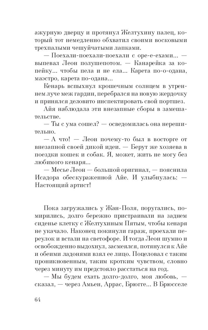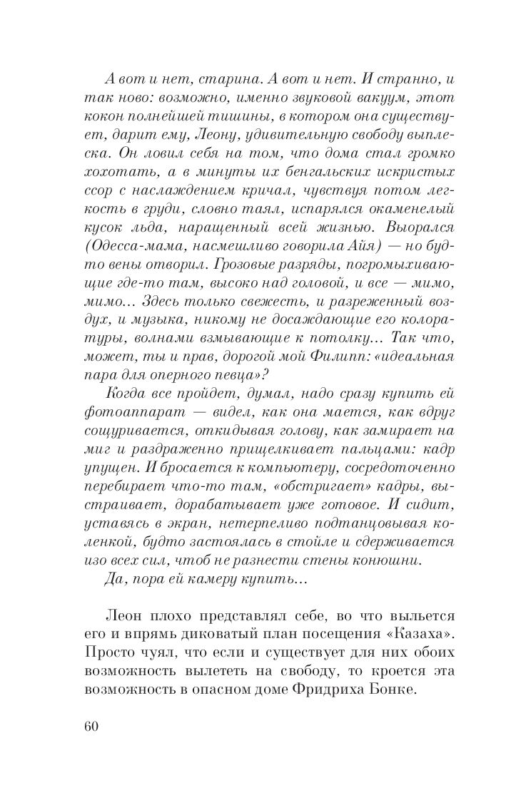 Леон Этингер, уникальный контратенор и бывший оперативник израильских спецслужб, которого никак не отпустят на волю, и Айя, глухая бродяжка, вместе отправляются в лихорадочное странствие – то ли побег, то ли преследование – через всю Европу, от Лондона до Портофино. И, как во всяком подлинном странствии, путь приведет их к трагедии, но и к счастью; к отчаянию, но и к надежде. Исход всякой "охоты" предопределен: рано или поздно неумолимый охотник настигает жертву. Но и судьба сладкоголосой канарейки на Востоке неизменно предопределена.