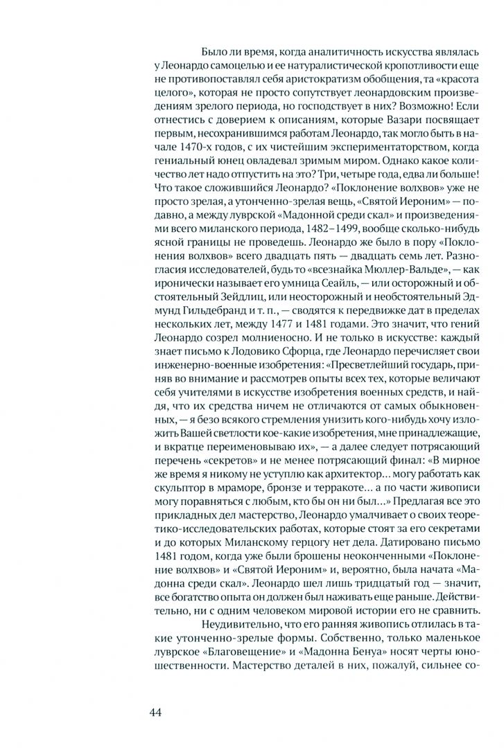 "Об искусстве". В издании представлена часть обширного рукописного наследия Леонардо да Винчи – величайшего художника эпохи Возрождения: записки, в которых затрагиваются различные теоретические и прикладные проблемы изобразительного искусства, а также литературные произведения в жанре басни, фацетии и предсказания. Благодаря труду исследователей его творчества эти разрозненные записки стали доступны современному читателю. Издание содержит репродукции рисунков и чертежей из его рукописей, а также подробные комментарии переводчиков.