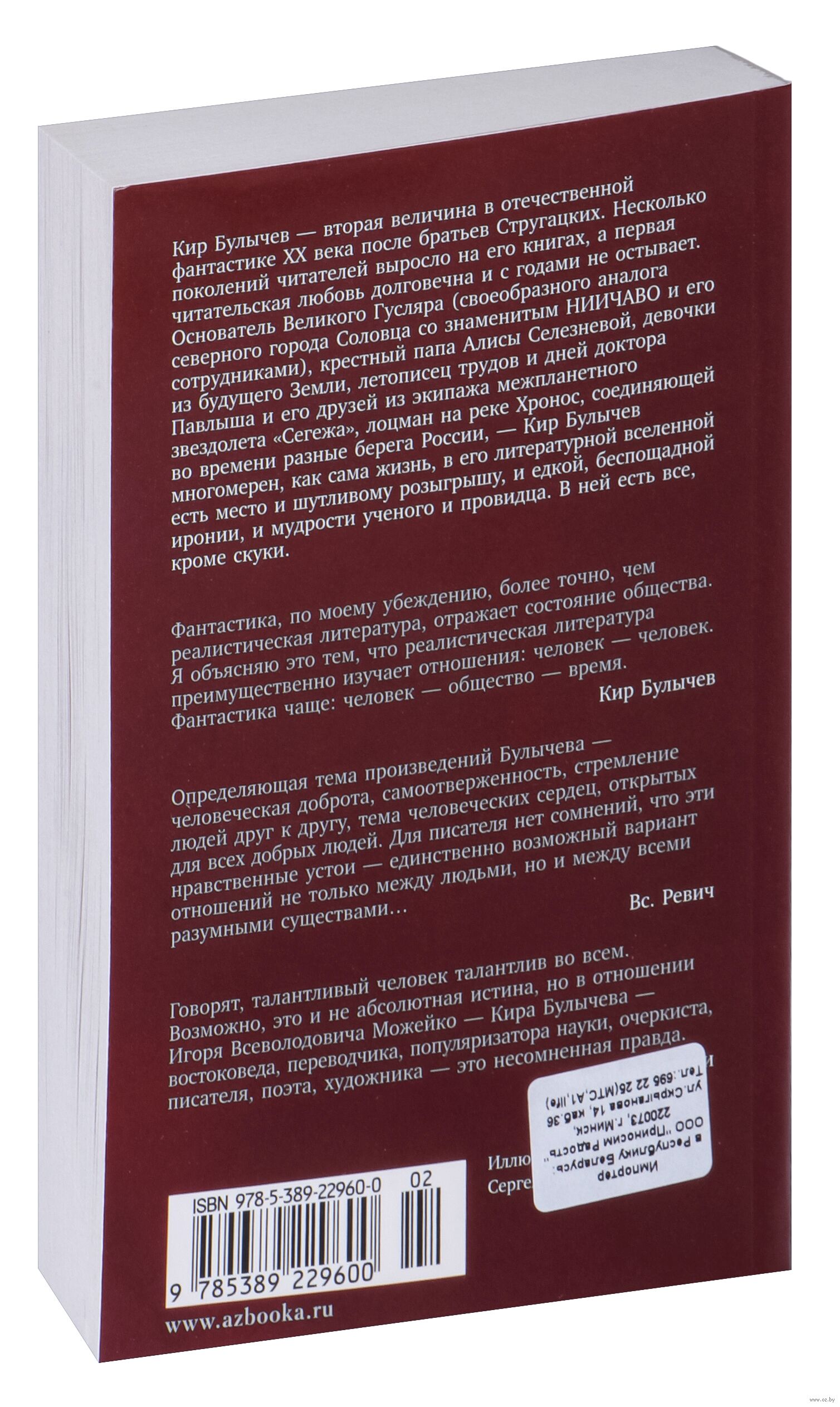 Кир Булычев – вторая величина в отечественной фантастике XX века после братьев Стругацких. Несколько поколений читателей выросло на его книгах, а первая читательская любовь долговечна и с годами не остывает. Основатель Великого Гусляра (своеобразного аналога северного города Соловца со знаменитым НИИЧАВО и его сотрудниками), крестный папа Алисы Селезневой, девочки из будущего Земли, летописец трудов и дней доктора Павлыша и его друзей из экипажа межпланетного звездолета "Сегежа", лоцман на реке Хронос, соединяющей во времени разные берега России... – Кир Булычев многомерен, как сама жизнь, в его литературной вселенной есть место и шутливому розыгрышу, и едкой, беспощадной иронии, и мудрости ученого и провидца. В ней есть все, кроме скуки.