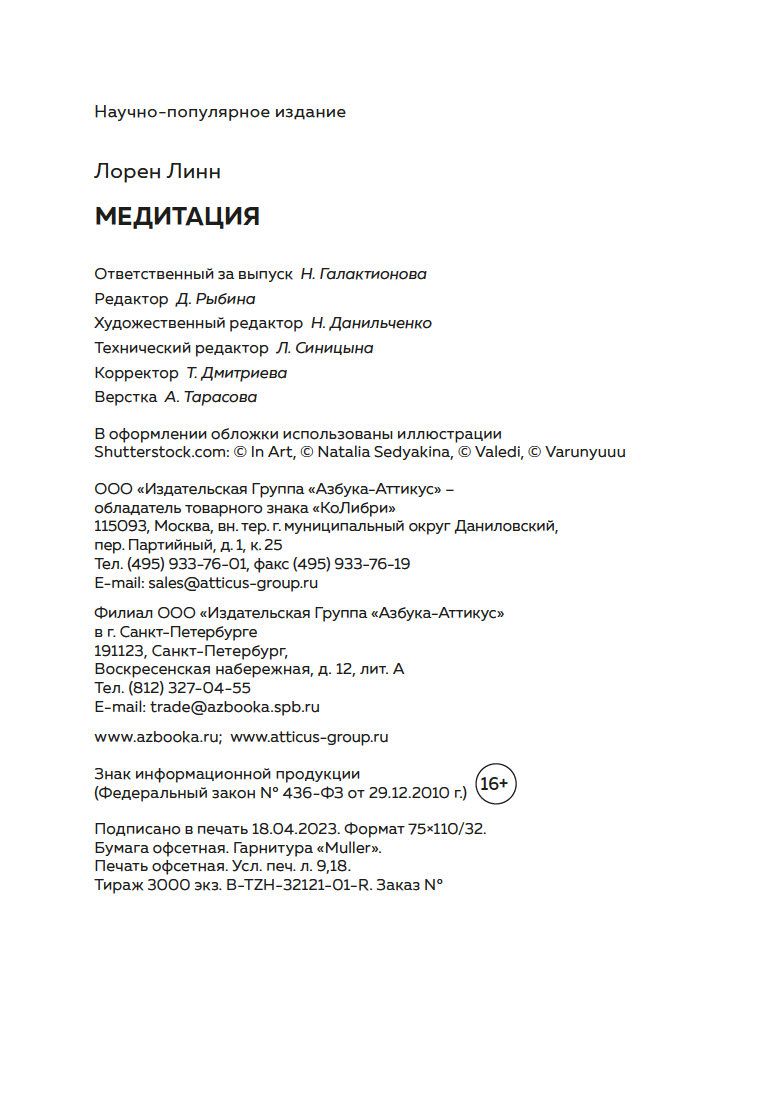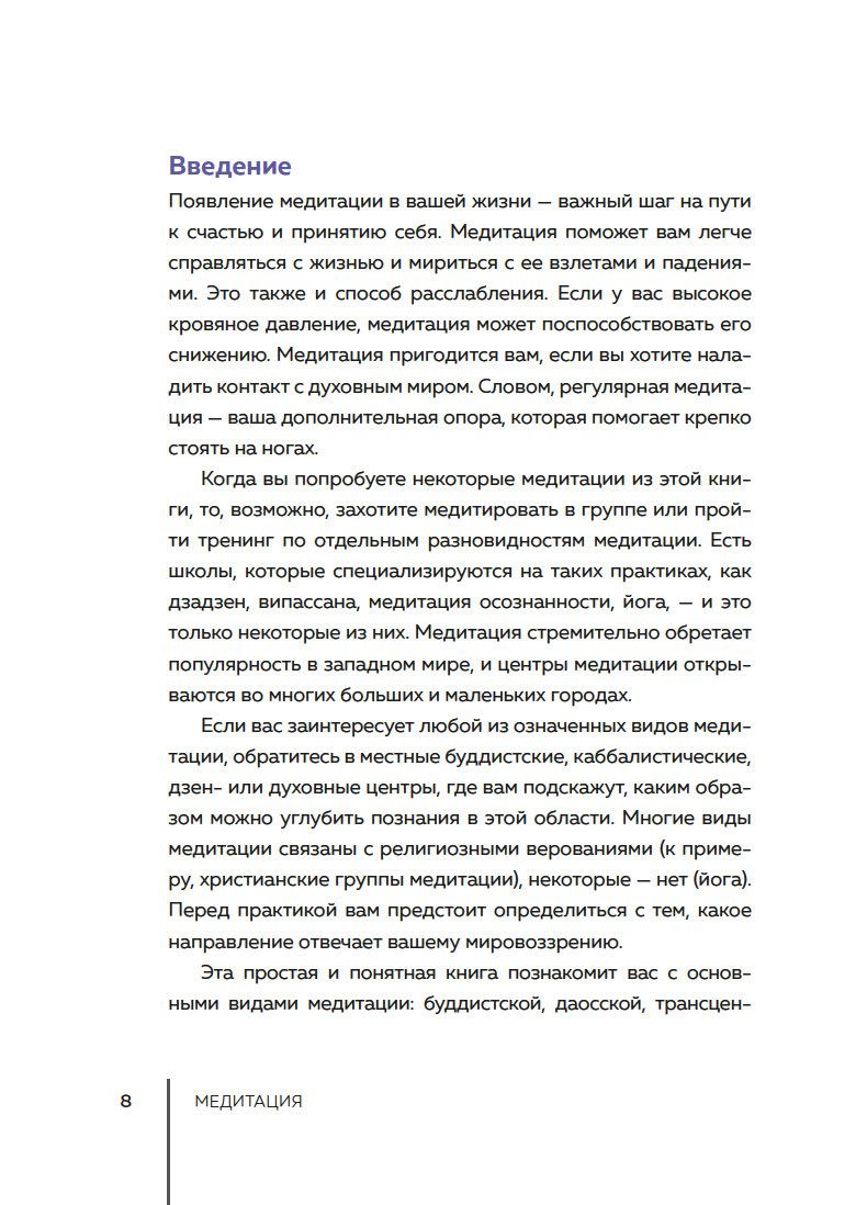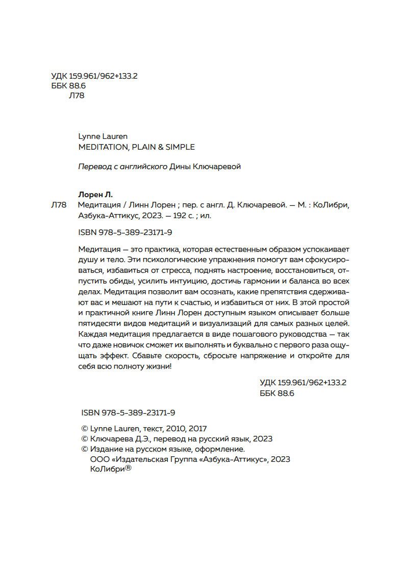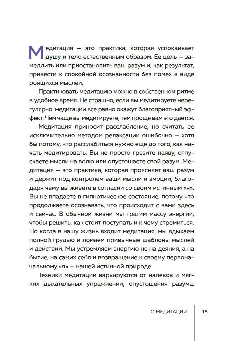 Медитация – это практика, которая естественным образом успокаивает душу и тело. Эти психологические упражнения помогут вам сфокусироваться, избавиться от стресса, поднять настроение, восстановиться, отпустить обиды, усилить интуицию, достичь гармонии и баланса во всех делах. Медитация позволит вам осознать, какие препятствия сдерживают вас и мешают на пути к счастью, и избавиться от них. В этой простой и практичной книге Линн Лорен доступным языком описывает больше пятидесяти видов медитаций и визуализаций для самых разных целей. Каждая медитация предлагается в виде пошагового руководства – так что даже новичок сможет их выполнять и буквально с первого раза ощущать эффект. Сбавьте скорость, сбросьте напряжение и откройте для себя всю полноту жизни!