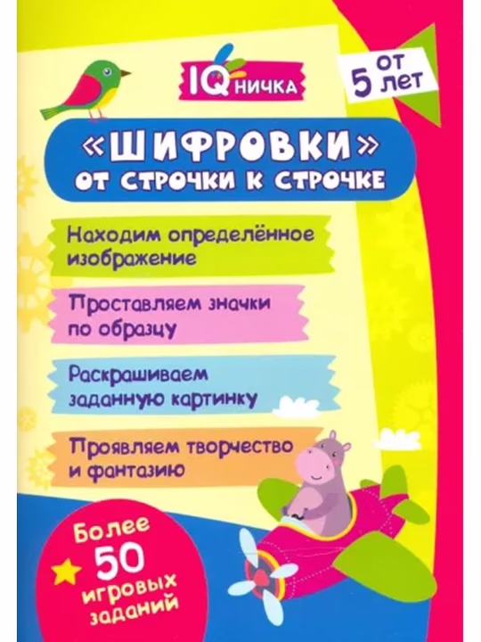 Блокнот "IQничка. Шифровки – от строчки к строчке" для детей дошкольного возраста содержит странички с увлекательными игровыми заданиями по методике "корректурные пробы", направленными на развитие зрительной памяти, концентрации внимания и усидчивости.