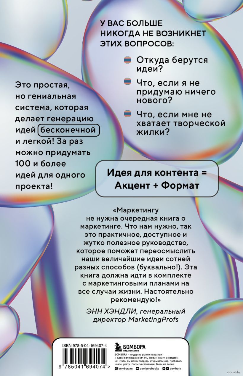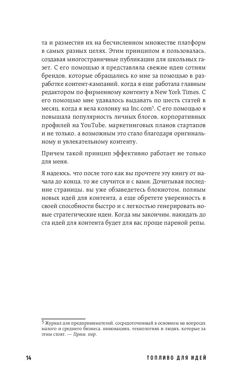 Весь мир перешел в онлайн и никогда раньше мы не потребляли столько контента, как сейчас. Реклама, кино, сериалы, социальные сети, СМИ – ежеминутно на человека сваливается огромное количество информации, но как сделать так, чтобы именно ваша идея, именно ваш продукт запомнился? Больше не нужно ждать вдохновения и ломать голову над очередным постом. Эта книга даст вам рабочую схему на все случаи жизни, чем бы вы ни занимались. "Топливо для идей" – это простая структура, которая каталогизирует процесс мозгового штурма и делает генерацию идей легкой и универсальной! Все что вам нужно – определиться с форматом и выбрать акцент и идеи польются рекой!