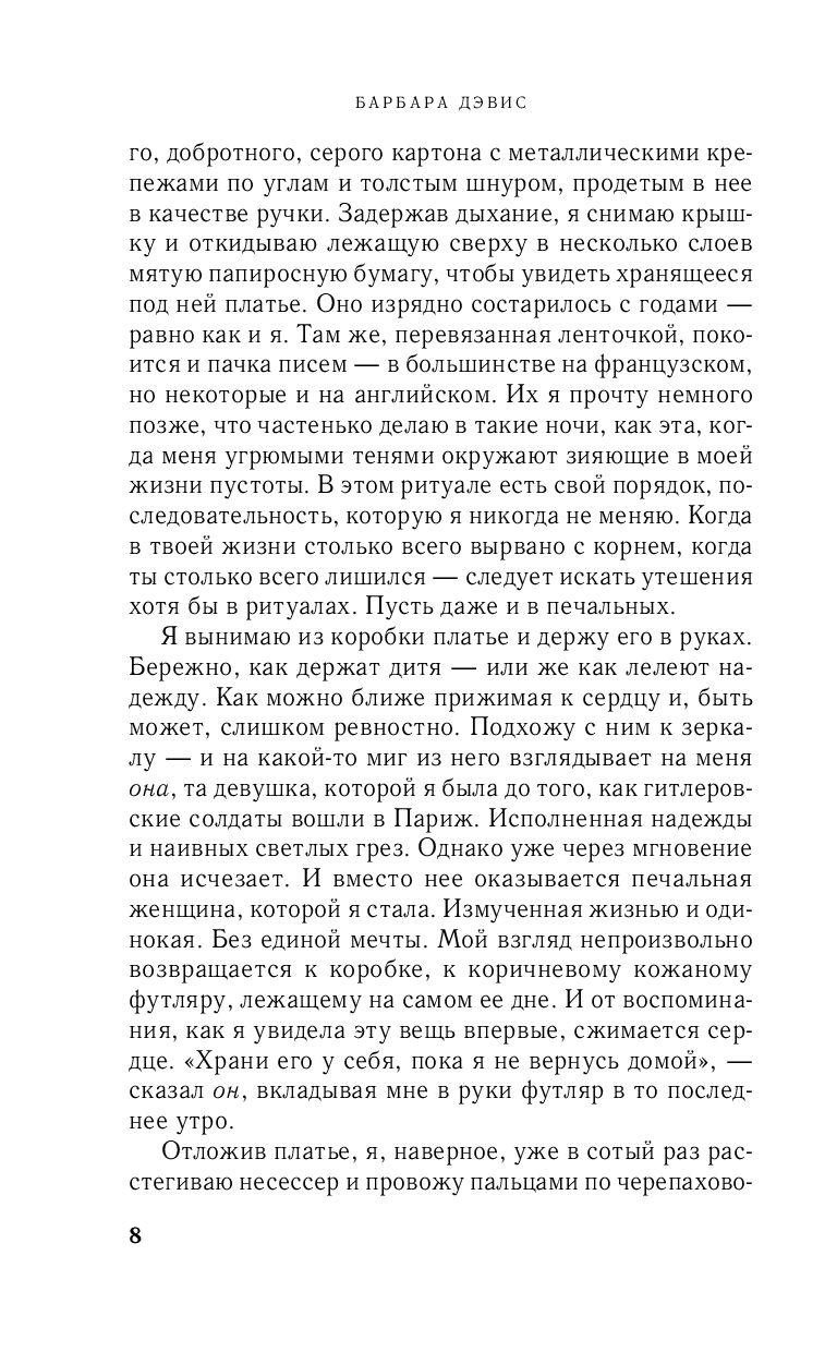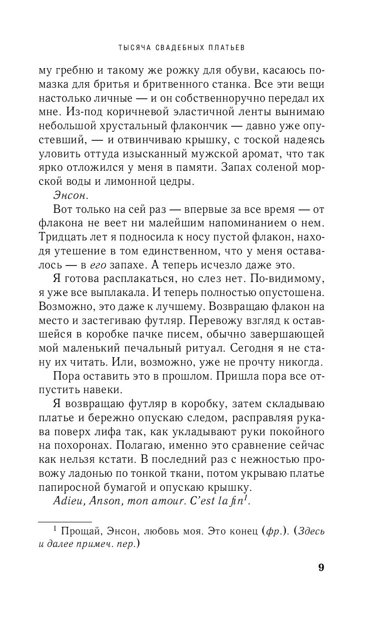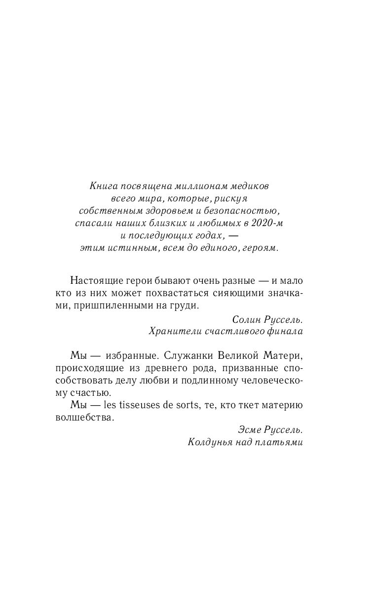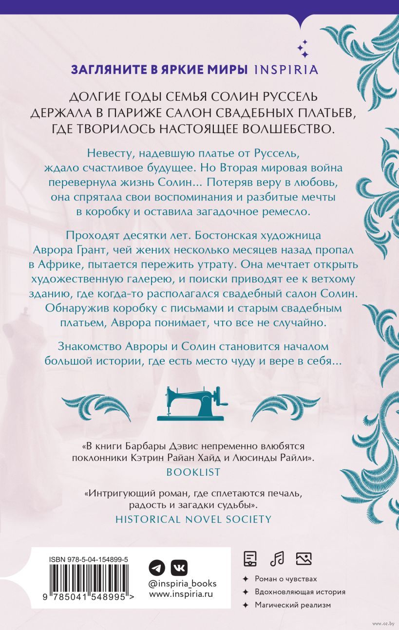 Долгие годы семья Солин Руссель держала в Париже салон свадебных платьев, где творилось настоящее волшебство. Невесту, надевшую платье от Руссель, ждало счастливое будущее. Но Вторая мировая война перевернула жизнь Солин... Потеряв веру в любовь, она спрятала свои воспоминания и разбитые мечты в коробку и оставила загадочное ремесло.