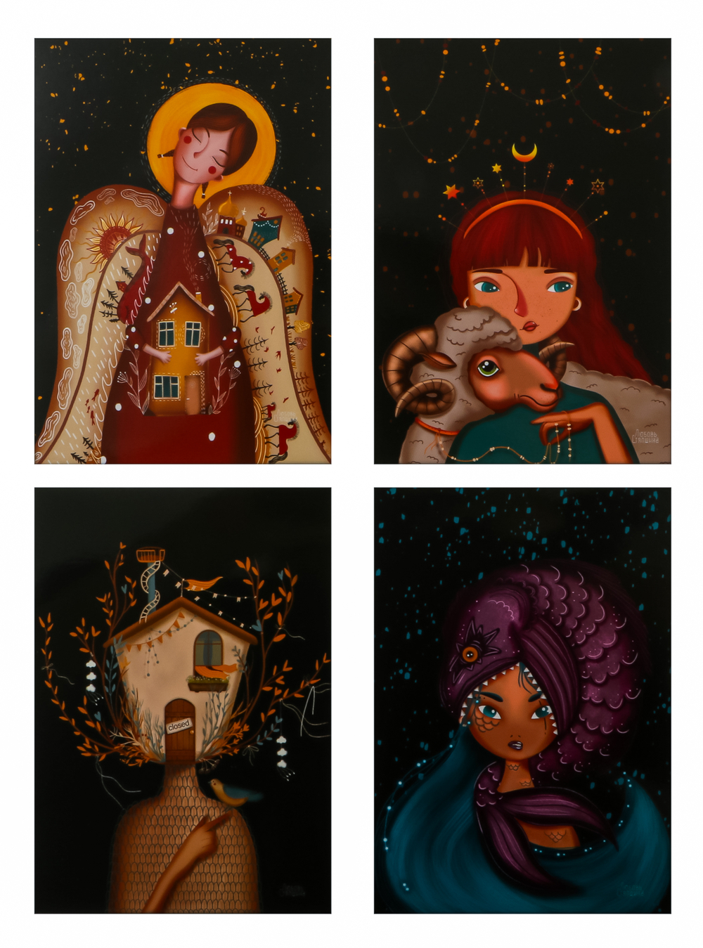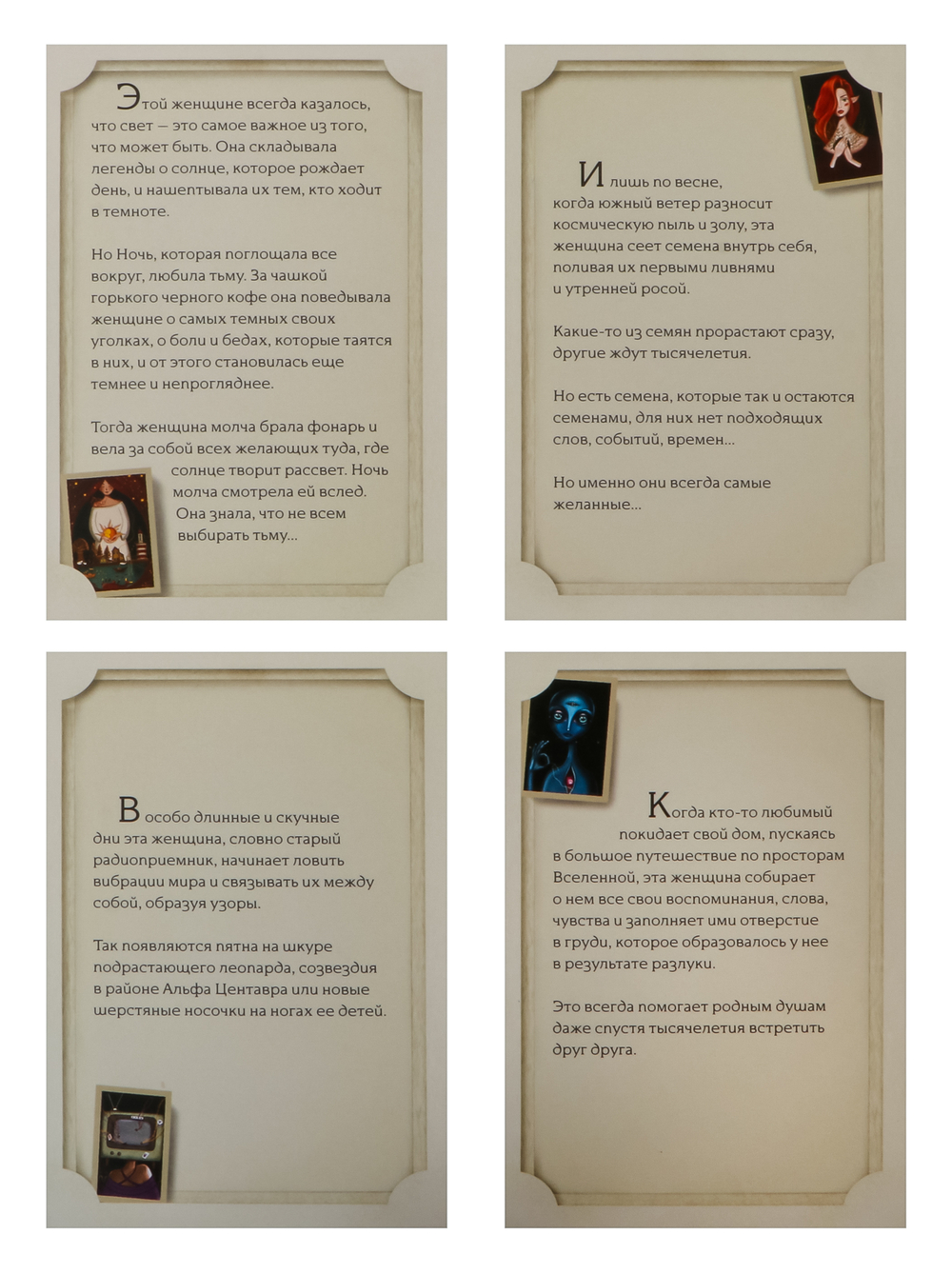 "В моменты, когда западный ветер, путешествуя со стаей перелетных птиц, разносит тревожные вести, эта женщина нежно обнимает мир, стараясь не пропустить ни одного дома. В такие дни каждый может почувствовать ее любовь и присутствие", – тексты на открытках, словно древние песни – бережно баюкают и обнимают, шепчут слова поддержки и помогают окунуться в целительное творческое пространство.