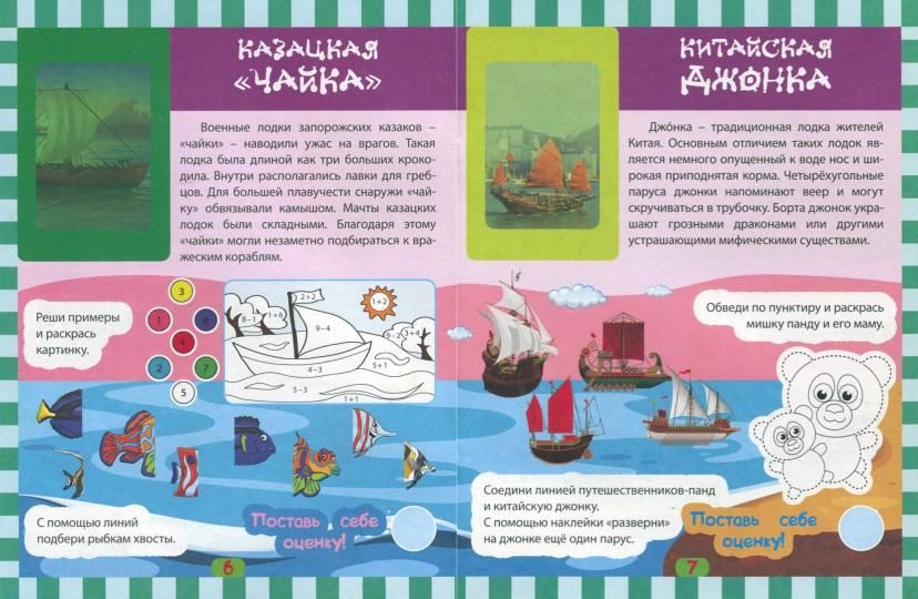 Блок "Старинные корабли" содержит лист с яркими наклейками каноэ, финикийского и египетского торгового корабля, китайской джонки, галеры, каравеллы и шхуны, испанского галеона. В процессе работы с набором у ребенка совершенствуются тонкие движения, развивается логика и внимание, речь, память, творческое воображение, изобразительные, познавательные и коммуникативные умения, необходимые детям для достижения образовательных результатов в соответствии с требованиями ФГОС. Кроме того, ребенок может оценить выполненную работу, обозначив результат специальным символом-значком.