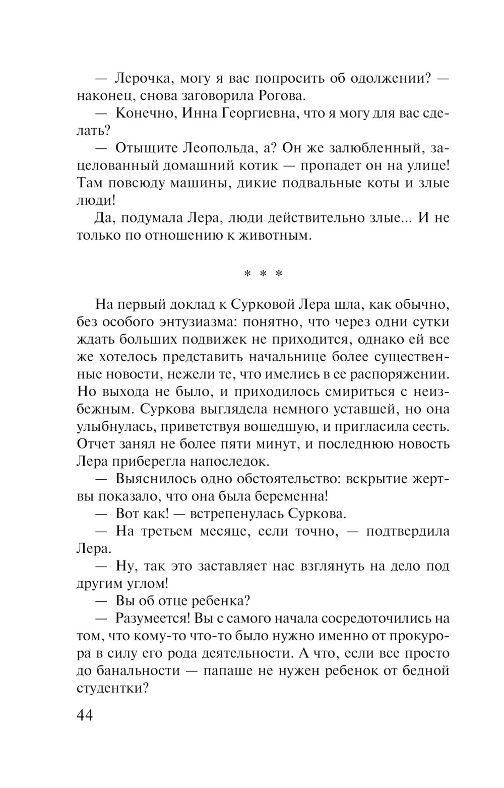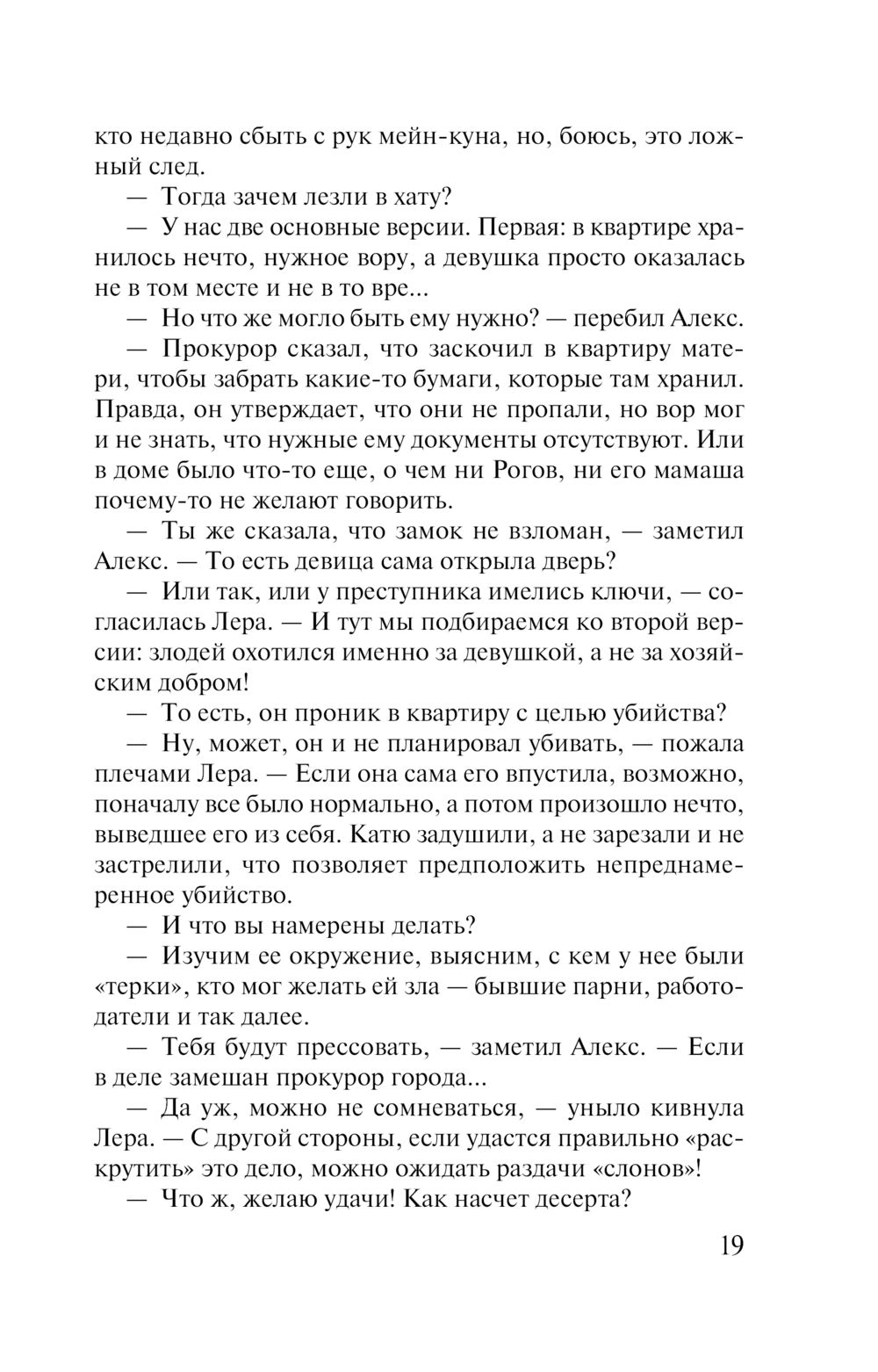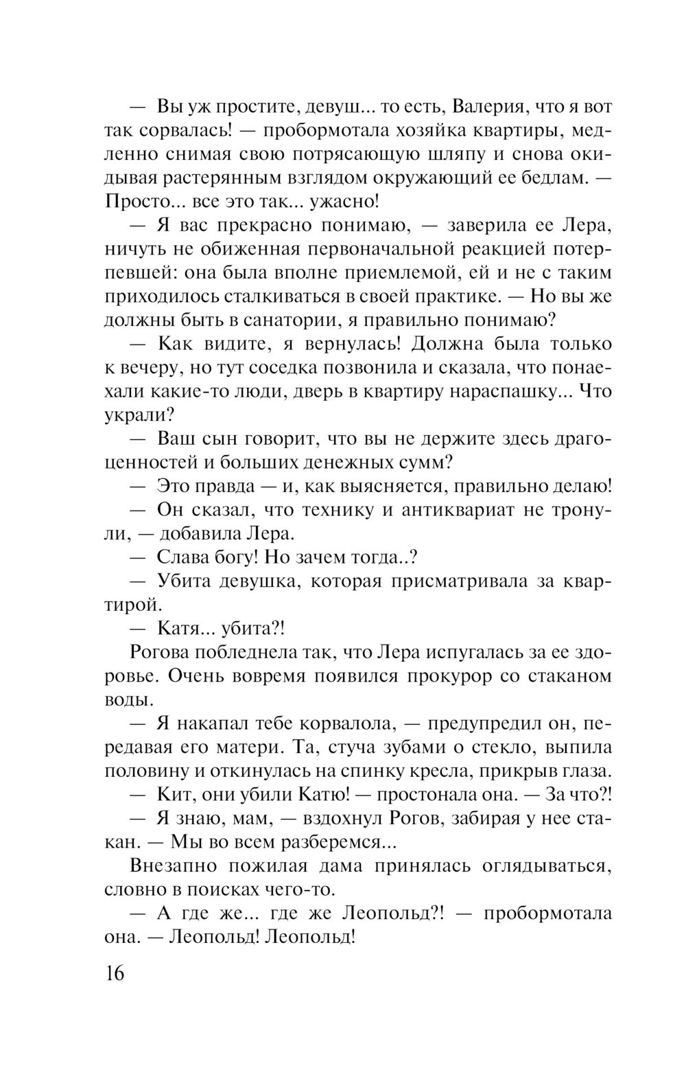 Лера Медведь расследует громкое дело: задушена девушка, в отсутствие хозяйки присматривавшая за квартирой матери самого прокурора города! Следствие пытается выяснить, кому понадобилось убивать скромную студентку, бедную девушку из многодетной провинциальной семьи. Тем временем матушку прокурора больше волнует другой вопрос: где ее обожаемый кот? В день убийства красавец-мейнкун Леопольд бесследно пропал. Его любящая хозяйка на грани инфаркта, и добрая Лера опрометчиво обещает старушке прояснить судьбу ее дорого питомца. Теперь ей придется искать не только убийцу, но и кота! Впрочем, Леопольд ведь может оказаться важным свидетелем – он был на месте преступления! Но какой помощи следствию можно ожидать от неразумного животного?..