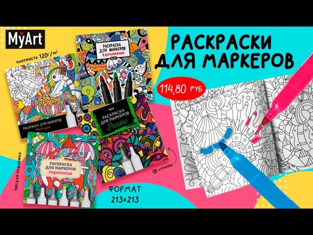 Раскраска для маркеров из линейки для творчества MyArt-хороший способ отдохнуть от повседневных дел. Каждая из 4 книг серии содержит 18 иллюстраций, раскрашивание которых поможет зарядиться вдохновением и найти новые идеи. Плотные листы с односторонней печатью отлично подходят для художественных маркеров, карандашей и фломастеров.