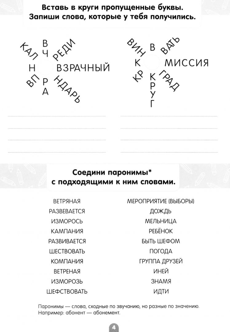 Брошюра "Экспресс-тренажёр" предлагает читателям выполнить разнообразные упражнения: вставить пропущенные буквы, соединить слово и его значение, поставить ударение, расшифровать слова.