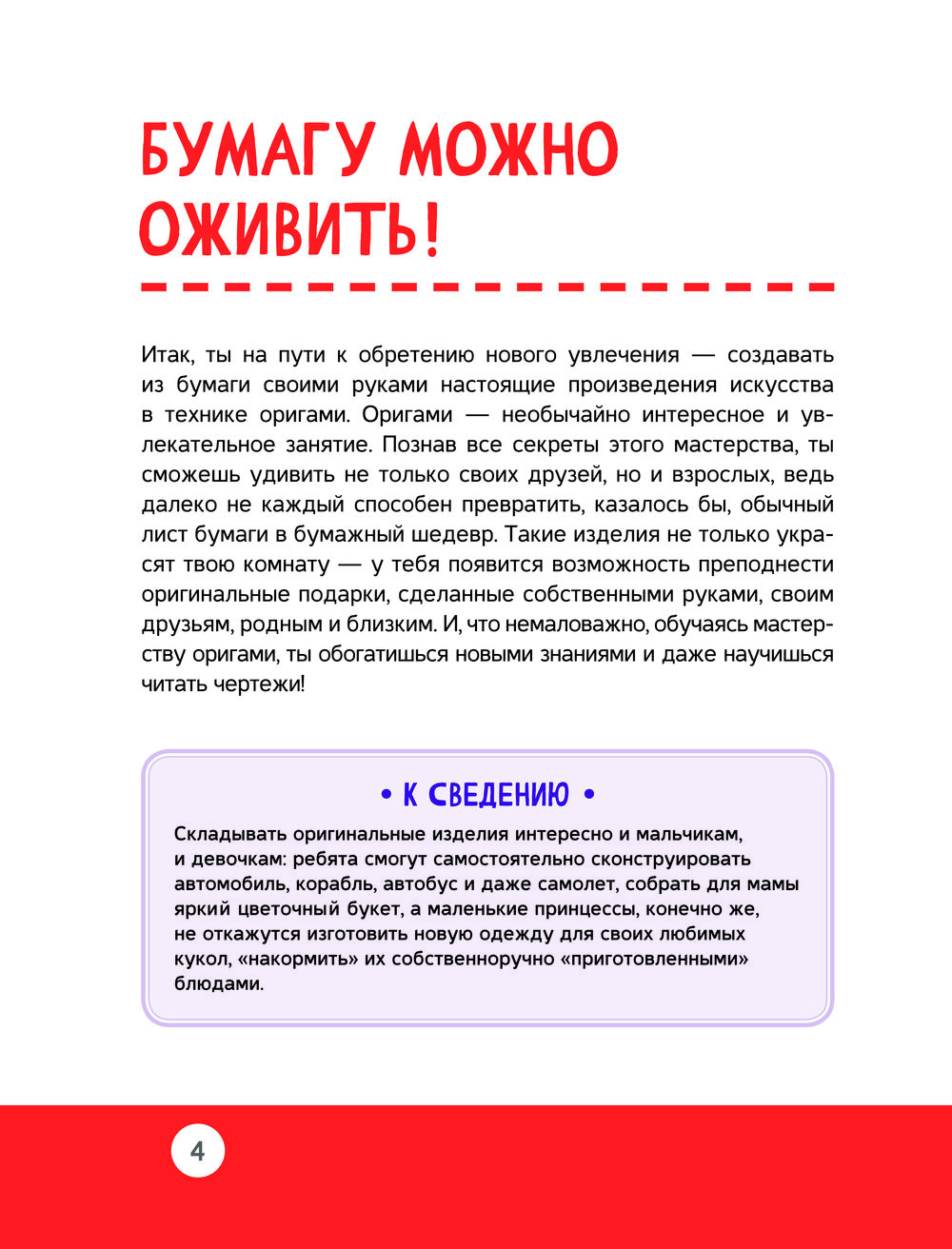 Данное издание ориентировано в первую очередь на детей 8-10 лет, благодаря разнообразию представленных моделей оригами на различные темы оно заинтересует и мальчиков, и девочек. Процесс создания каждой бумажной фигурки подробно описан в пошаговой инструкции и сопровождается детальной схемой, понятной юным мастерам оригами. Кроме того, в книге приведены удивительные факты об окружающем мире, которые помогут детям расширить кругозор.