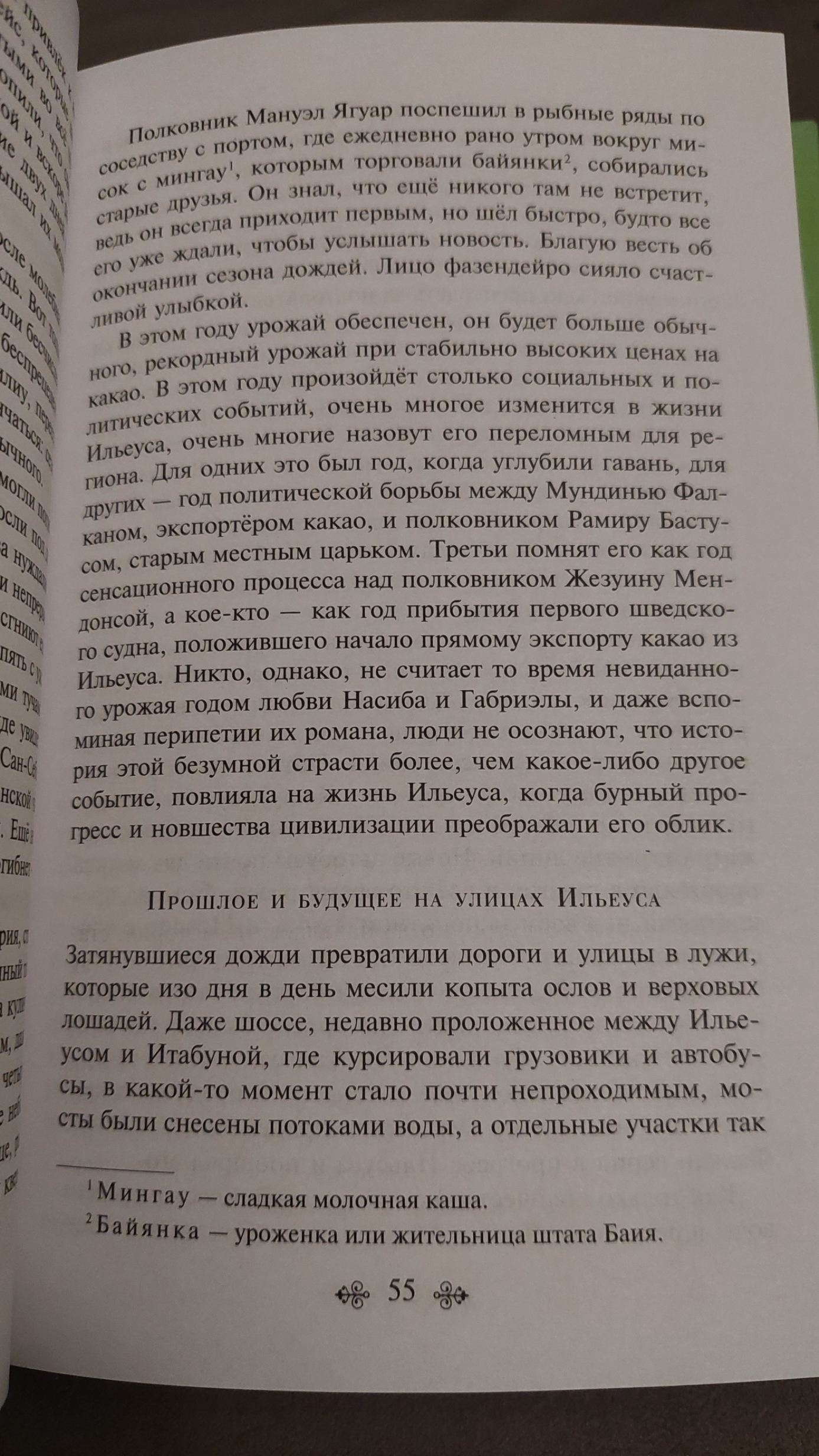 Роман "Габриэла" вышел в Бразилии в 1958 году и произвел эффект взорвавшейся бомбы. За две недели было продано 20 000 экземпляров, а за год – 120 000 экземпляров книги. На русском роман издан в 1961 году, и, по словам Ильи Эренбурга – друга Амаду: ""Габриэлу" читают у нас, не отрываясь от книги".