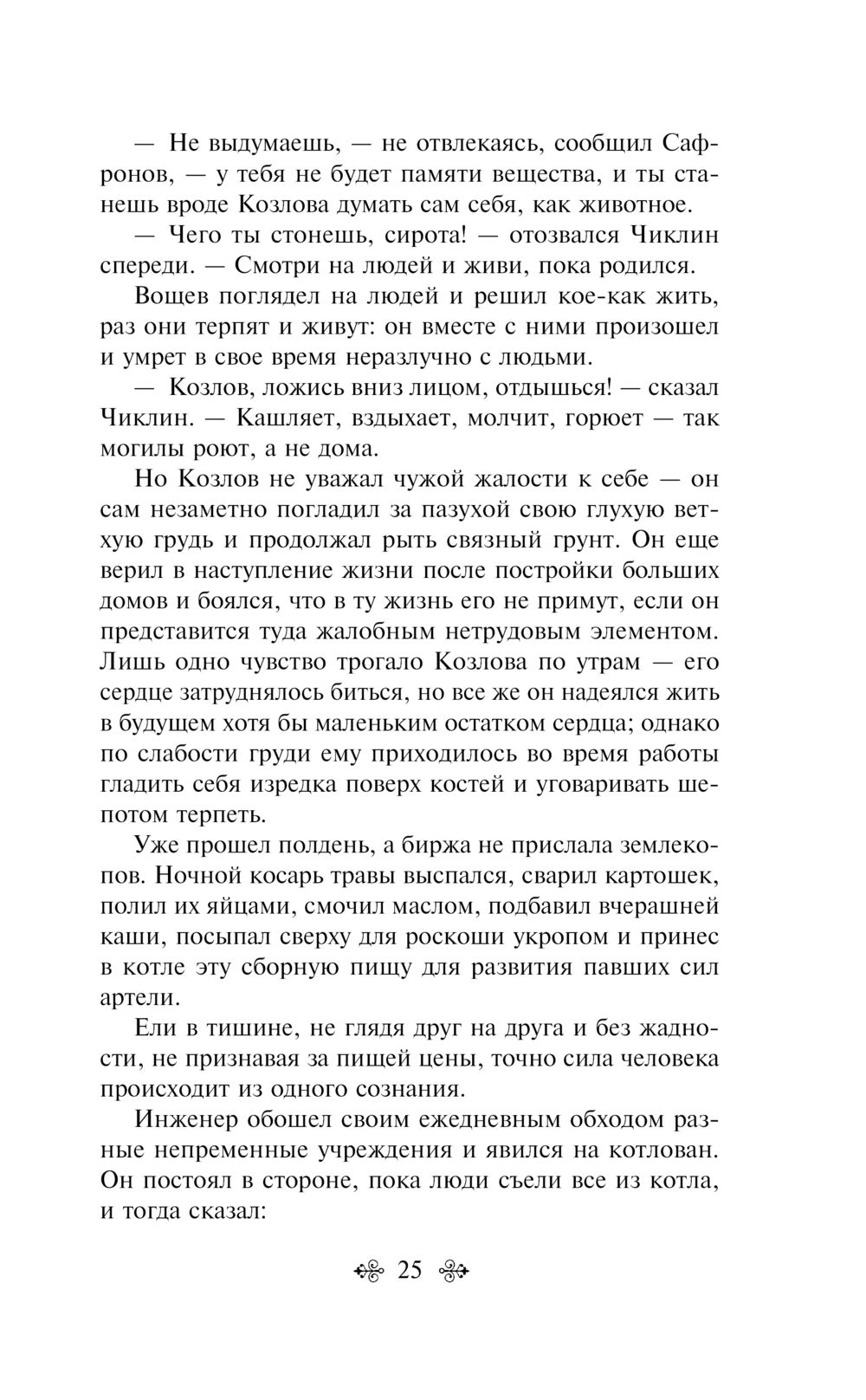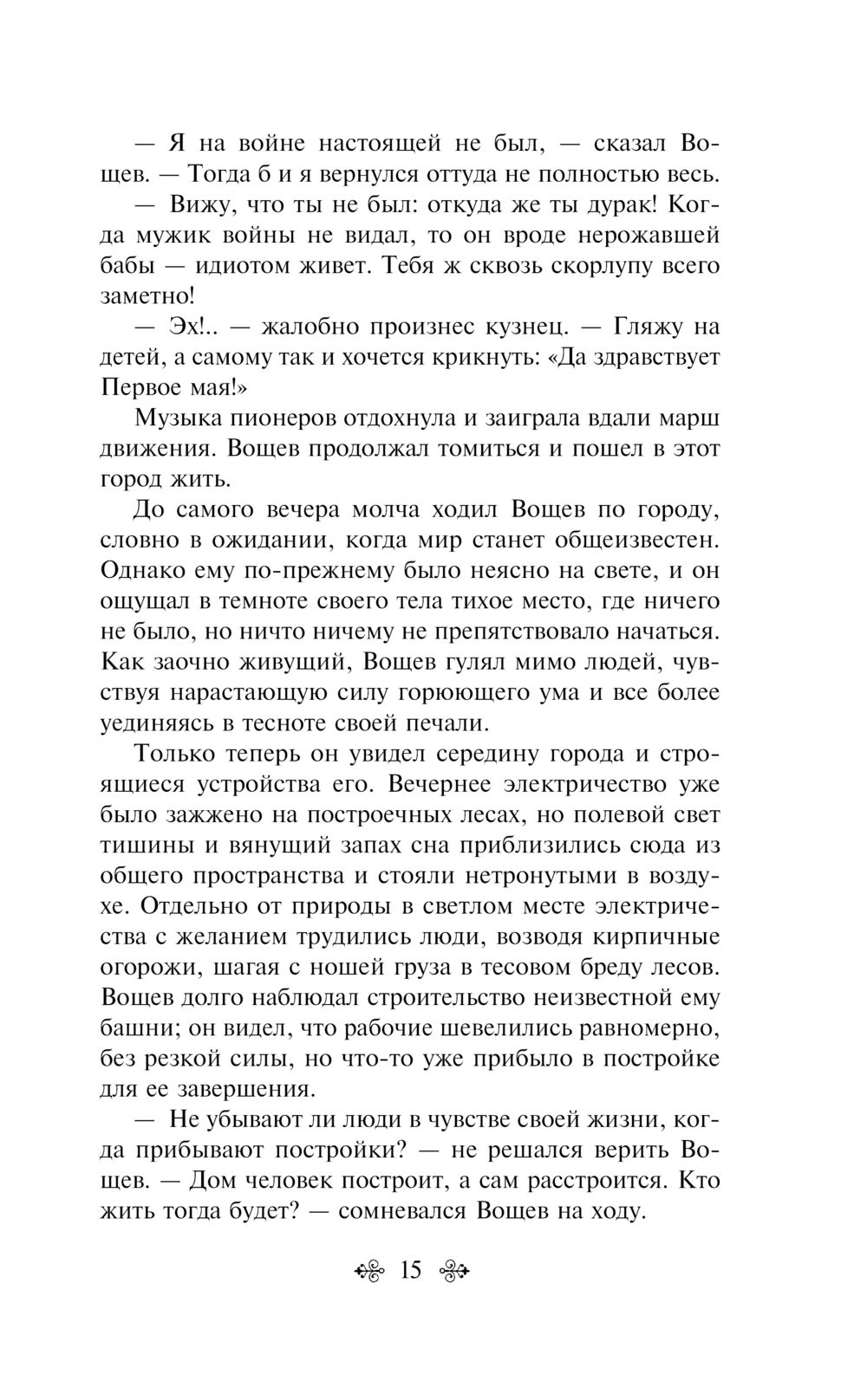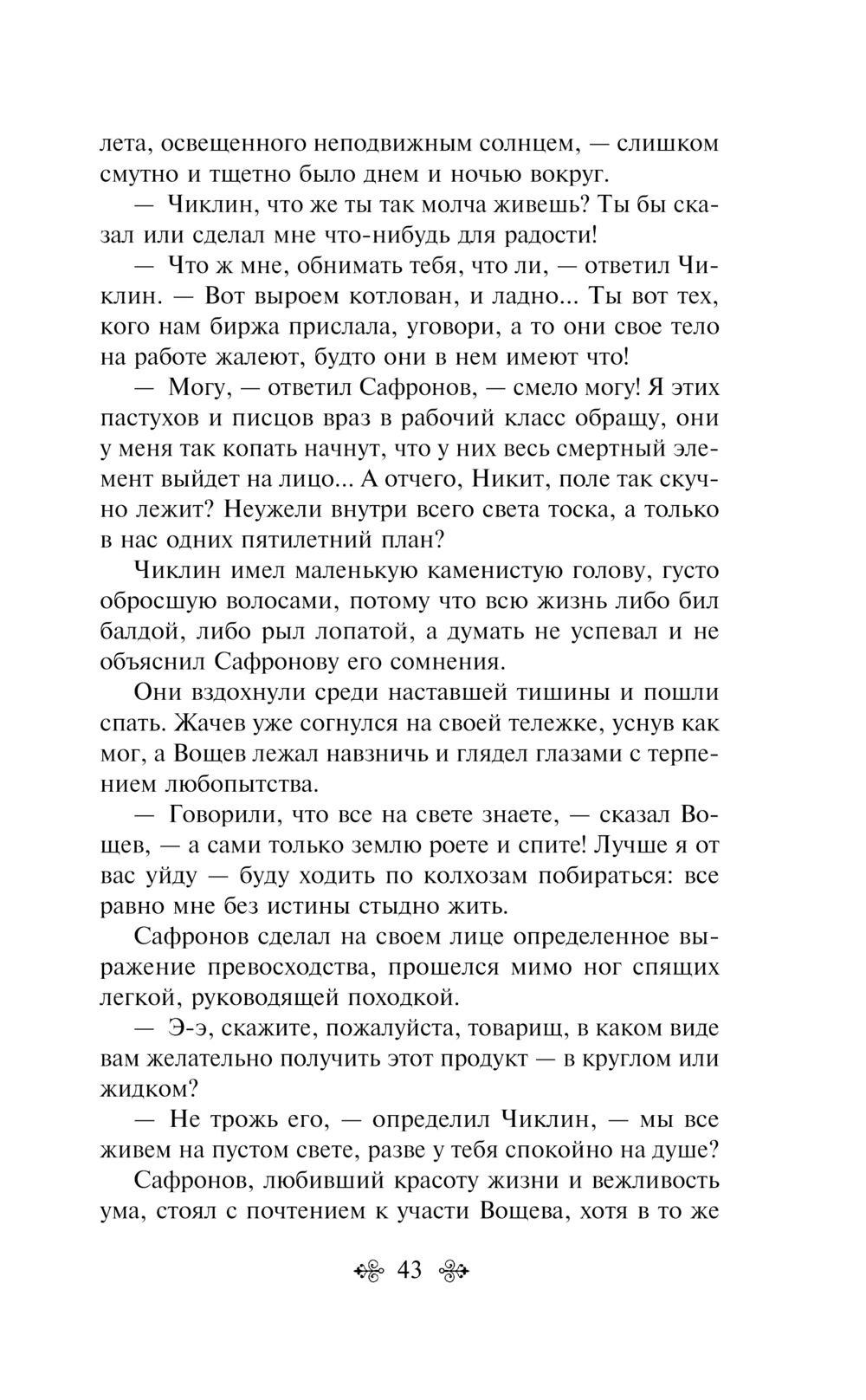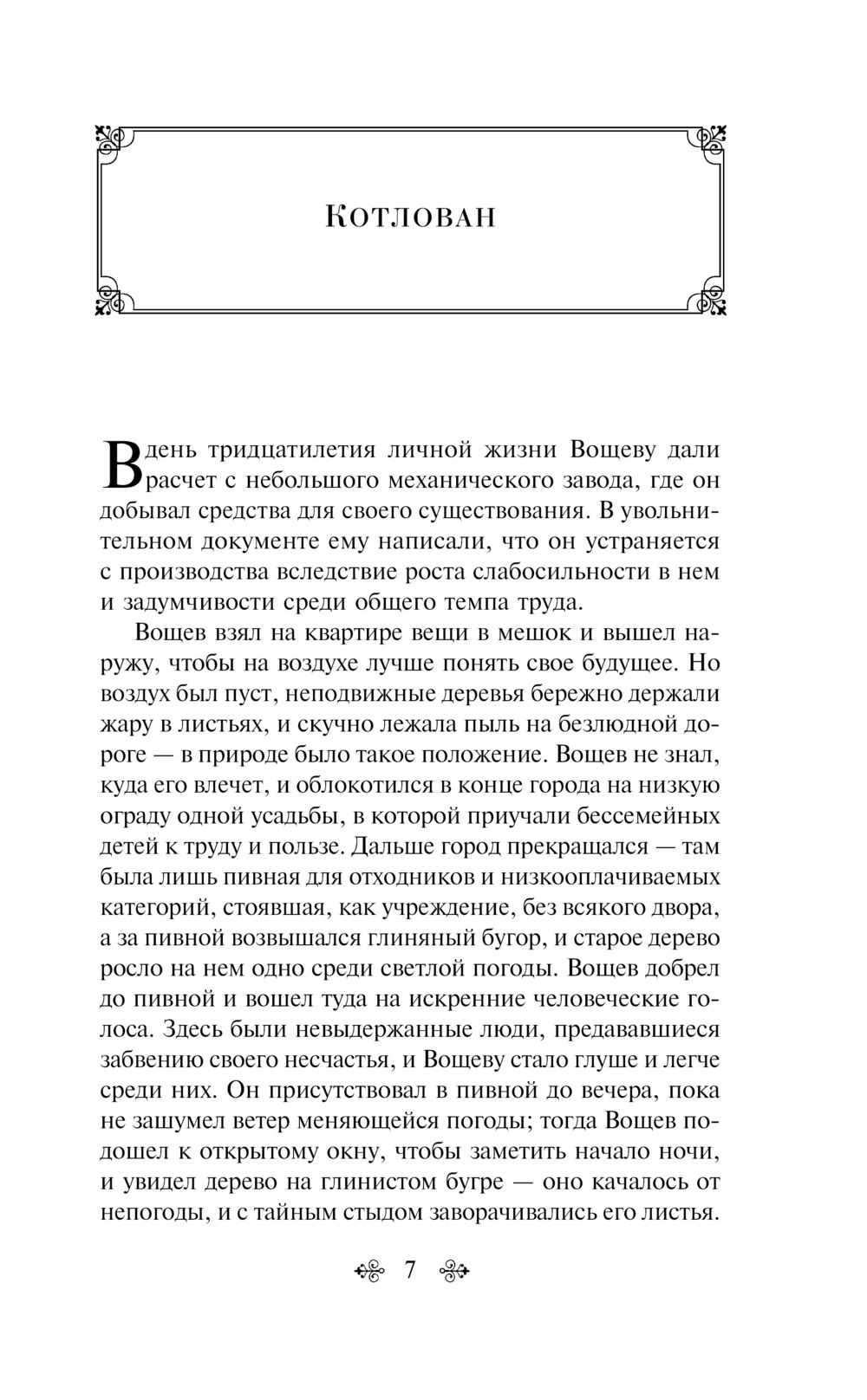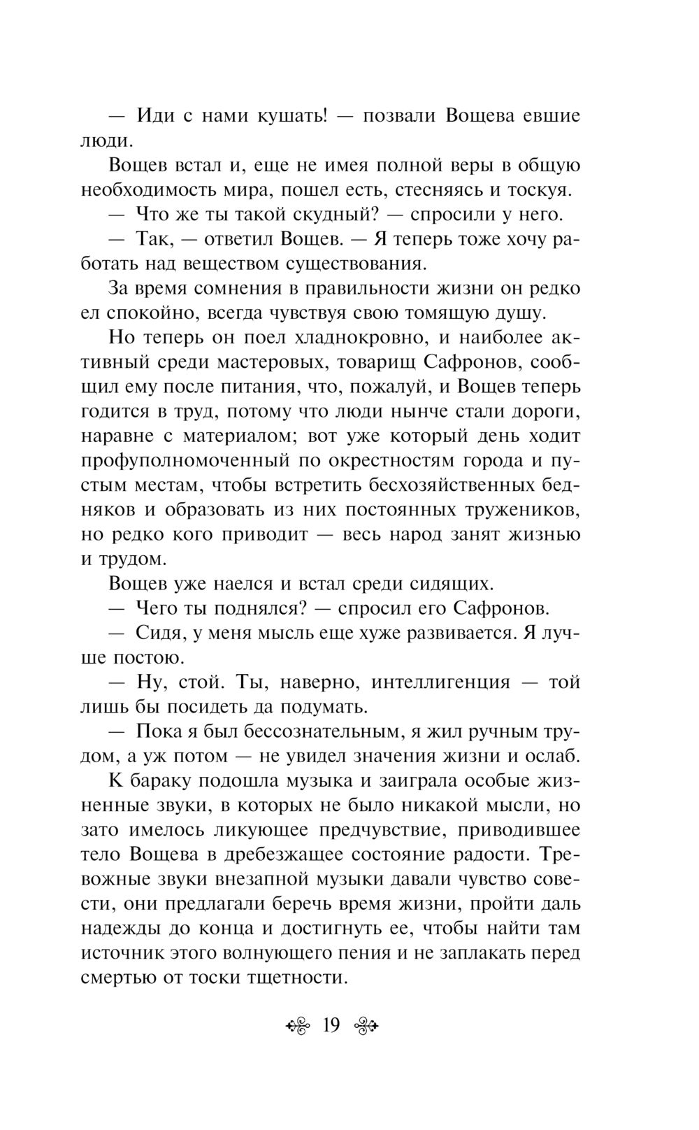 Тридцатилетнего рабочего Вощева увольняют с завода из-за "роста слабосильности в нем и задумчивости". Стремясь познать истину и узнать устройство мира, он попадает в соседний город на стройку "общепролетарского дома", который должен стать началом города "счастливого будущего".