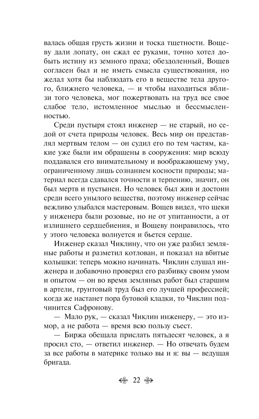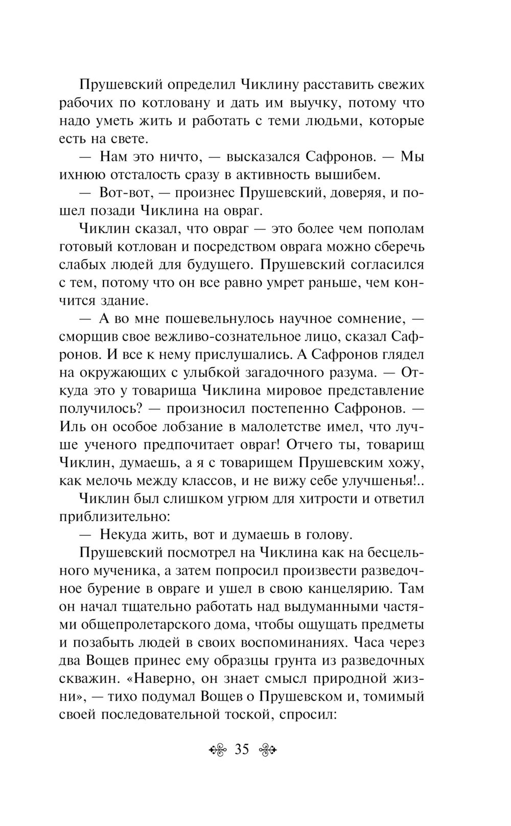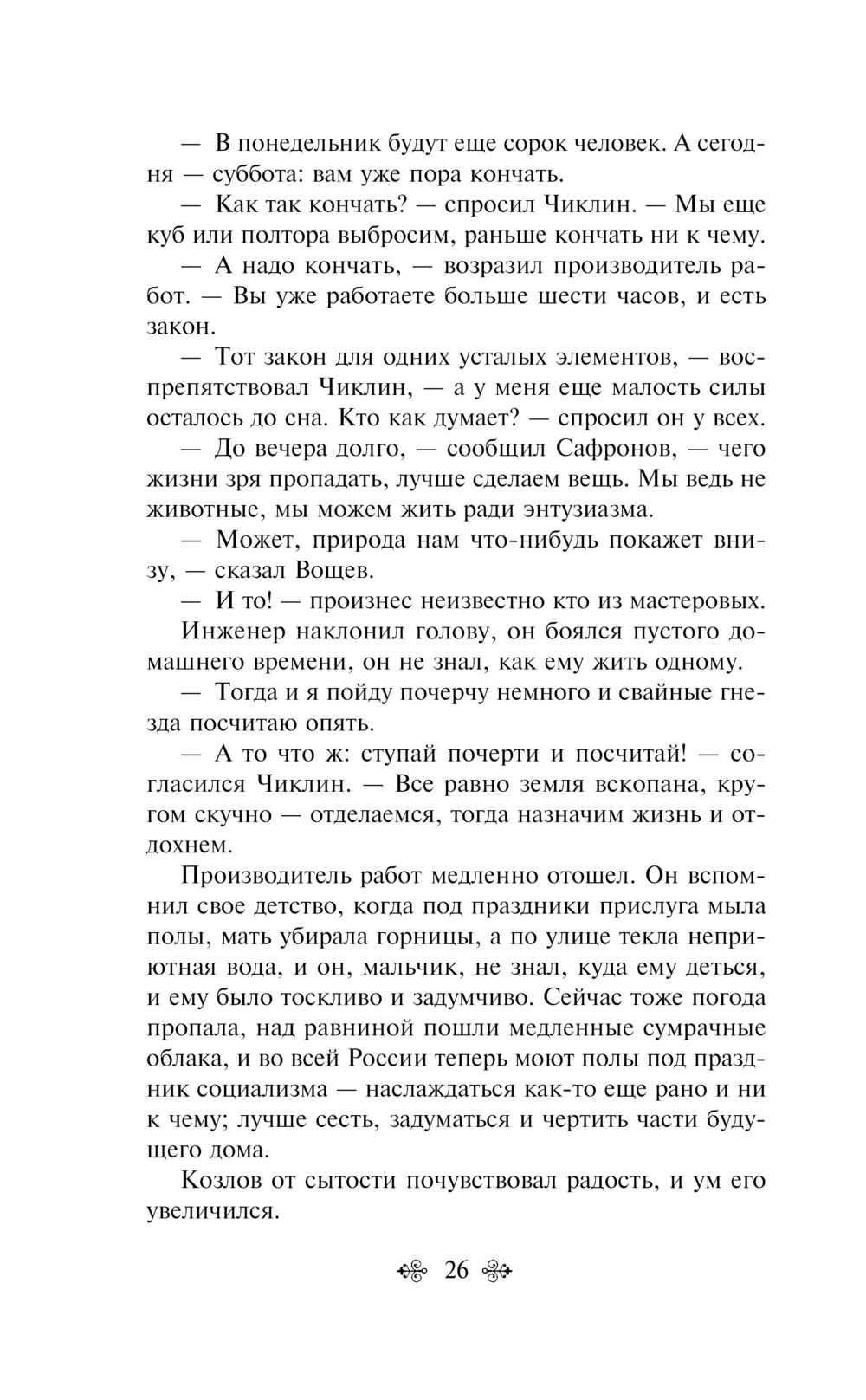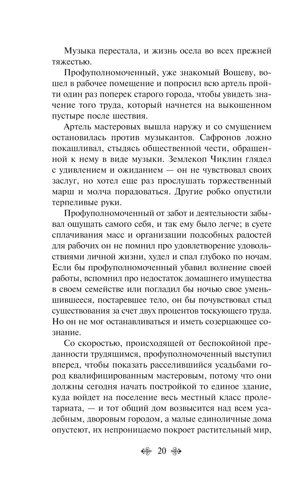 Тридцатилетнего рабочего Вощева увольняют с завода из-за "роста слабосильности в нем и задумчивости". Стремясь познать истину и узнать устройство мира, он попадает в соседний город на стройку "общепролетарского дома", который должен стать началом города "счастливого будущего".
