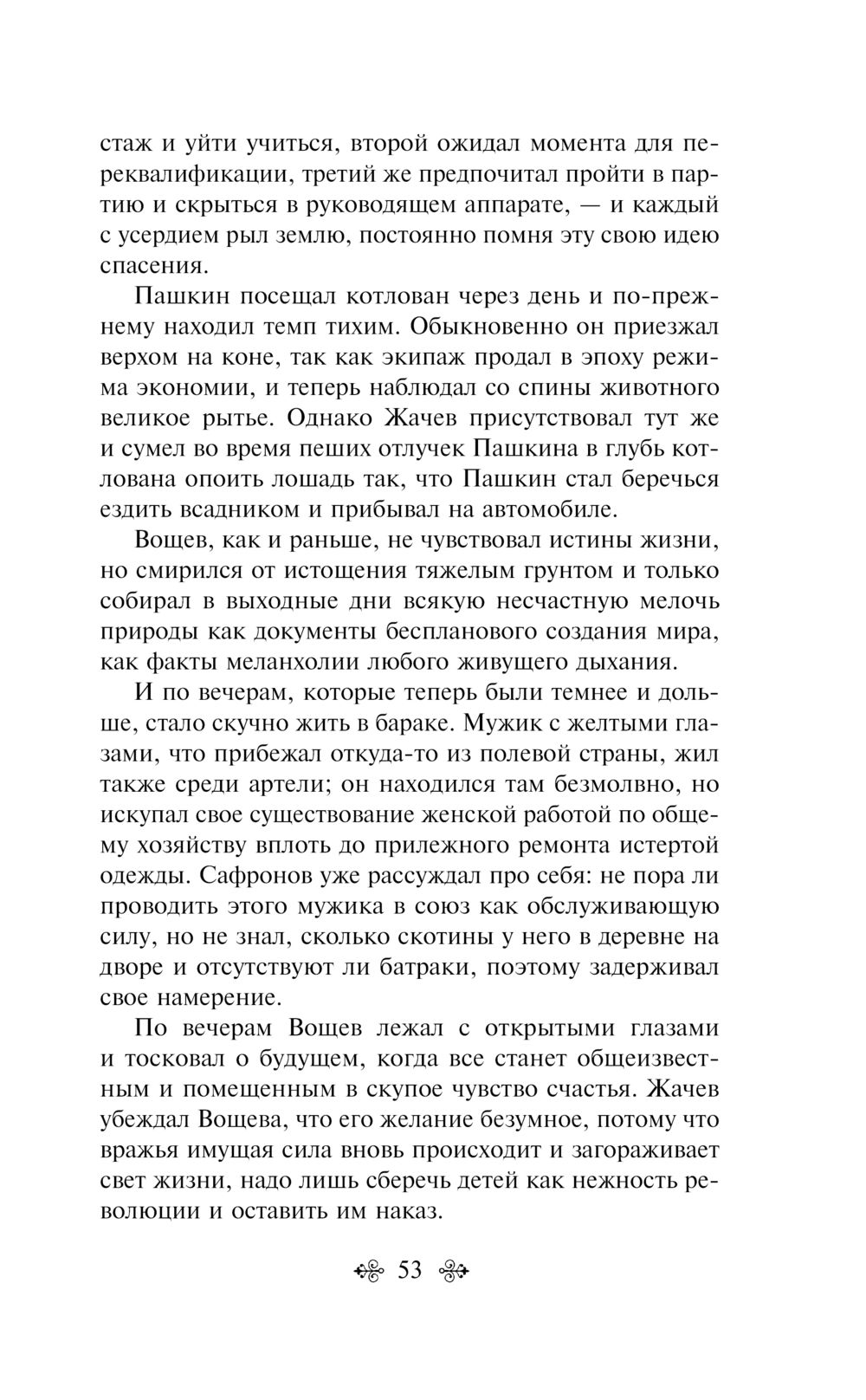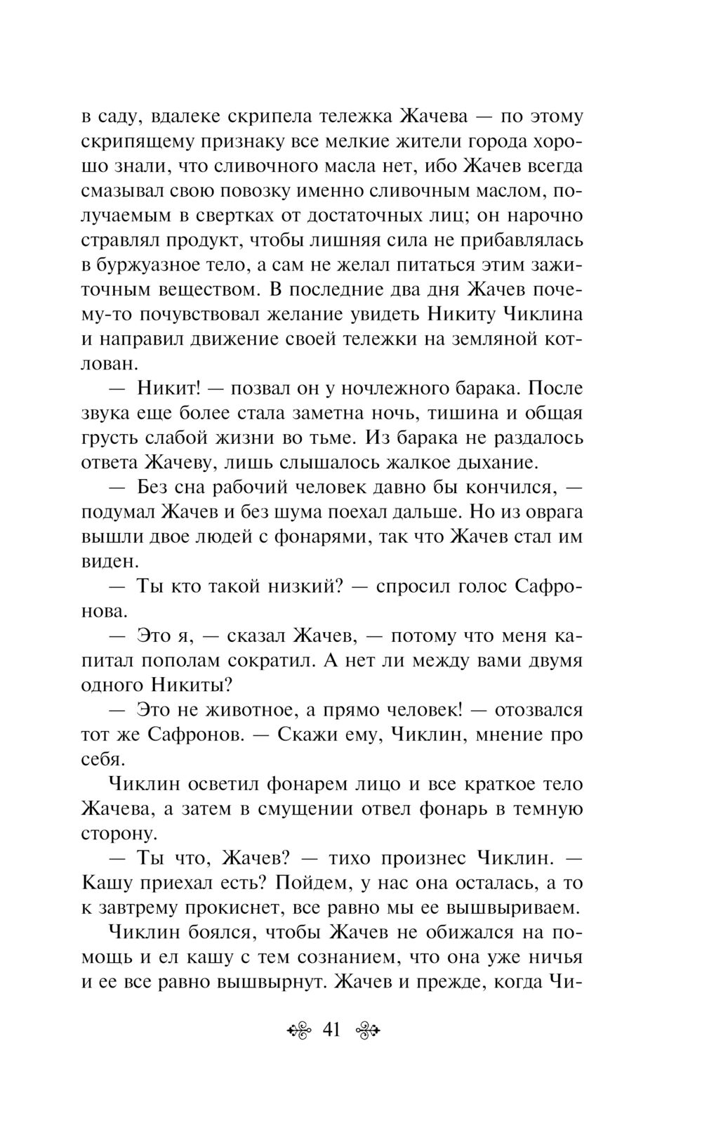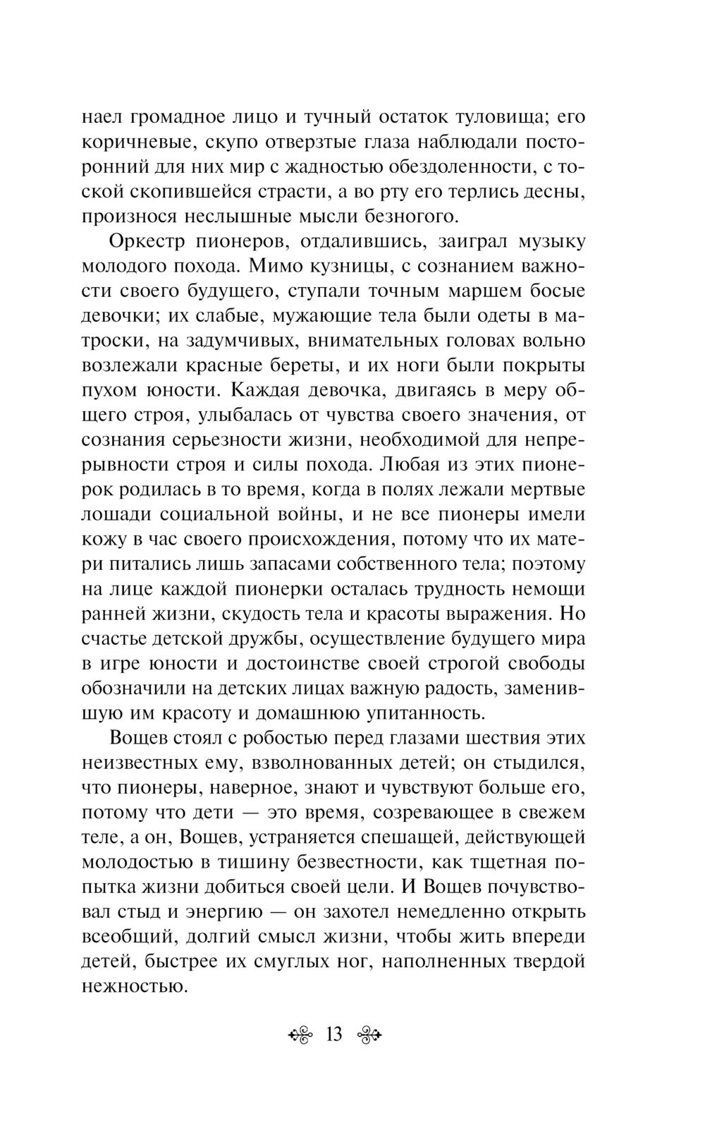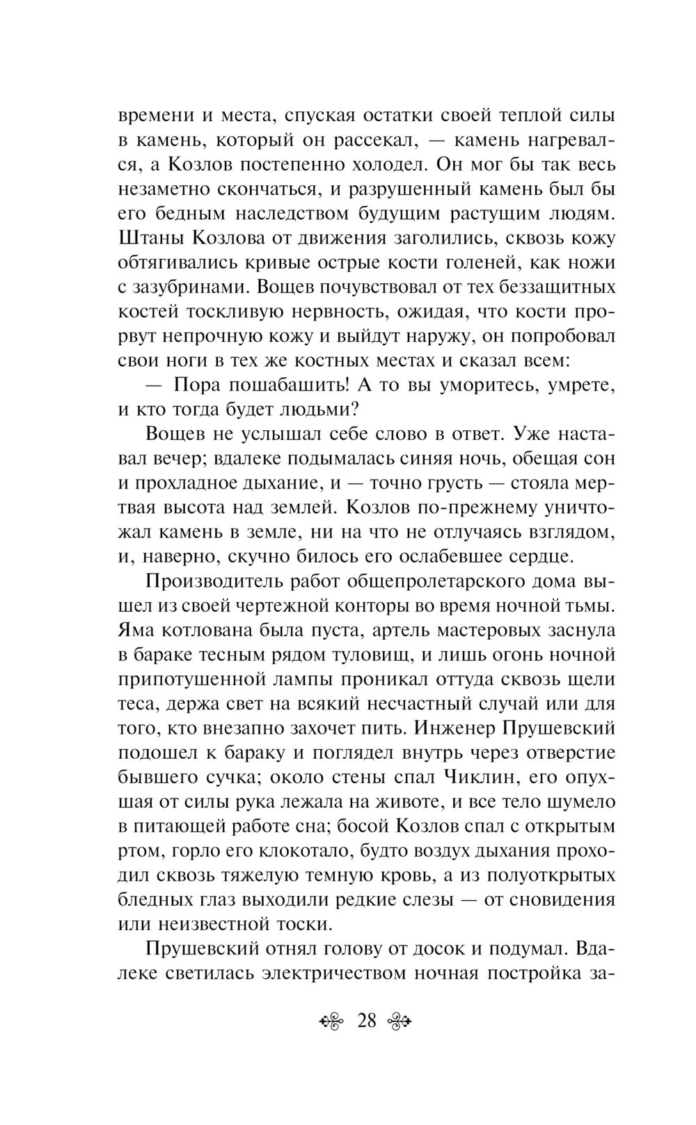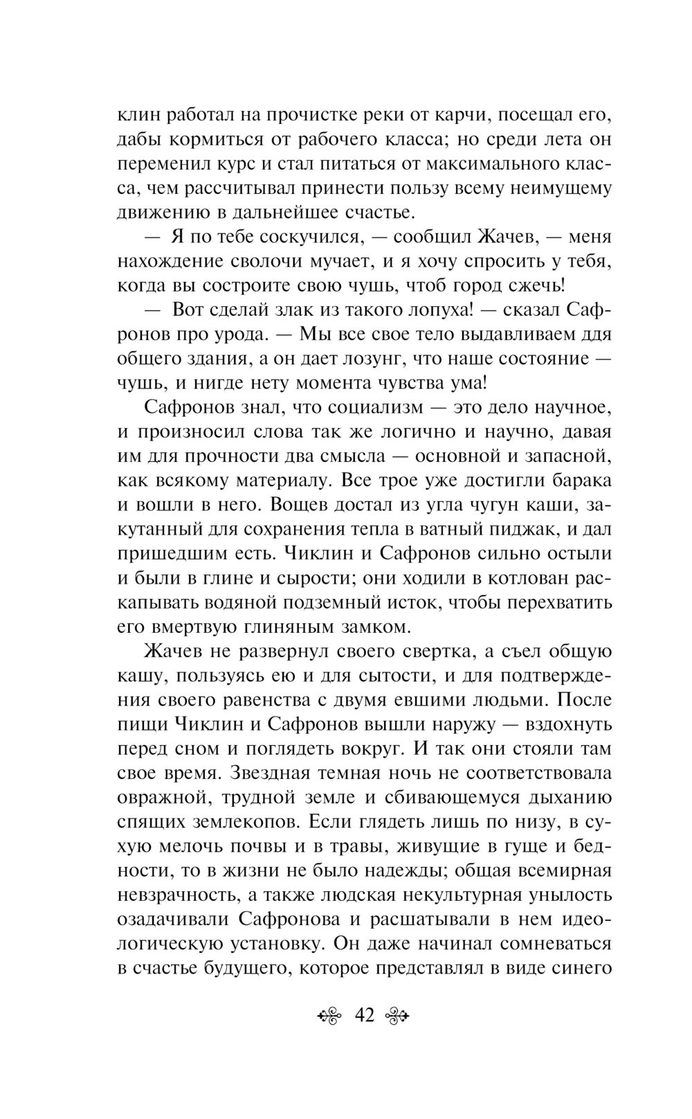 Тридцатилетнего рабочего Вощева увольняют с завода из-за "роста слабосильности в нем и задумчивости". Стремясь познать истину и узнать устройство мира, он попадает в соседний город на стройку "общепролетарского дома", который должен стать началом города "счастливого будущего".