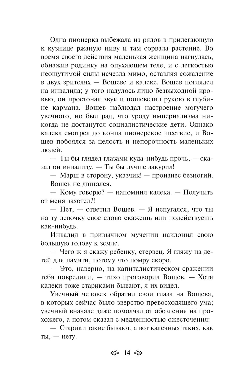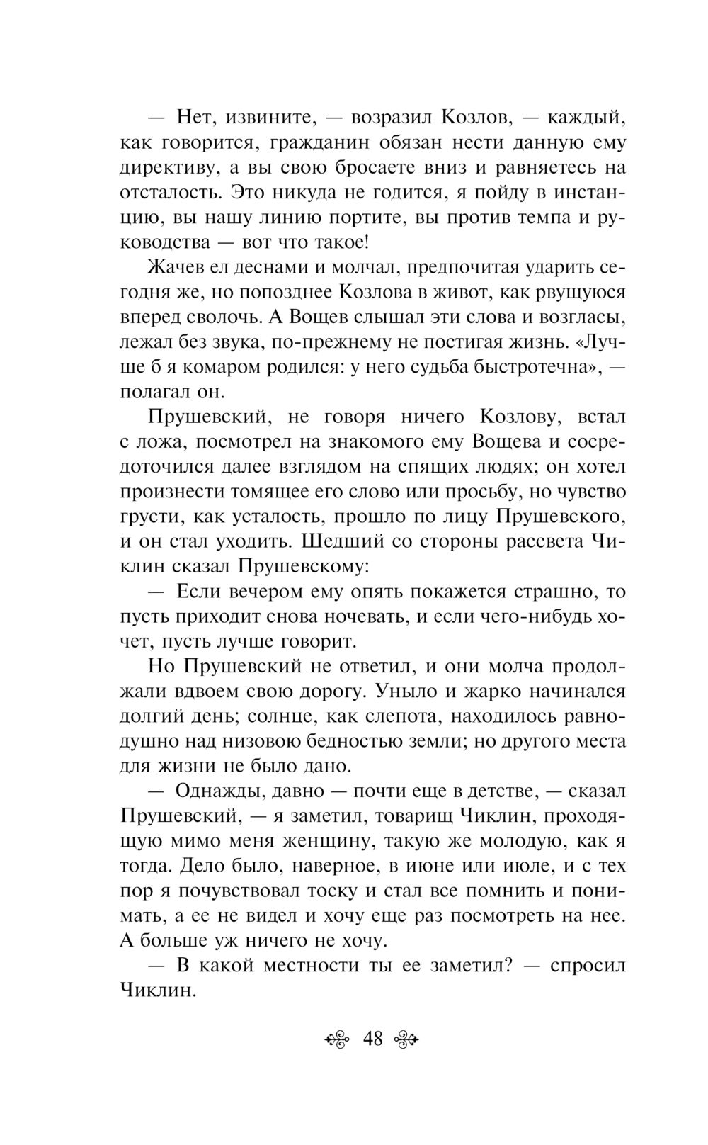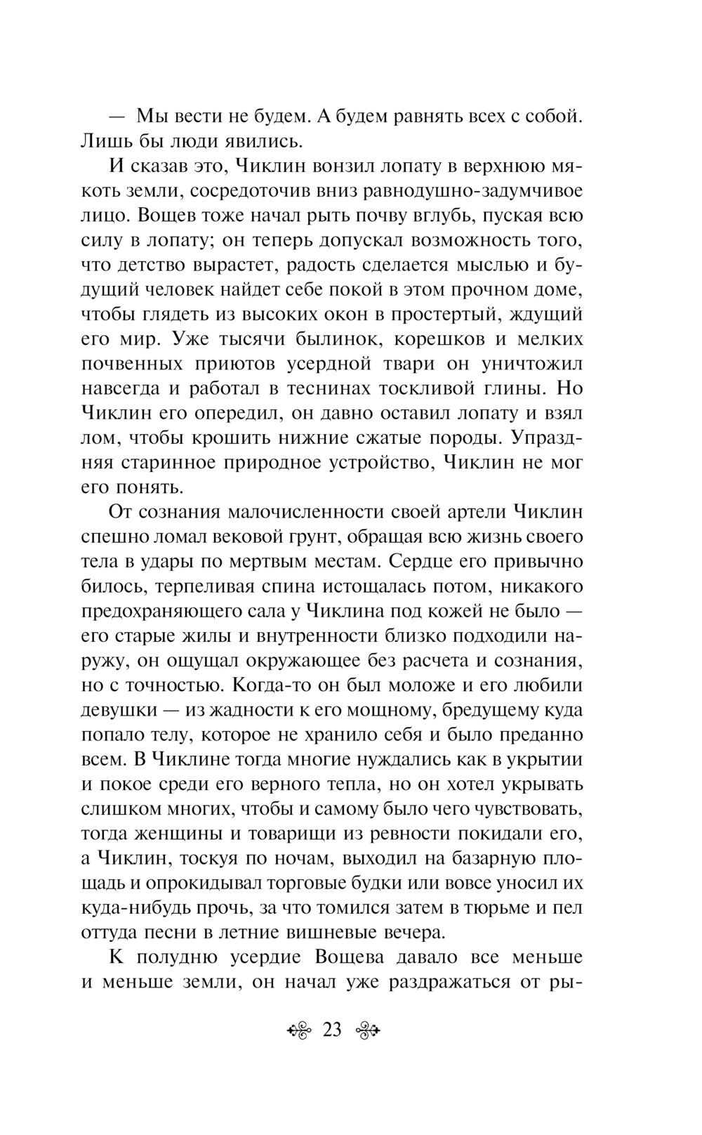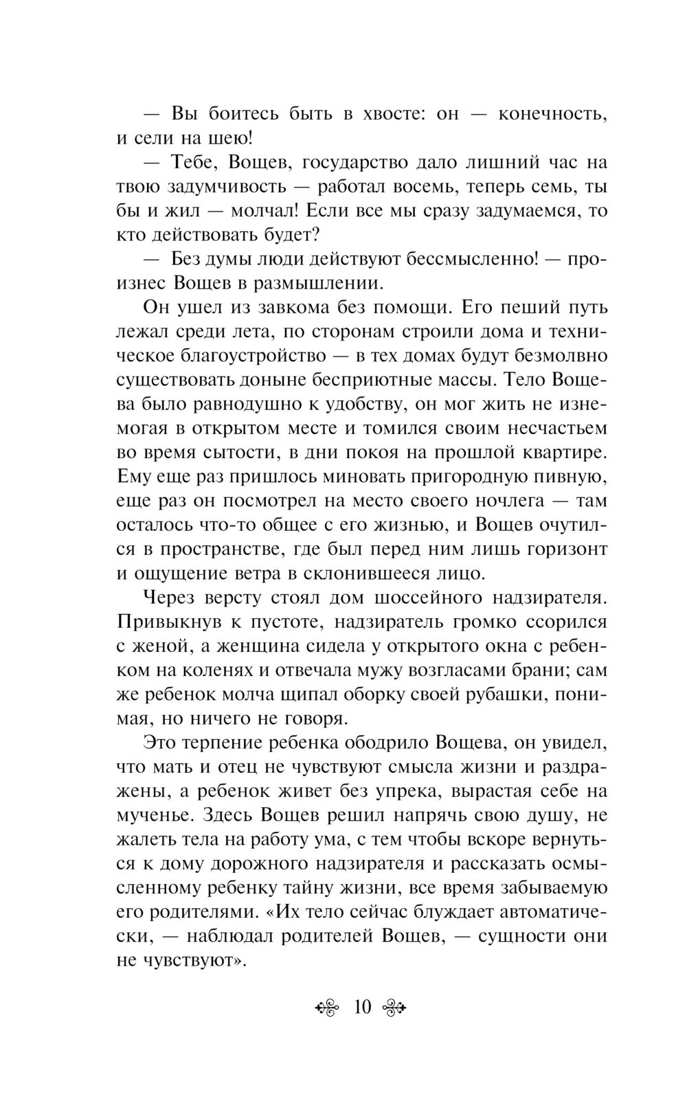 Тридцатилетнего рабочего Вощева увольняют с завода из-за "роста слабосильности в нем и задумчивости". Стремясь познать истину и узнать устройство мира, он попадает в соседний город на стройку "общепролетарского дома", который должен стать началом города "счастливого будущего".