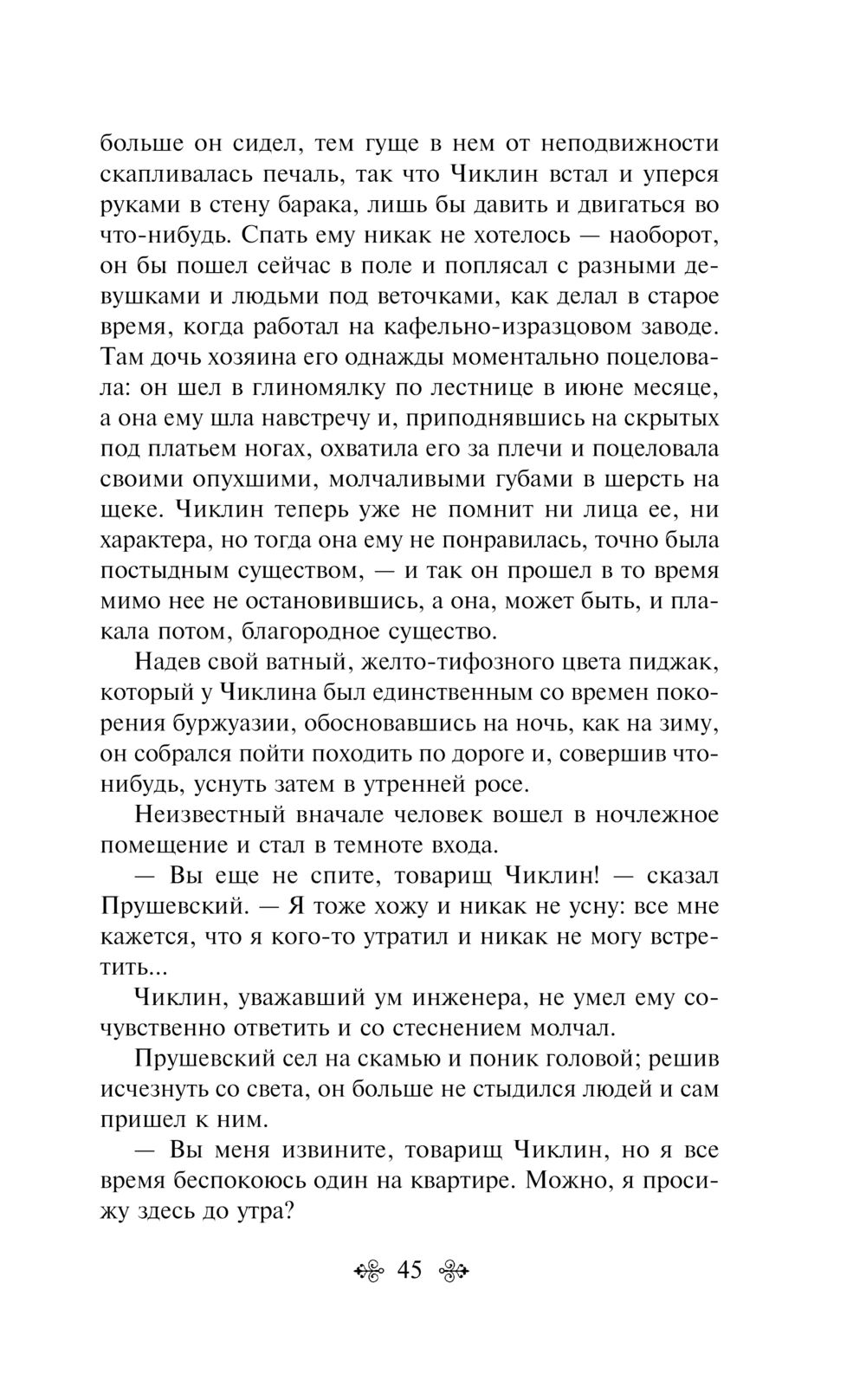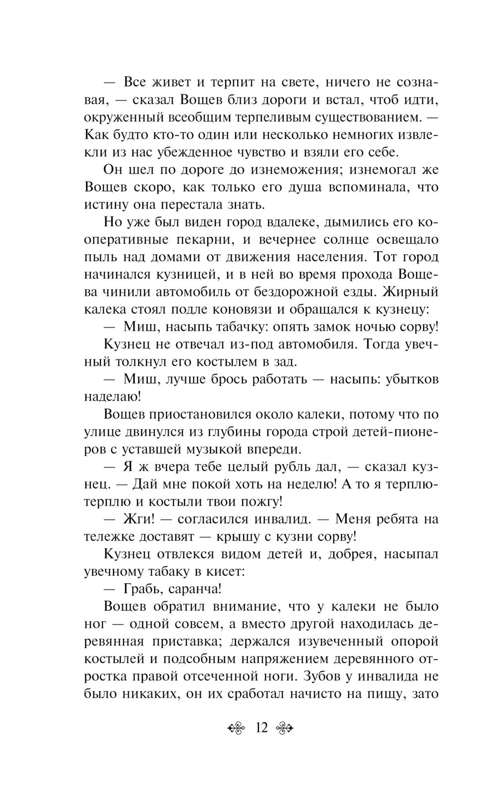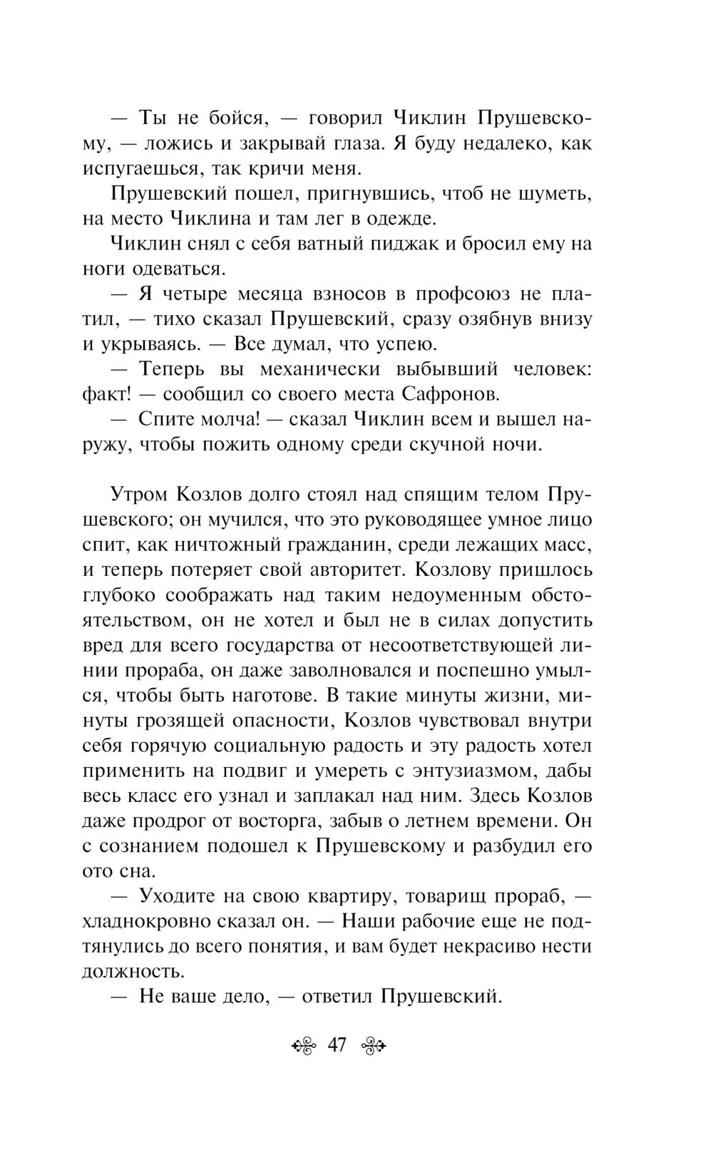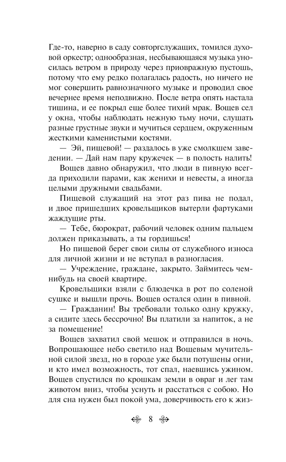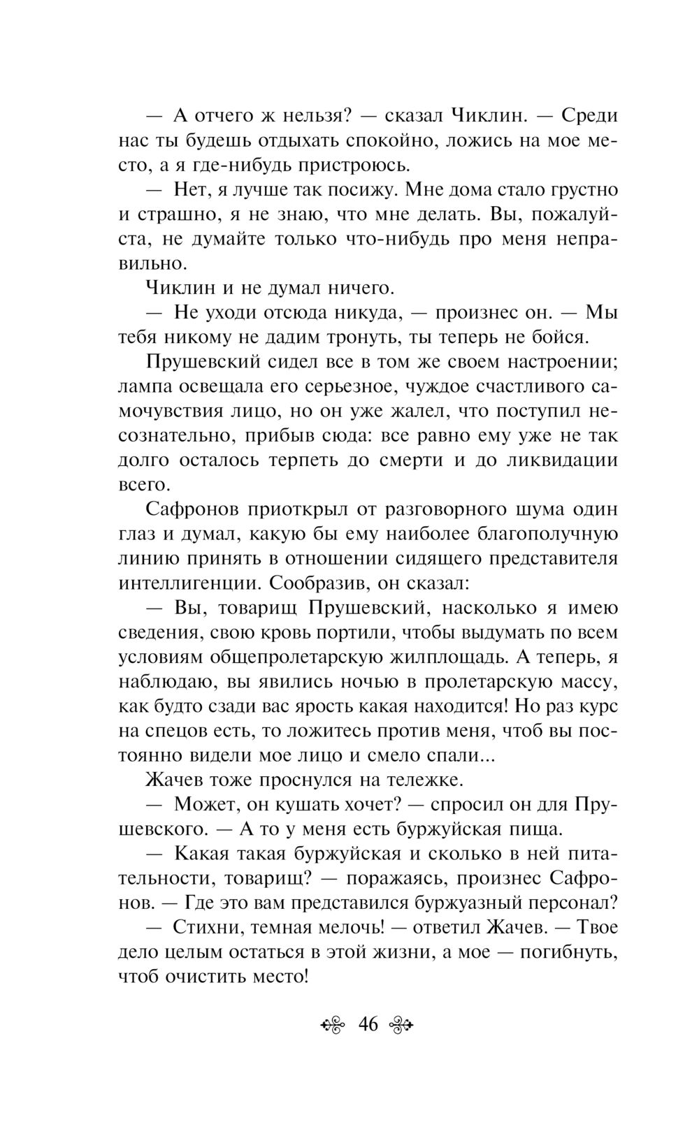 Тридцатилетнего рабочего Вощева увольняют с завода из-за "роста слабосильности в нем и задумчивости". Стремясь познать истину и узнать устройство мира, он попадает в соседний город на стройку "общепролетарского дома", который должен стать началом города "счастливого будущего".