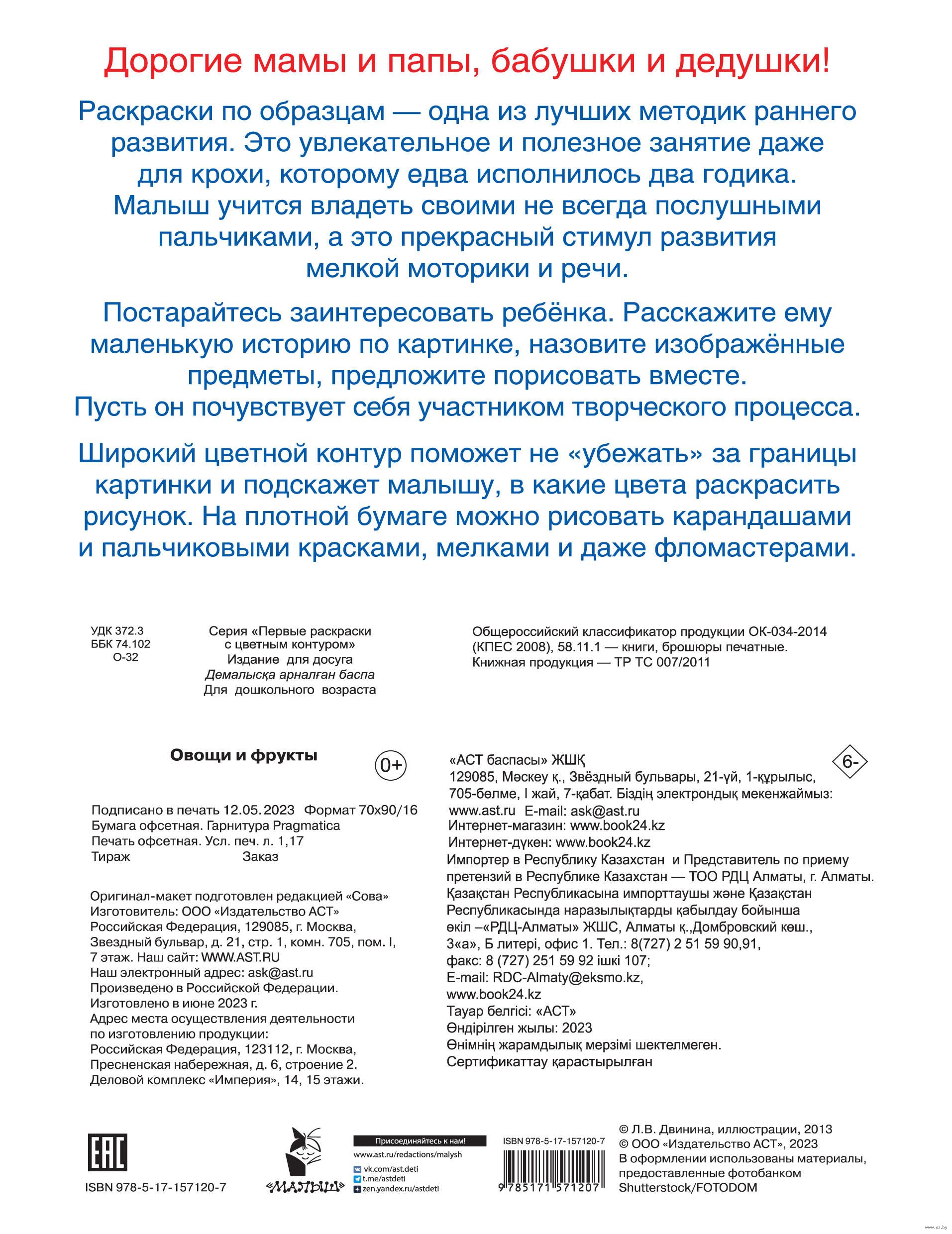 Развивающая раскраска "Овощи и фрукты" – прекрасный подарок для маленьких художников, которые только учатся держать в руке карандаш или фломастер. Это крупные картинки с широким цветным контуром и образцами для раскрашивания. Малыш разовьёт мелкую моторику и координацию движений руки, зрительное восприятие и внимание.