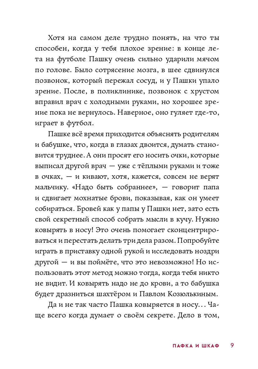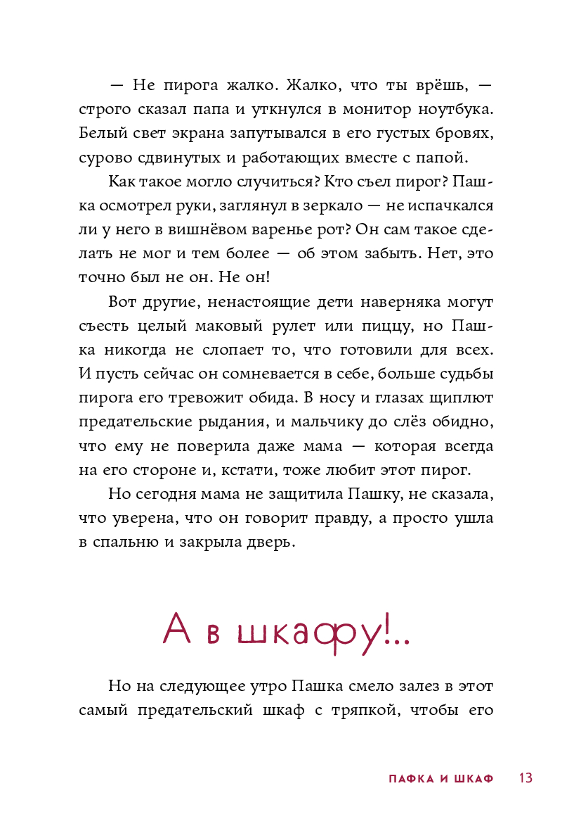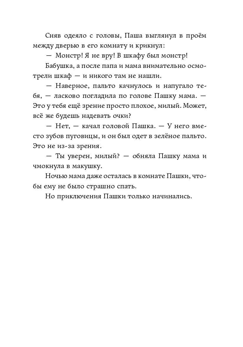Знакомьтесь, это Пашка. Он ходит в третий класс, учится на четвёрки, играет в футбол, выбрасывает мусор и ходит с папой за продуктами. А ещё у Пашки есть тайна! Только он знает, что в старом шкафу живёт чудище! Да-да, настоящий монстр: лохматый, цветастый, с зубами-пуговицами. И хотя родители думают, что это Пашка в одиночку съел целый вишнёвый пирог и устроил катастрофу на кухне, затопив соседей, мальчик знает правду – это проделки чудища из шкафа!