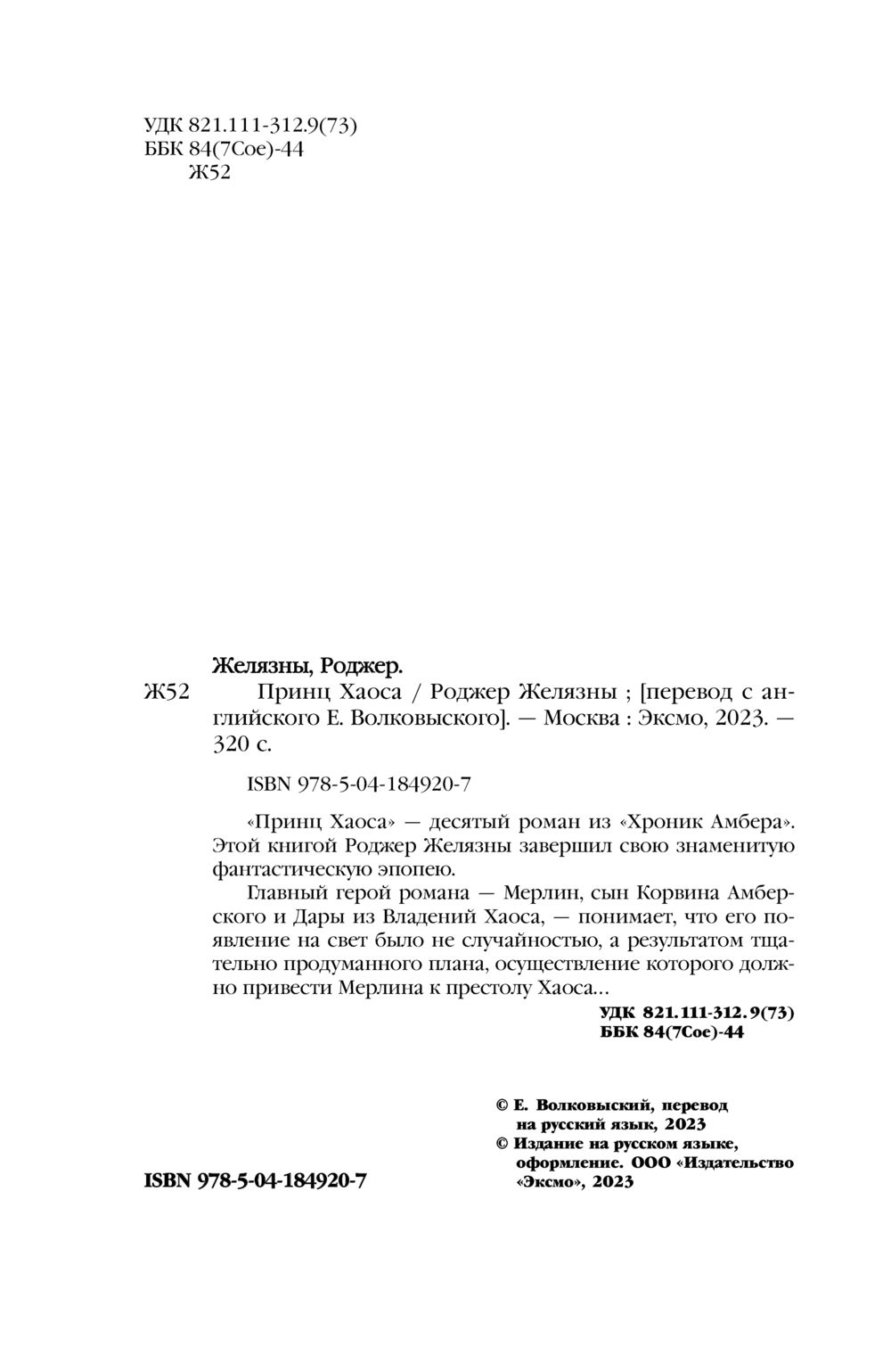 "Принц Хаоса" – десятый роман "Пятикнижия Мерлина" и "Хроник Амбера". Этой книгой Роджер Желязны завершил свою знаменитую фантастическую эпопею.