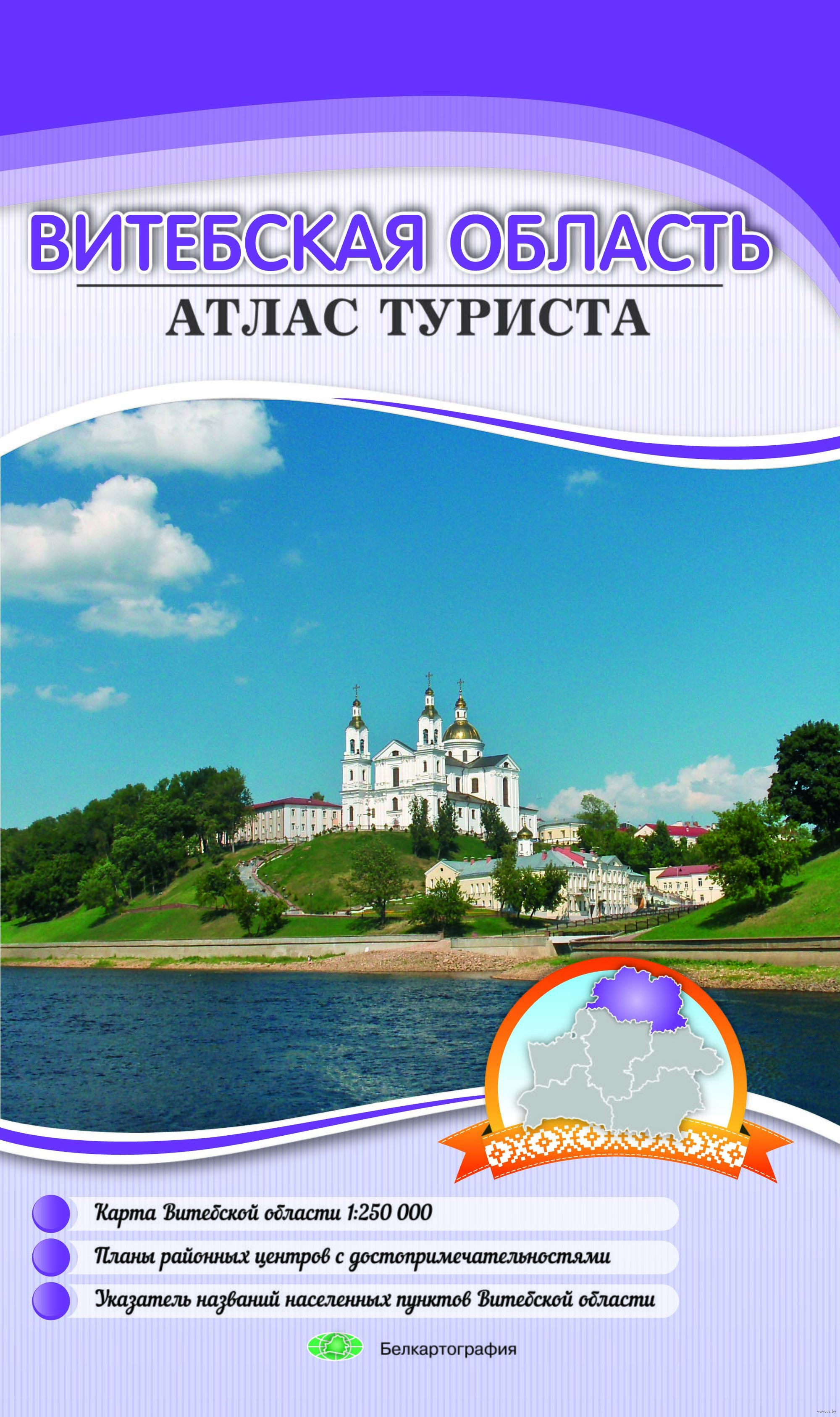 Карта Витебской области 1:250000. Планы районных центров с достопримечательностями, указатель названий населенных пунктов Витебской области. В атласе можно найти: справочную информацию, схему размещения плана города, указатель маршрутов городского транспорта, некоторые переименования, основные достопримечательности города.