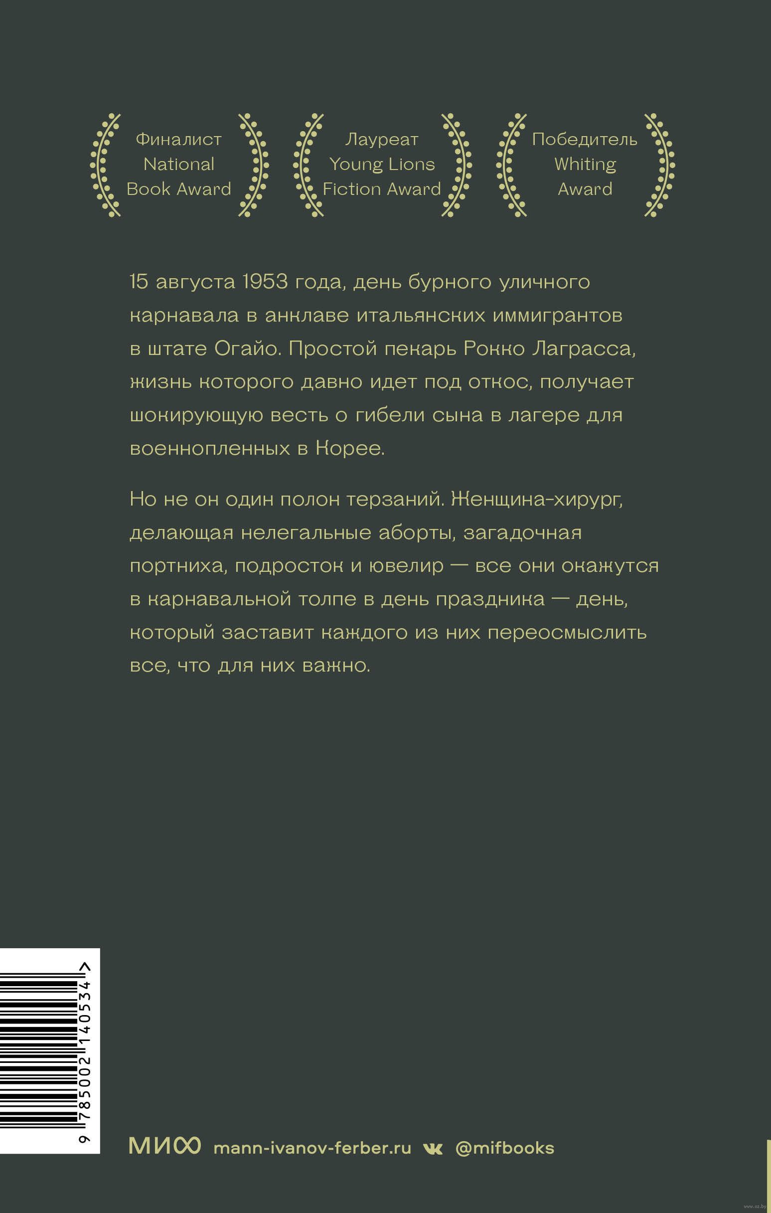15 августа 1953 года – день бурного уличного карнавала в анклаве итальянских иммигрантов в штате Огайо. Простой пекарь Рокко Лаграсса, жизнь которого давно идет под откос, получает шокирующую весть о гибели сына в лагере для военнопленных в Корее. Но не он один полон терзаний. Женщина-хирург, делающая нелегальные аборты, загадочная портниха, подросток и ювелир – все они окажутся в карнавальной толпе в день праздника – день, который заставит каждого из них переосмыслить все, что для них важно.