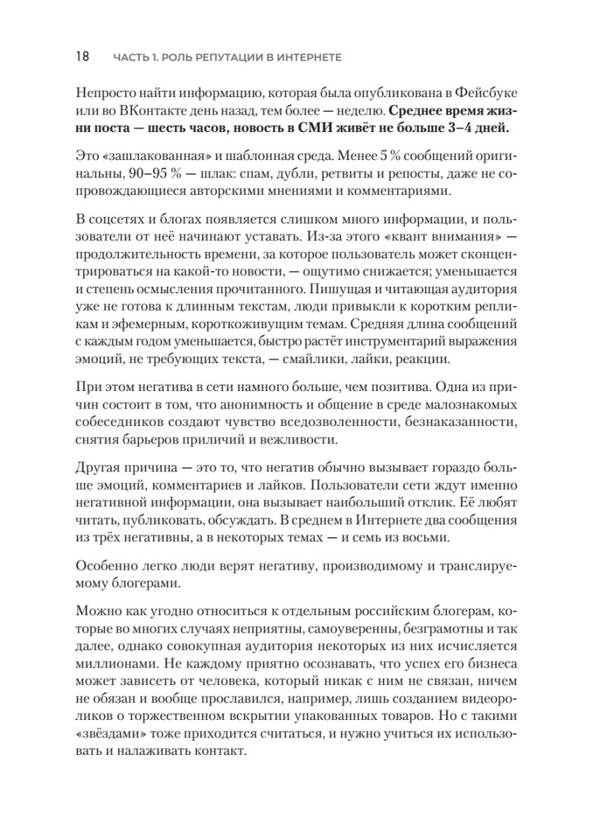 А законы эти существуют, они уже осмыслены и исчислены, ими можно пользоваться для продвижения бизнеса, управления репутацией, усиления влияния и роста продаж. Управление репутацией не магия, не квантовая физика, это эффективное ремесло. В книге описаны основные принципы, приёмы и секреты этого ремесла, так что она будет не только интересна читателю, но и принесёт практическую пользу.