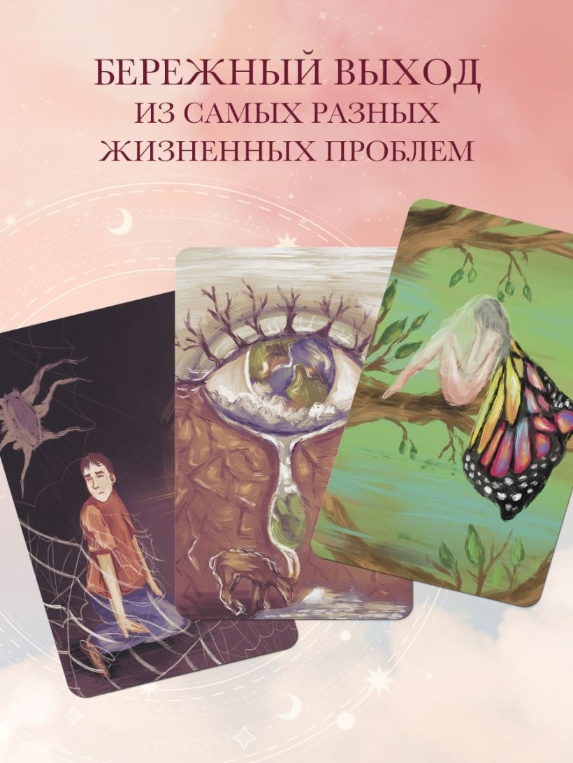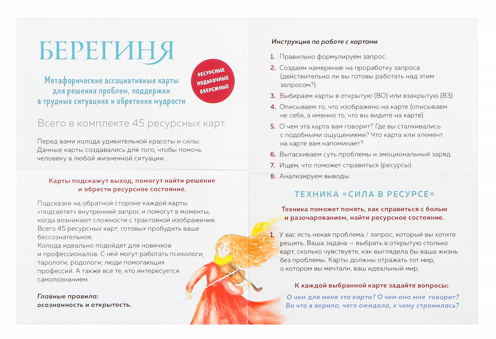 В комплекте к коробочке с картами, покрытой нежной пленкой soft touch, идет подробная инструкция, которая содержит техники "Сила в ресурсе" (для бережного решения самых разных жизненных проблем) и "Выход из травматического состояния" (вы побываете в лабиринте, который охраняет коварное чудовище, и сможете избавиться от травмы, причиняющей боль).