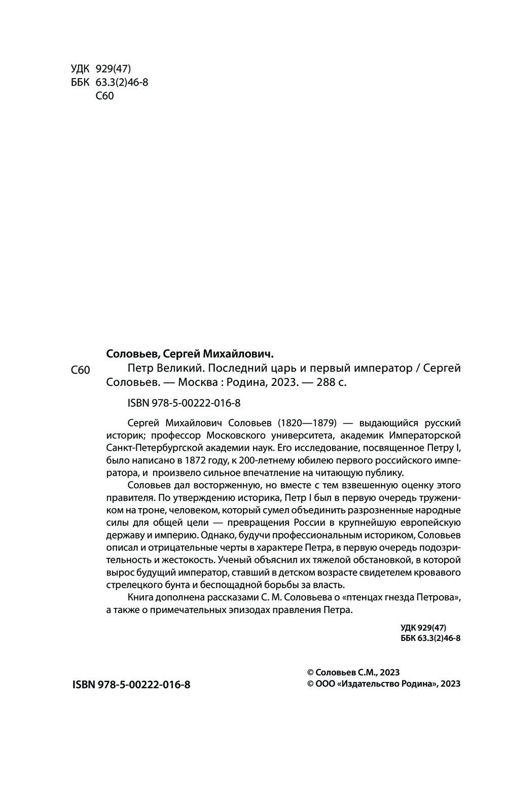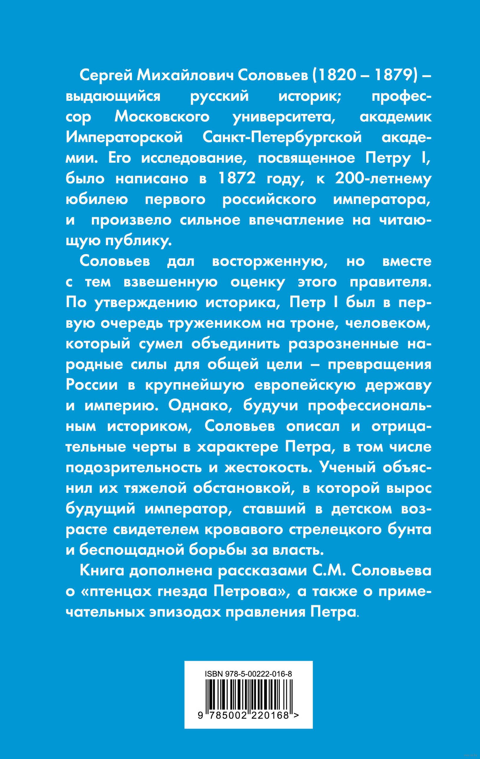 Сергей Михайлович Соловьев (1820-1879) – выдающийся русский историк; профессор Московского университета, академик Императорской Санкт-Петербургской Академии. Его исследование, посвященное Петру I, было написано в 1872 году, к 200-летнему юбилею первого российского императора, и произвело сильное впечатление на читающую публику.