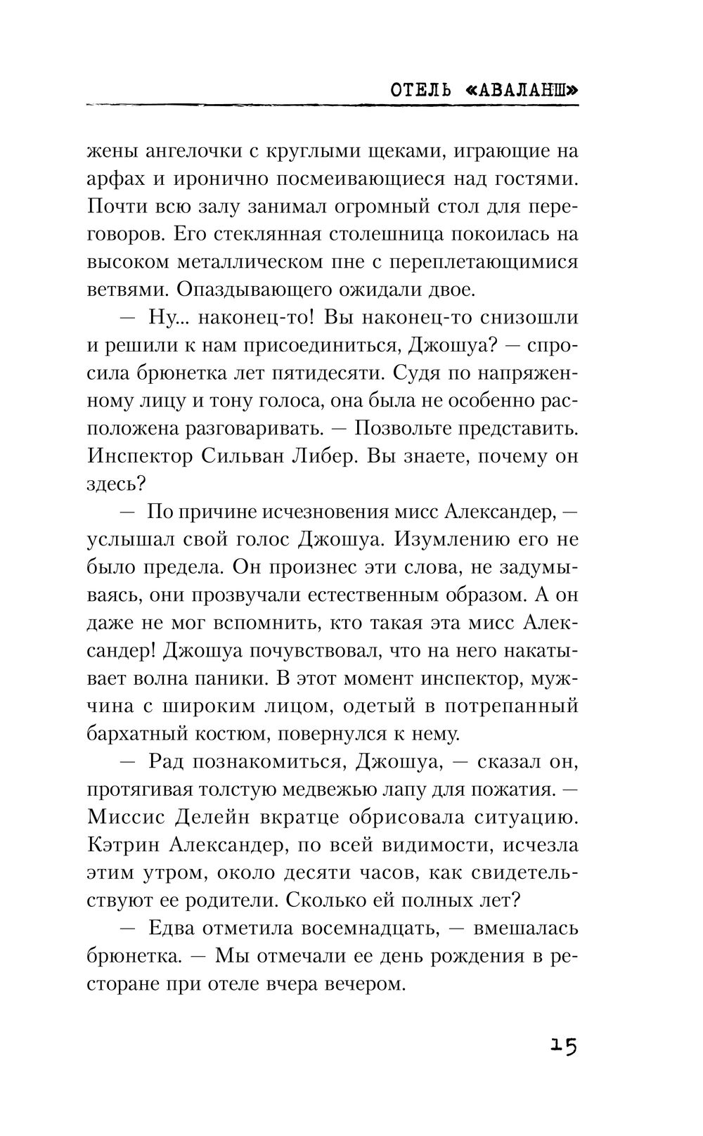 Январь 1980 года. Джошуа Оберон очнулся в отеле "Аваланш" в швейцарских Альпах. Он потерял память, но быстро выясняет, что он охранник и ему поручено расследовать исчезновение восемнадцатилетней девушки Кэтрин. Однако Джошуа не покидает странное чувство, будто что-то не так в окружающей обстановке. Навязчивый голос в голове предупреждает об опасности. Молчаливый бармен просит Джошуа следовать за ним в горы по важному делу, хотя начинается снежная буря. Джошуа так холодно, что он теряет сознание... и приходит в себя только в больничной палате. Мы не в 1980-м, а в 2018-м. Джошуа не охранник, он полицейский, а отель "Аваланш" давно закрыт. Между тем в снегу находят едва не замерзшую девушку, в кармане которой обнаружено фото пропавшей Кэтрин. Что произошло в том отеле много лет назад? Какие тайны скрывает незнакомка? И сможет ли Джошуа разобраться во всех этих необъяснимых событиях?