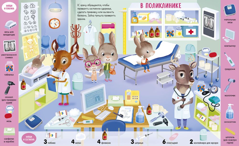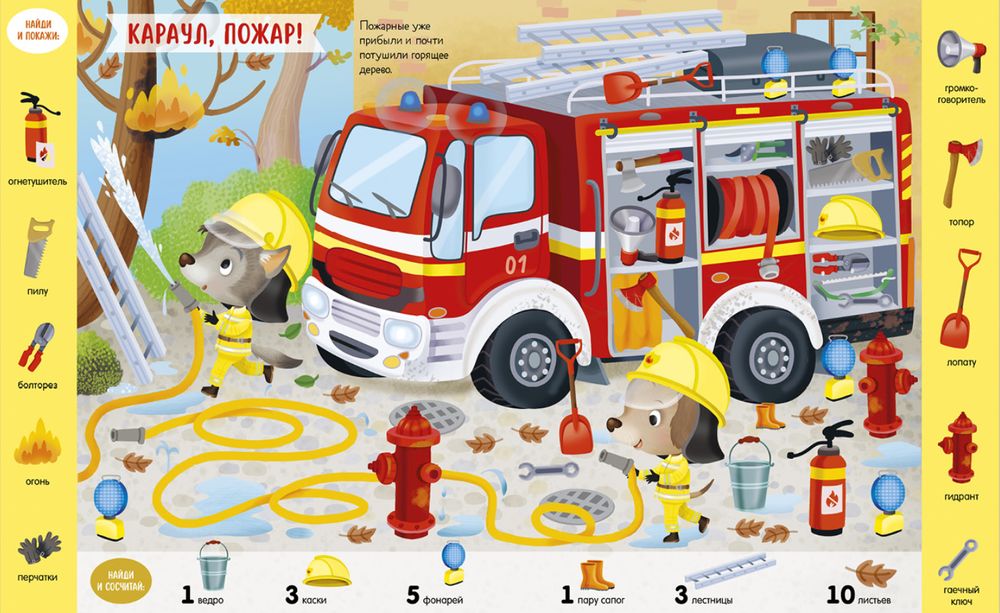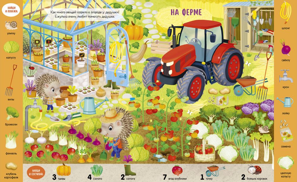 На красочных детальных иллюстрациях можно долго искать, находить и считать разные предметы и объекты: на стройке, в космосе, в детском саду и даже на концерте!
