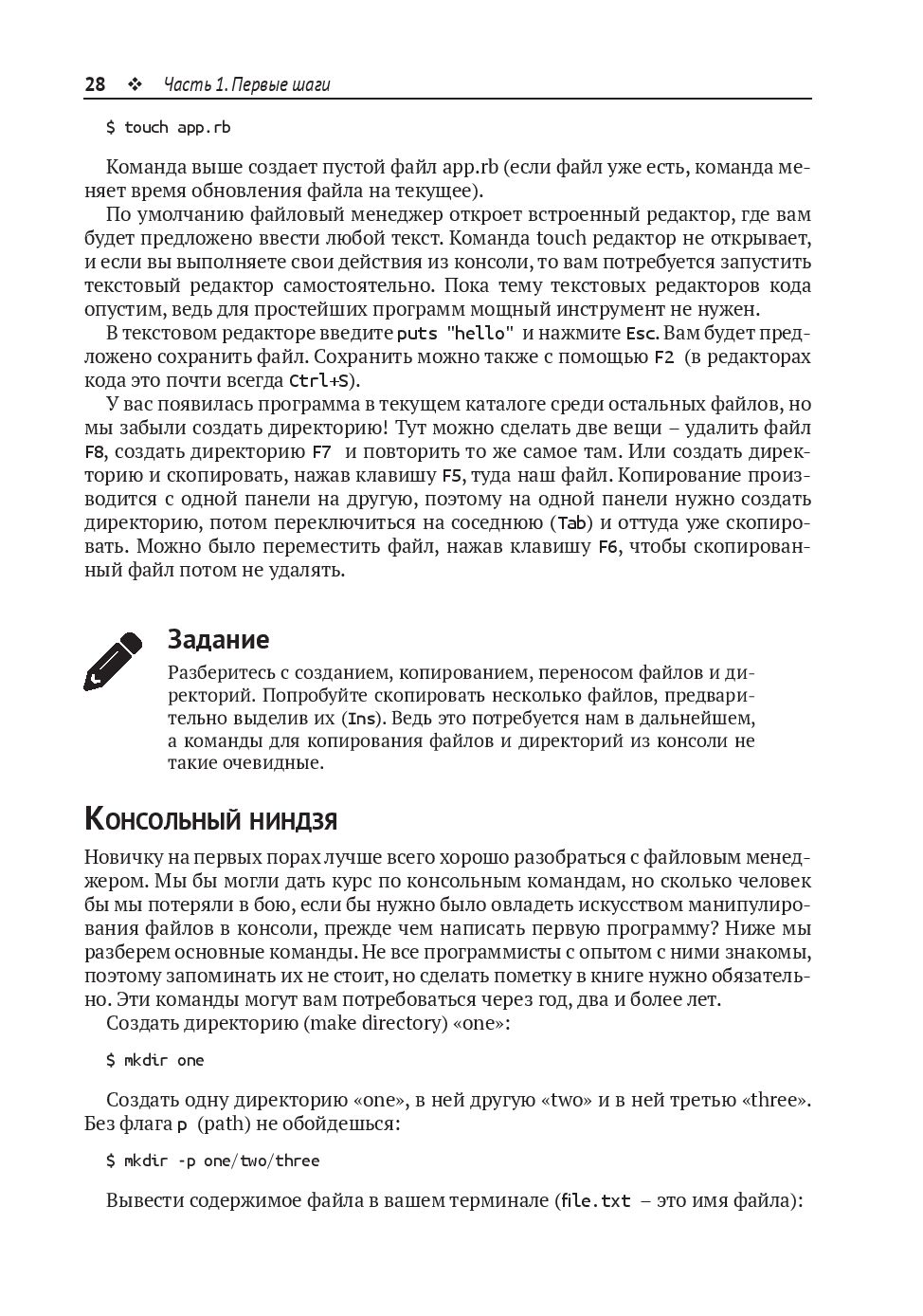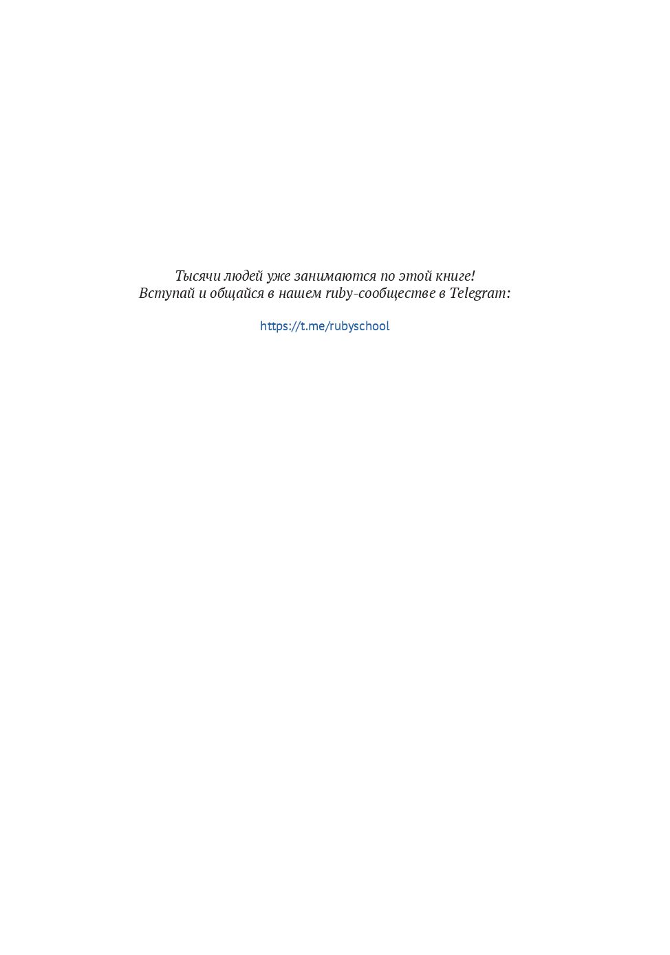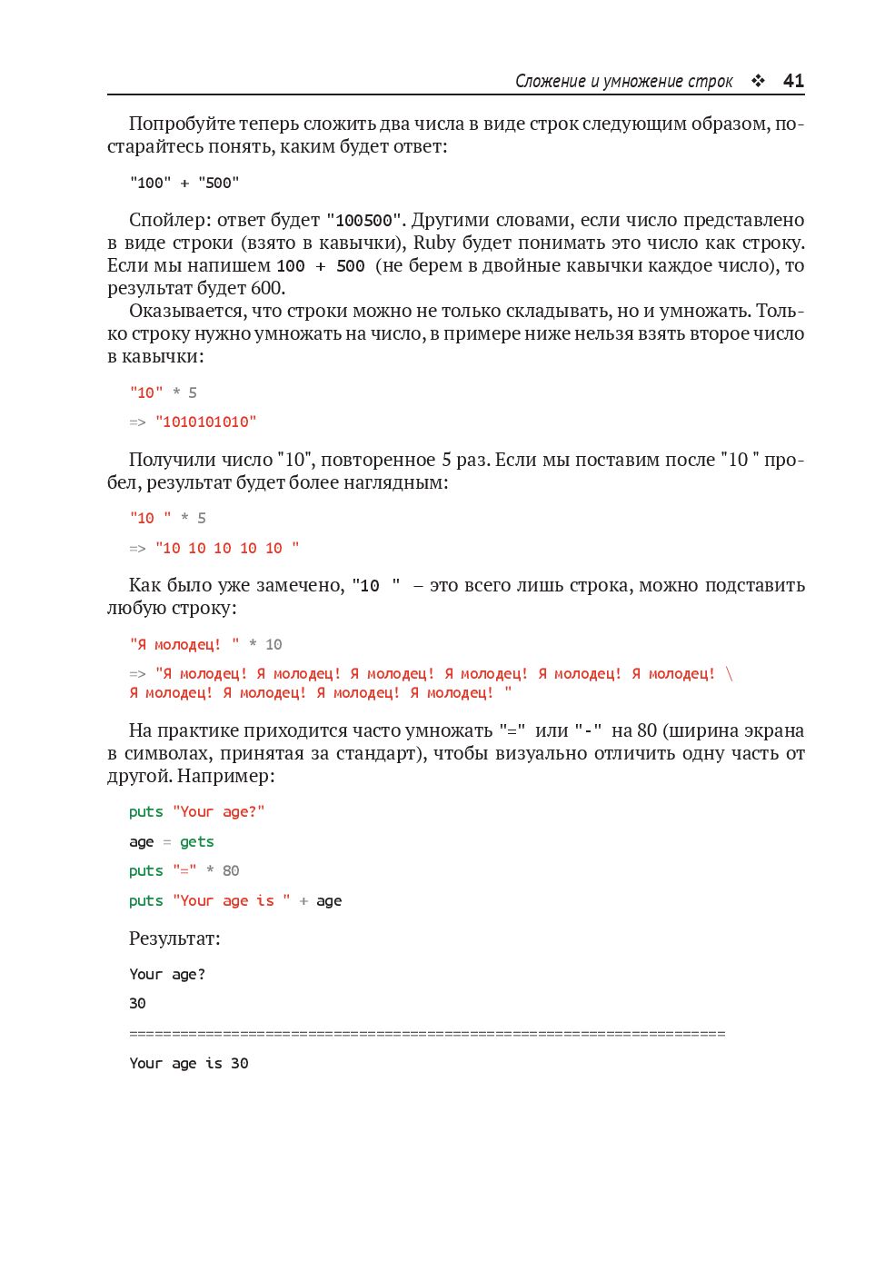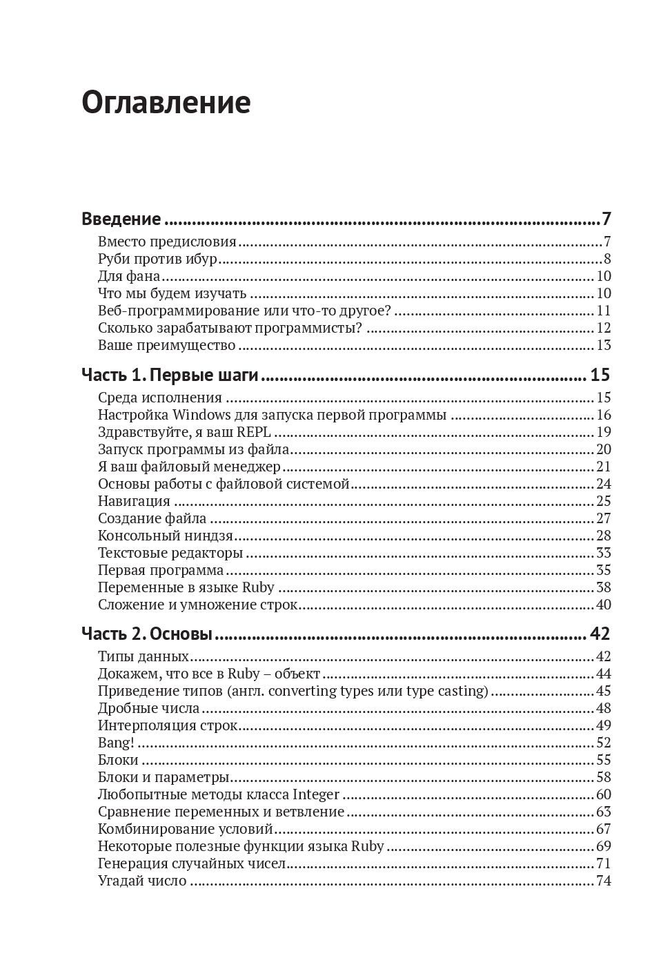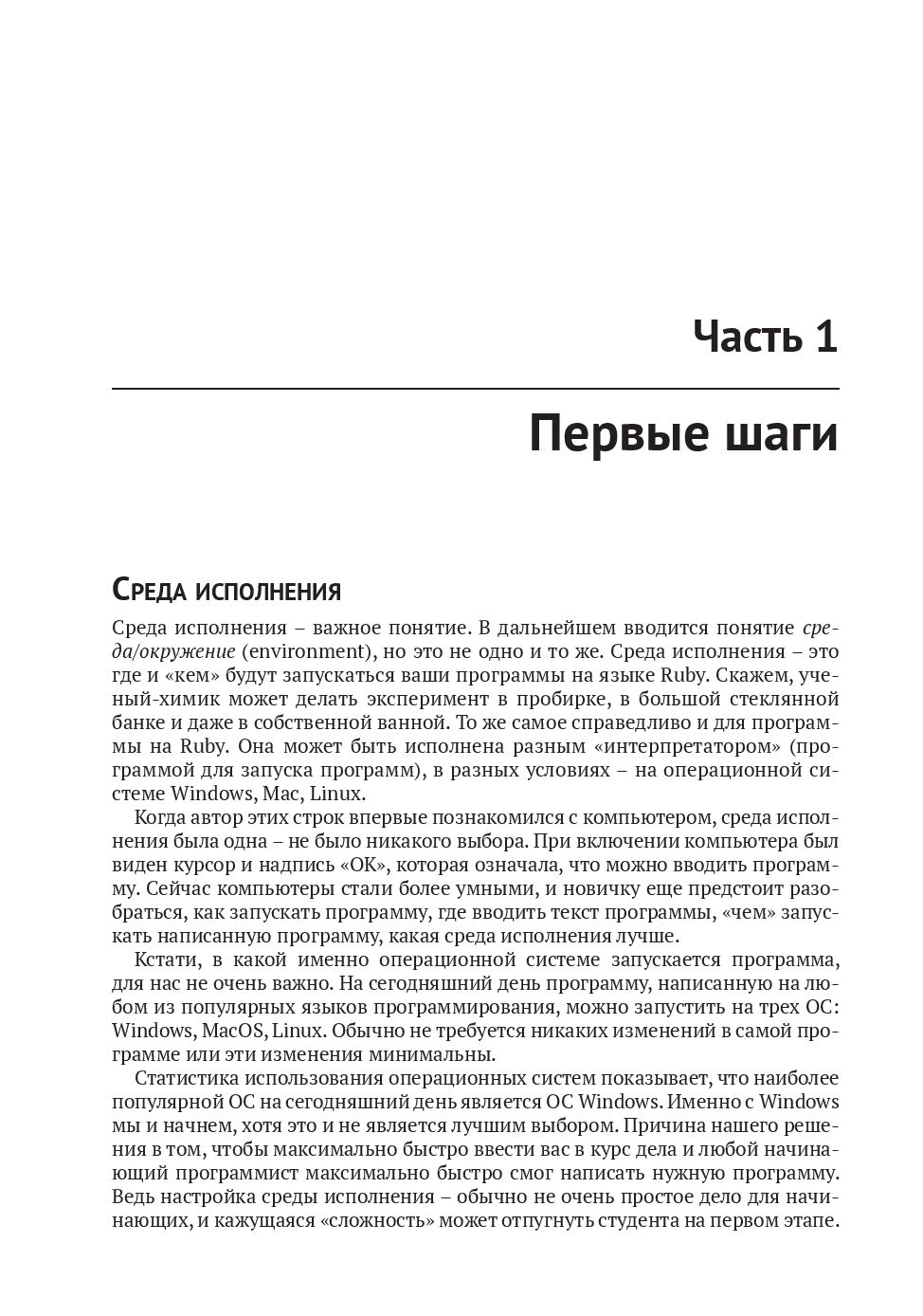 Перед вами книга для самостоятельного знакомства с основами языка Ruby для начинающих разработчиков любого возраста. Последовательное изложение материала позволит не только освоить тонкости языка в удобной игровой форме, но и заложить твердый фундамент для дальнейшего обучения. Многочисленные советы, хитрости и приемы основаны на более чем двадцатилетнем опыте работы автора в российских и зарубежных компаниях – для многих учеников эта книга стала первым шагом на пути смены карьеры. Упражнения и задания, а также многочисленные иллюстрации помогут во всех тонкостях освоить материал.