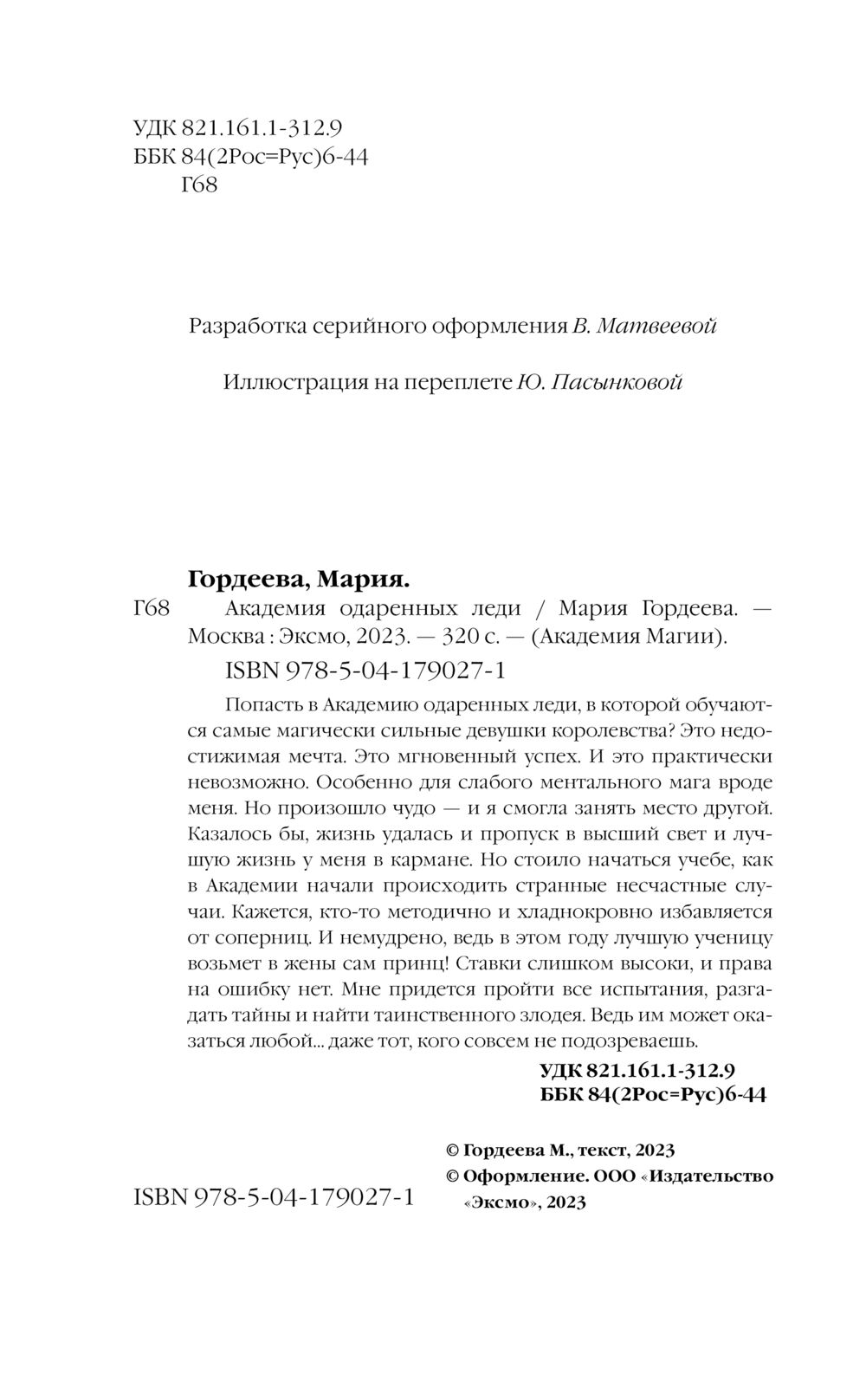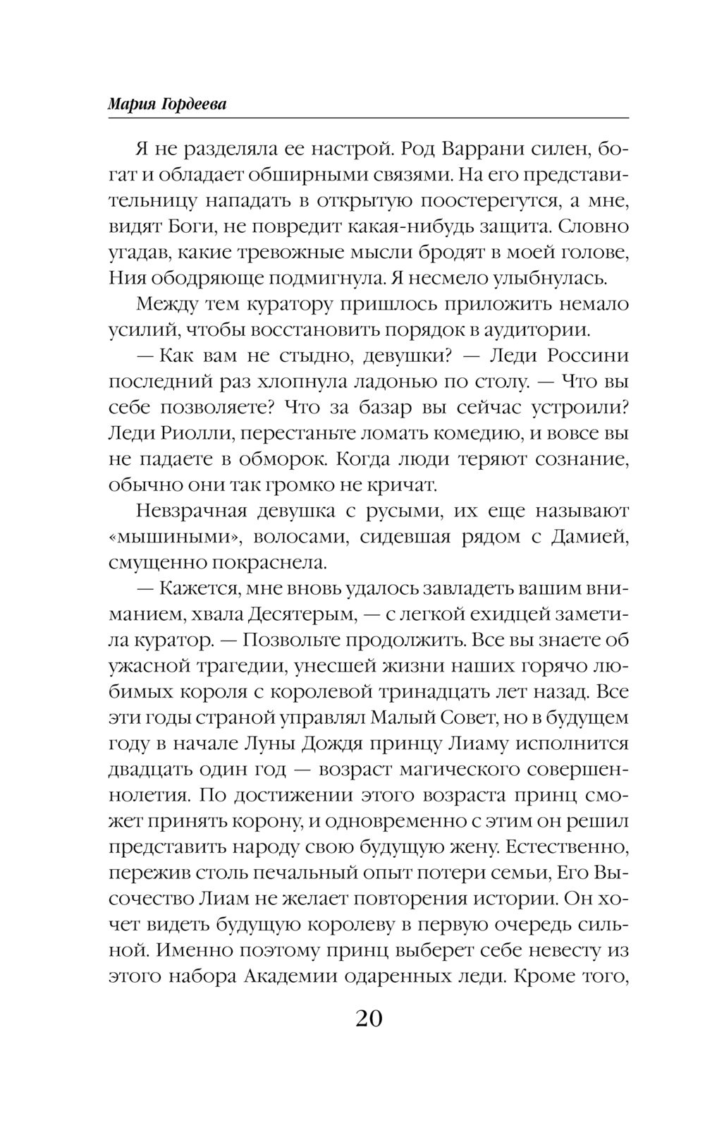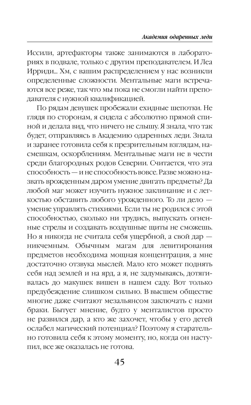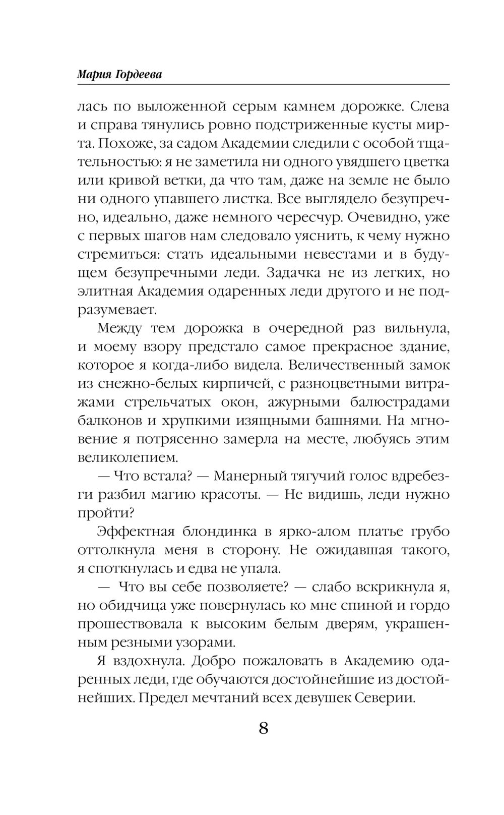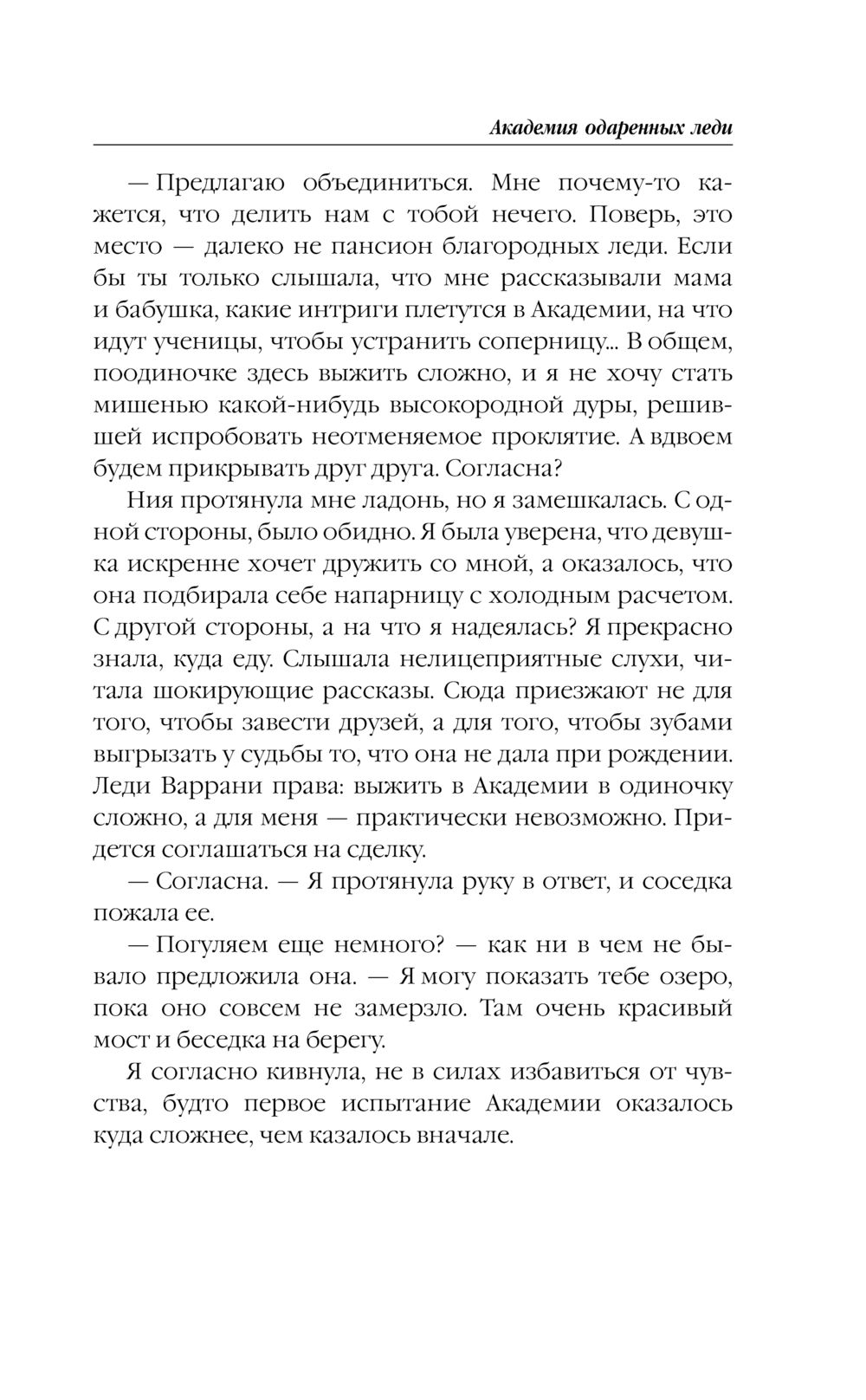 Попасть в Академию одаренных леди, в которой обучаются самые магически сильные девушки королевства? Это недостижимая мечта. Это мгновенный успех. И это практически невозможно. Особенно для слабого ментального мага вроде меня. Но произошло чудо – и я смогла занять место другой. Казалось бы, жизнь удалась, и пропуск в высший свет и лучшую жизнь у меня в кармане. Но стоило начаться учебе, как в Академии начали происходить странные несчастные случаи. Кажется, кто-то методично и хладнокровно избавляется от соперниц. И немудрено, ведь в этом году лучшую ученицу возьмет в жены сам принц! Ставки слишком высоки, и права на ошибку нет. Мне придется пройти все испытания, разгадать тайны и найти таинственного злодея. Ведь им может оказаться любой... даже тот, кого совсем не подозреваешь.