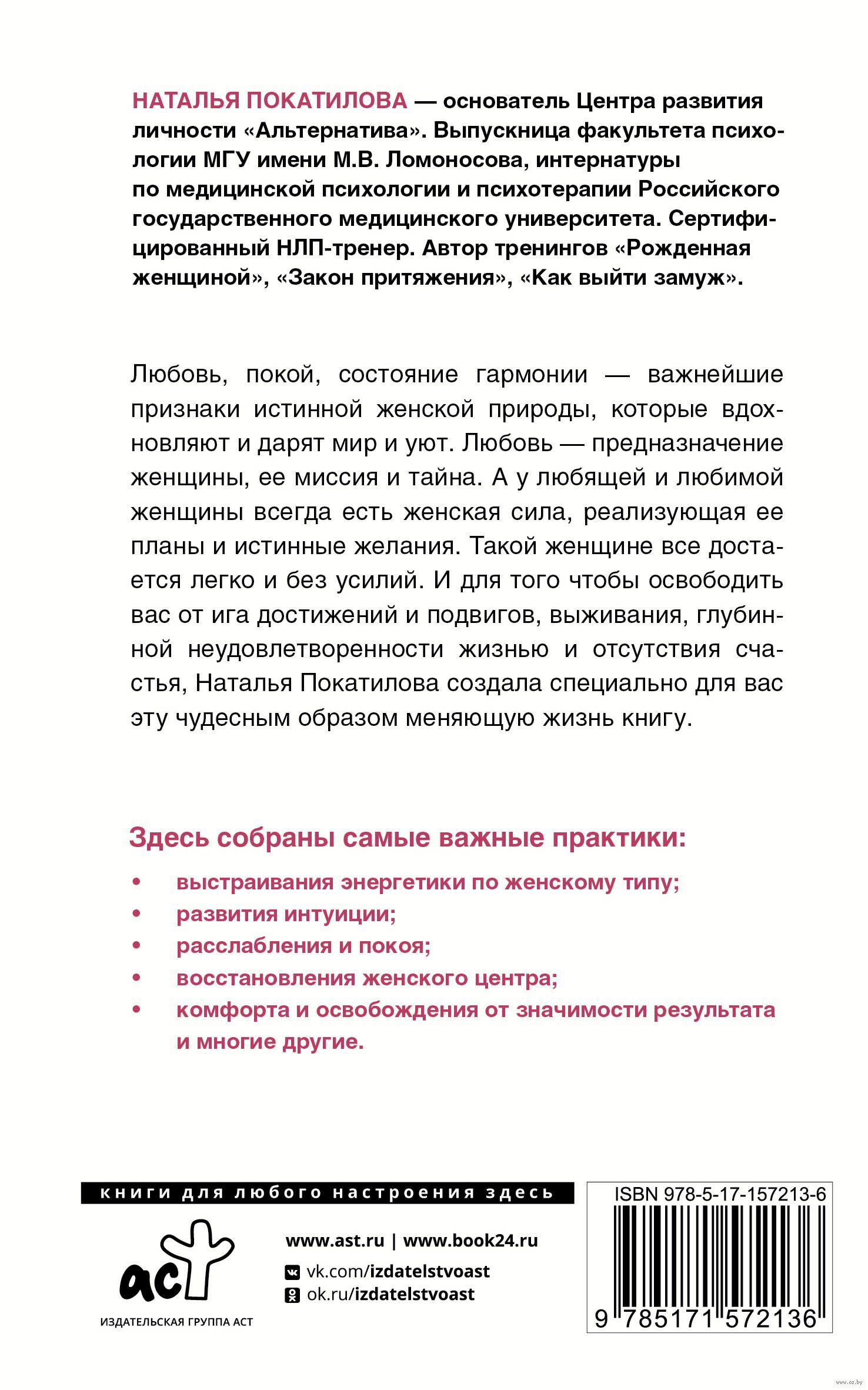 Любовь, покой, состояние гармонии – важнейшие признаки истинной женской природы, которые вдохновляют и дарят мир и уют. Любовь – предназначение женщины, ее миссия и тайна. А у любящей и любимой женщины всегда есть женская сила, реализующая ее планы и истинные желания. Такой женщине все достается легко и без усилий. И для того чтобы освободить вас от ига достижений и подвигов, выживания, глубинной неудовлетворенности жизнью и отсутствия счастья, Наталья Покатилова создала специально для вас эту чудесным образом меняющую жизнь книгу "Рожденная желать. Женская сила в реализации желаний".