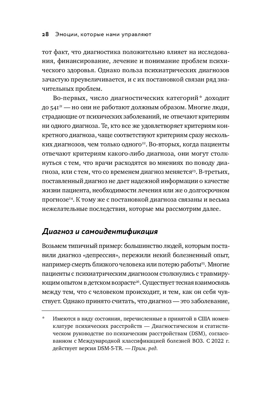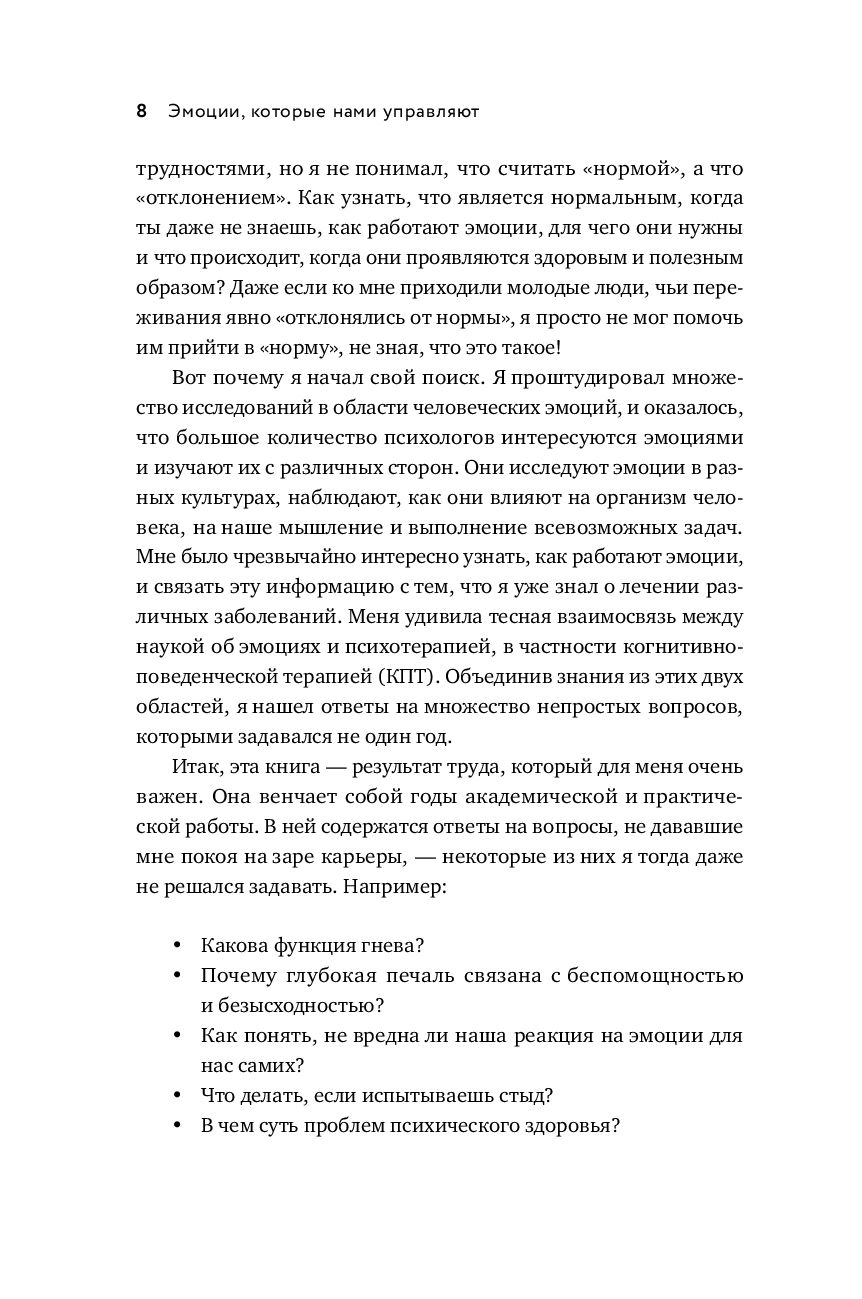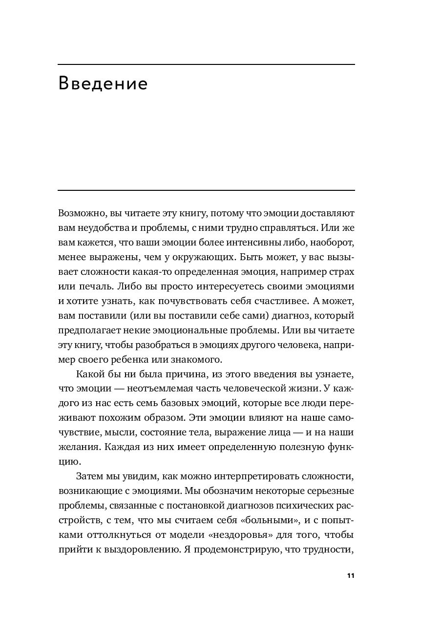 Автор исследует основные человеческие эмоции – страх, гнев, отвращение, чувство вины, стыд и радость – и объясняет, как научиться жить с ними и справляться с эмоциональными проблемами. В каждой из семи глав представлена "эмоциональная ловушка": мы узнаём, что может случиться, когда мы привыкаем реагировать на происходящее не самым конструктивным образом, и как найти выход из этой ловушки. Опираясь на данные науки об эмоциях и методы когнитивно-поведенческой терапии, книга предлагает мощную альтернативу чисто психиатрическому, медикаментозному лечению. Автор – клинический психолог и специалист по КПТ – подкрепляет свои идеи упражнениями и примерами того, как можно достичь душевного благополучия, применяя эти рекомендации в повседневной жизни.