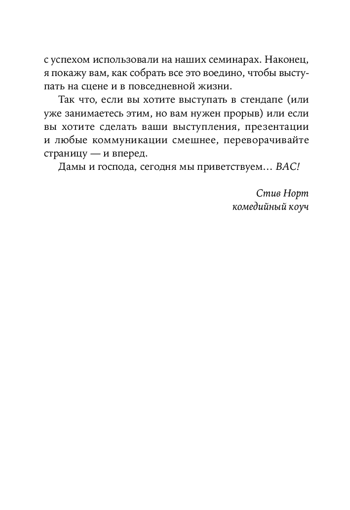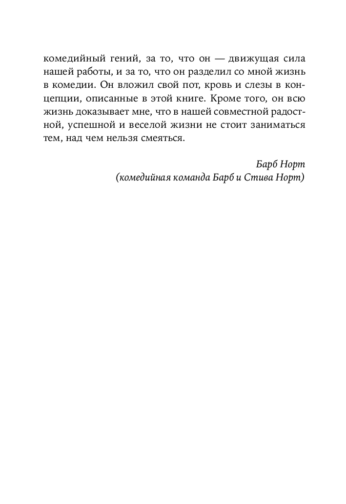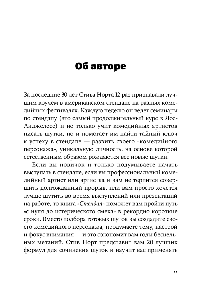 Комедийный коуч Стив Норт начинает книгу с того, что учит вас создавать свой уникальный комедийный персонаж для стендапа, затем предлагает 20 лучших формул написания шуток, разработанных за 20 лет работы на его семинарах, а затем помогает вам собрать все это вместе, чтобы работать как стендап-комик.