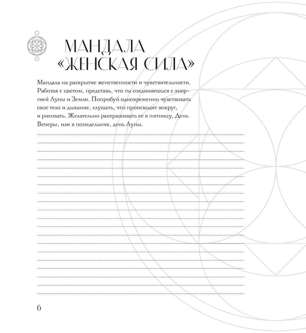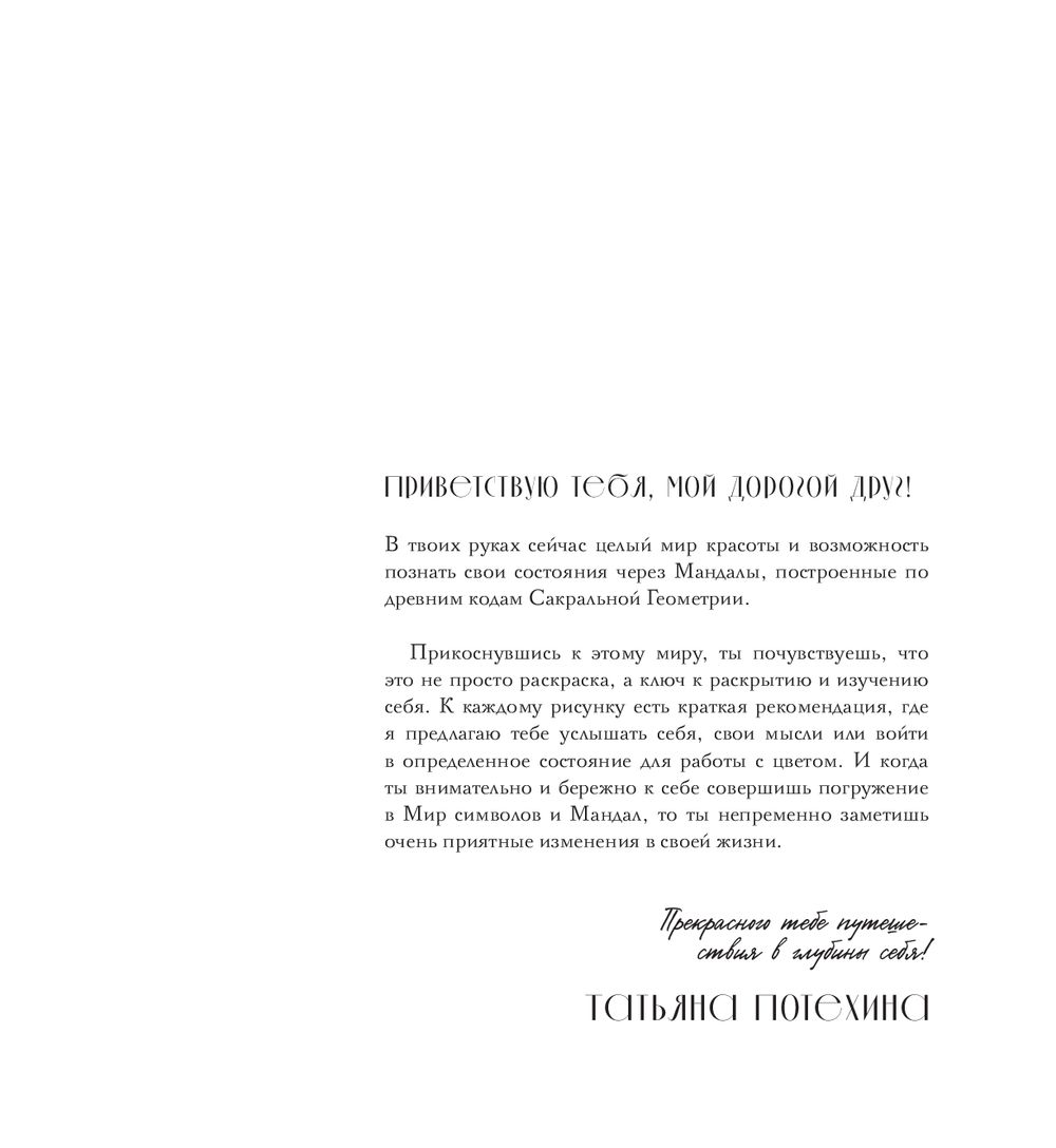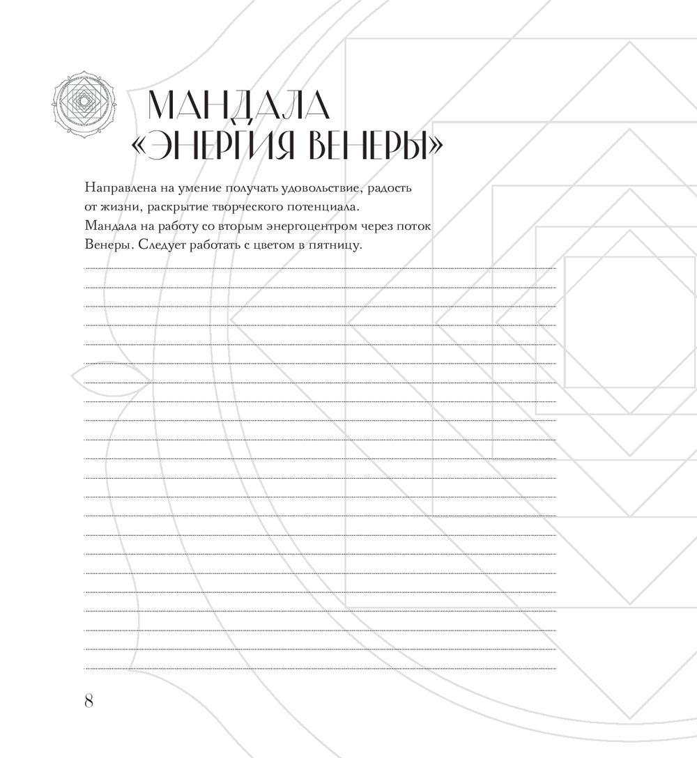Эта книга – не просто раскраска, а ключ к изучению себя, а также проводник в мир символов Сакральной Геометрии. Внутри вы найдете 30 авторских иллюстраций, с помощью которых раскроете свой творческий потенциал и почувствуете связь со своим Высшим Я. Рядом с каждой мандалой есть рекомендации для работы с цветом и пространство для записи своих ощущений.
