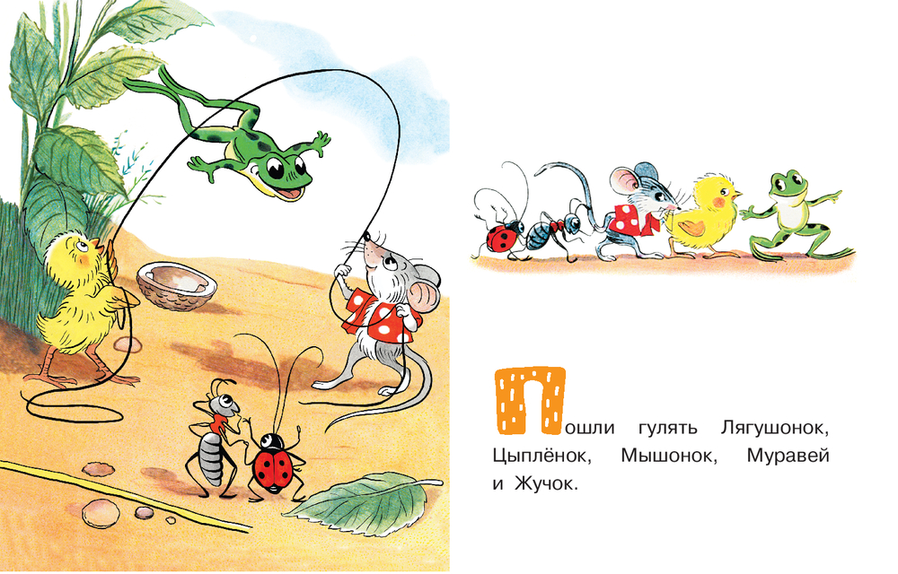 Пошли однажды друзья гулять, пришли на речку – тут-то и оказалось, что плавать из них умеет только Лягушонок. Но Цыплёнок, Мышонок, Муравей и Жучок не расстроились и быстро придумали выход! А что они сделали и как им помогла дружба, вы узнаете из этой книжки!