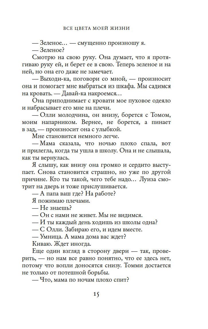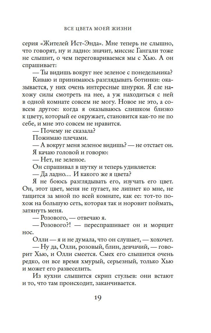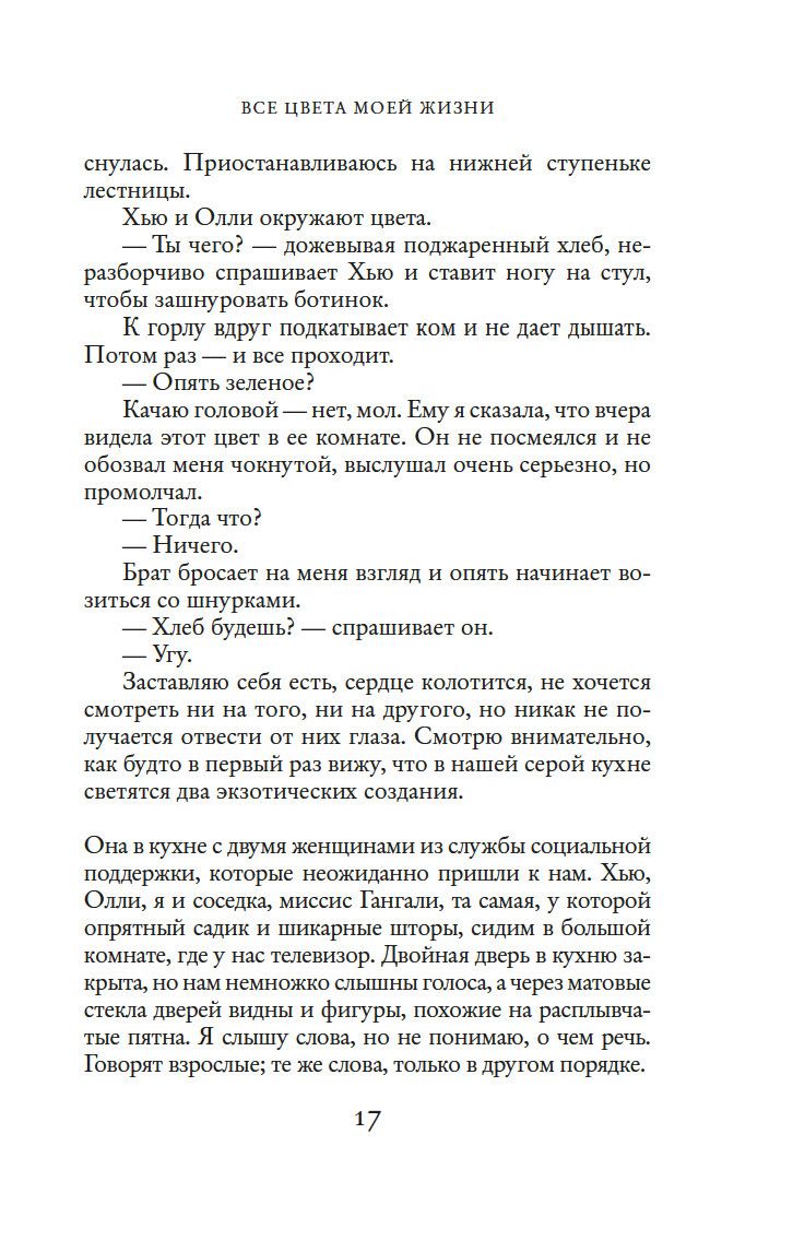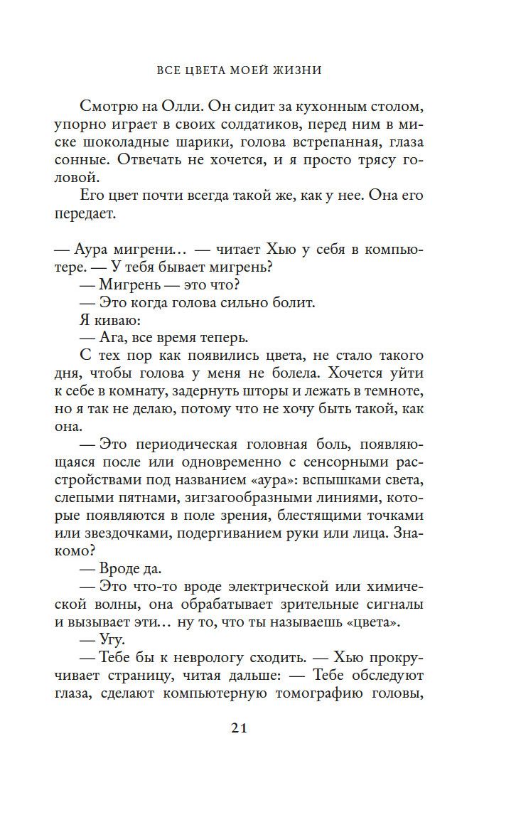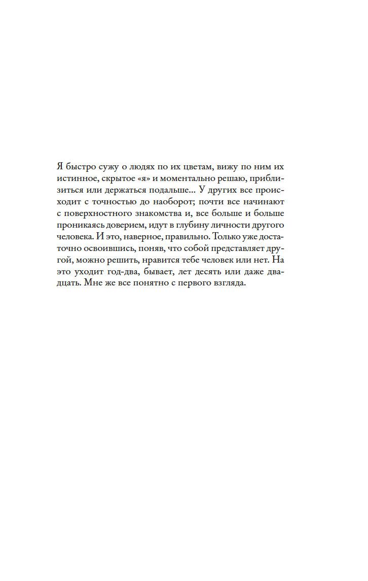 Жизнь сияет разнообразными красками. Золотой – цвет невинности, красный – энергии, оранжевый – легкомыслия, зеленый – цвет тоски... В детстве Элис обнаружила, что чувства, эмоции и намерения других людей способны открываться ей через цвет. Аура подсказывает ей, искренен человек или лжив, надежен или сомнителен, счастлив или неудовлетворен... Необычный дар позволяет ей видеть больше, чем окружающие, но окрасить собственную жизнь в палитру счастья оказывается нелегко. Первое наставление на путь гармонии ей дает сама природа, еще несколько бесценных советов Элис получает от своей необычной подруги. Совершая, как и все люди, ошибки и поднимаясь вверх по ступенькам мудрости и великодушия, она ищет свое место в жизни, ищет любовь, но не находит, пока не встречает мужчину, цвет ауры которого она, к своему удивлению, не может распознать...