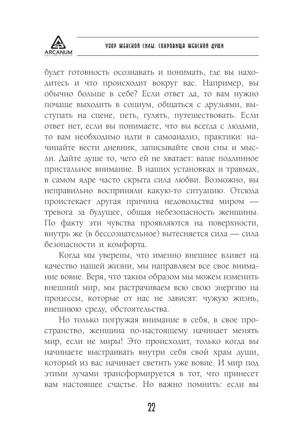 Наша женская суть соткана из самых разных воспоминаний, надежд, мечтаний, событий, лиц. Все это уникальным образом откликается в нас, формируя в душе каждой женщины особое чувствование мира, схожее с узором на полотне. Узор женской силы – это вера и знания, свет и тень, поддержка рода и собственный путь каждой женщины.