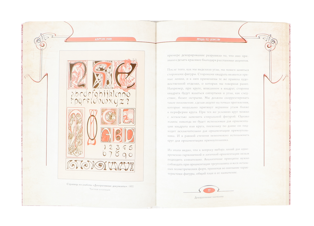 В своей книге "Лекции по искусству" художник объясняет приемы и построение композиции той или иной формы, которые в дальнейшем находят отражение в графических произведениях. Альфонс Муха анализирует такие темы, как равновесие в композиции, гармония человеческого тела, использование цвета, а так же дает трактовку основных характеристик его собственного творчества.