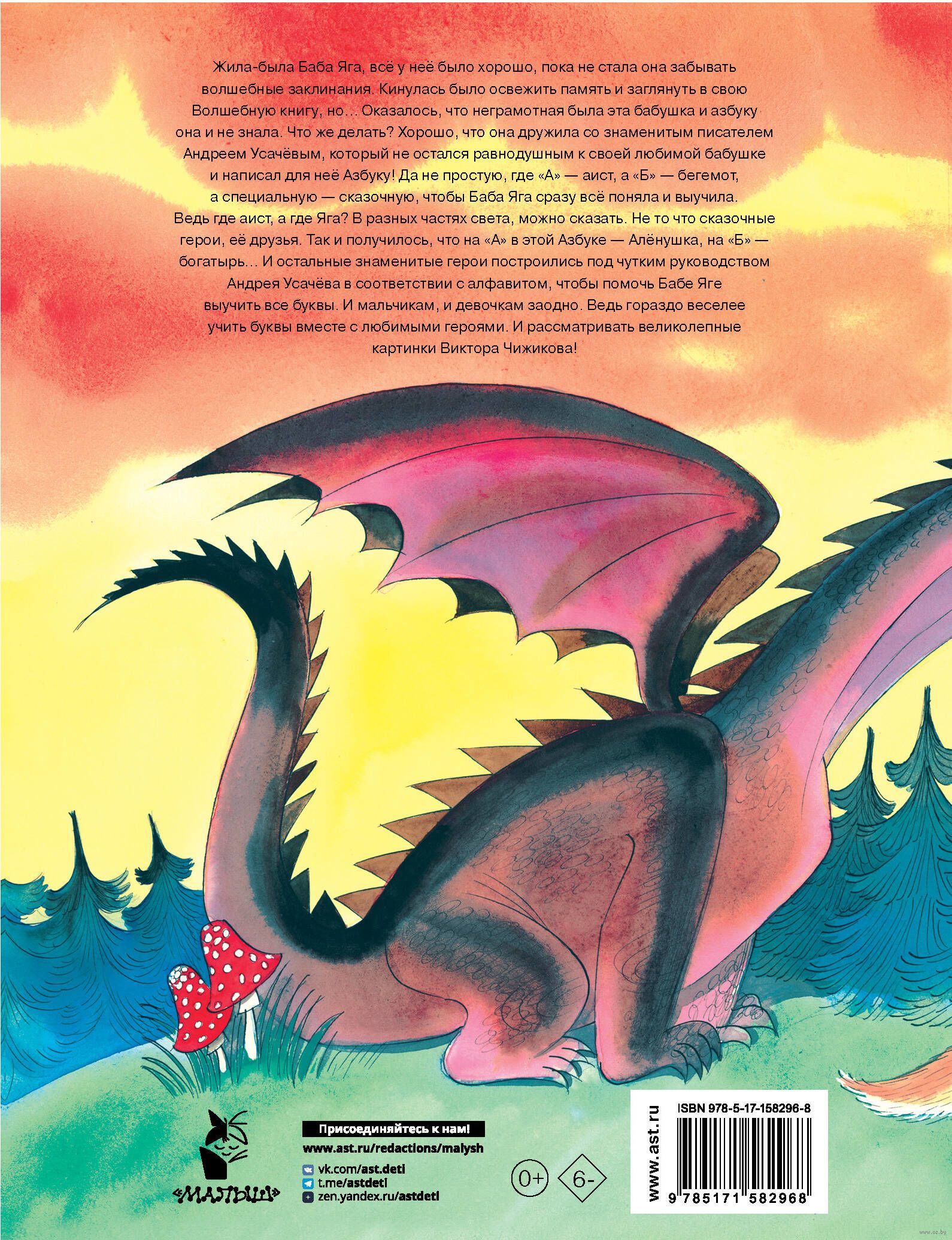 Жила-была Баба Яга, всё у неё было хорошо, пока не стала она забывать волшебные заклинания. Кинулась было освежить память и заглянуть в свою Волшебную книгу, но... Оказалось, что неграмотная была эта бабушка и азбуку она и не знала. Что же делать? Хорошо, что она дружила со знаменитым писателем Андреем Усачёвым, который не остался равнодушным к своей любимой бабушке и написал для неё Азбуку! Да не простую, где "А" – аист, а "Б" – бегемот, а специальную – сказочную, чтобы Баба Яга сразу всё поняла и выучила. Ведь где аист, а где Яга? В разных частях света, можно сказать. Не то что сказочные герои, её друзья. Так и получилось, что на "А" в этой Азбуке – Алёнушка, на "Б" – богатырь... И остальные знаменитые герои построились под чутким руководством Андрея Усачёва в соответствии с алфавитом, чтобы помочь Бабе Яге выучить все буквы. И мальчикам, и девочкам заодно. Ведь гораздо веселее учить буквы вместе с любимыми героями. И рассматривать великолепные картинки Виктора Чижикова!