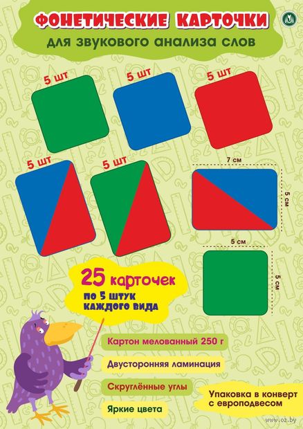 Фонетический набор карточек предназначен старшим дошкольникам и младшим школьникам для выработки умения различать понятие "звук (фонема)", который мы произносим, слышим, и понятие "буква" – знак, при помощи которого мы записываем звук. Дошкольники и ученики с помощью фонетических карточек научатся составлять звуковые схемы слов ("звуковые домики", в которых "живут" мягкие и твердые согласные, ударные и безударные гласные звуки), уверенно выполнять фонетический анализ, что позволит воспитателю, учителю НОО или предшкольной подготовки, учителю-логопеду заниматься индивидуально, с группой детей, классом обучающихся, успешно развивая фонематический слух, речь, мышление, фонематическое и зрительное восприятие, звукобуквенный анализ слов, учить различать гласные и согласные, дифференцировать твердые и мягкие. В наборе 25 карточек двух видов: квадратные и прямоугольные. Исполнены тремя цветами по общепринятым нормам обозначения гласных звуков – красным цветом, твердых согласных звуков – синим цветом, мягких согласных звуков – зеленым цветом. Квадратные формы карточек означают отдельный звук: красный цвет – гласный звук (например, [А], [О], [Ы], [И] др.), зеленый цвет – мягкий согласный звук (например, [Й'], [Щ'], [Ч'], [С'] и др.), синий цвет – твердый согласный звук (например, [Б], [З], [Ш], [Ц] и др.). Прямоугольные карточки означают слияние звуков – слоги: цвета зеленый + красный – слияние мягкого согласного с гласным (МИ, РЯ, ЛЮ, ВЕ и др.), синий + красный – слияние твердого согласного с гласным звуком (МЫ, РА, ЛУ, ВЭ и др.). количество карточек позволяет работать с ними над словами с разным количеством звуков и слогов.