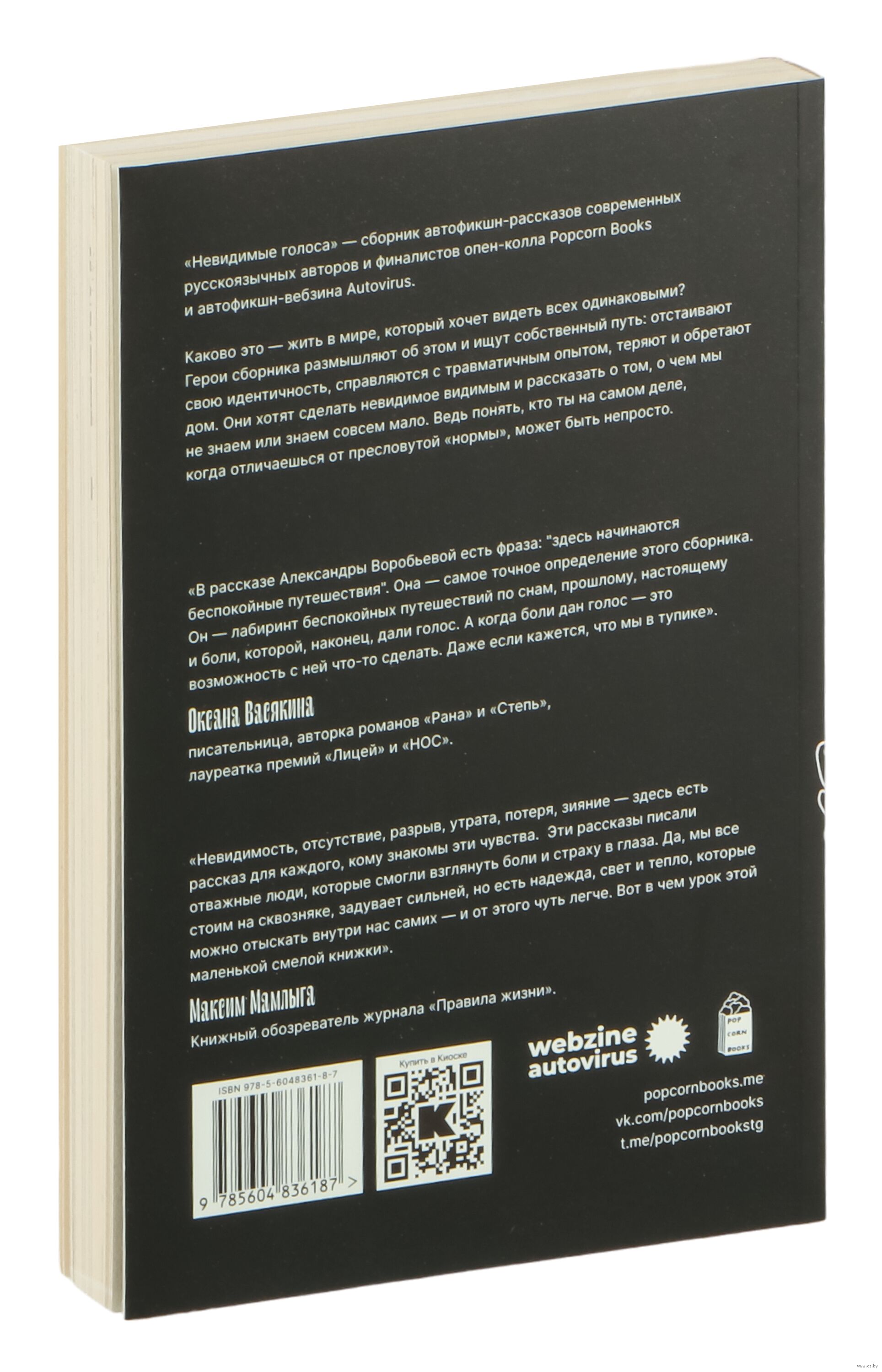 "Невидимые голоса" – сборник автофикшн-рассказов современных русскоязычных авторов и финалистов опен-колла Popcorn Books и автофикшн-вебзина Autovirus. Каково это – жить в мире, который хочет видеть всех одинаковыми? Герои сборника размышляют об этом и ищут собственный путь: отстаивают свою идентичность, справляются с травматичным опытом, теряют и обретают дом. Они хотят сделать невидимое видимым и рассказать о том, о чем мы не знаем или знаем совсем мало. Ведь понять, кто ты на самом деле, когда отличаешься от пресловутой "нормы", может быть непросто.