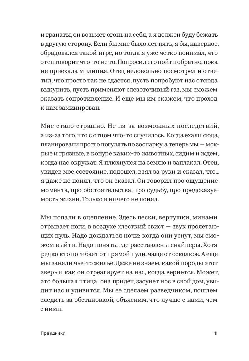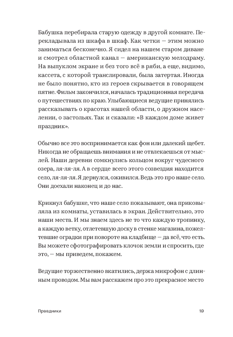 "Праздники" – это одиннадцать историй, которые могут стать фильмами, спектаклями, рыбами или снами, но пока что нашли себя в виде мистических сказок о подлинных переживаниях. В прошитом узорами, нездешним языком и ритуалами пространстве сборника квартира превращается в лес, на развалинах храма звучит потустороннее пение, а дети осваивают Тибет и выпускают зверей из зоопарка. Для потерявшихся внутри книги есть карта.
