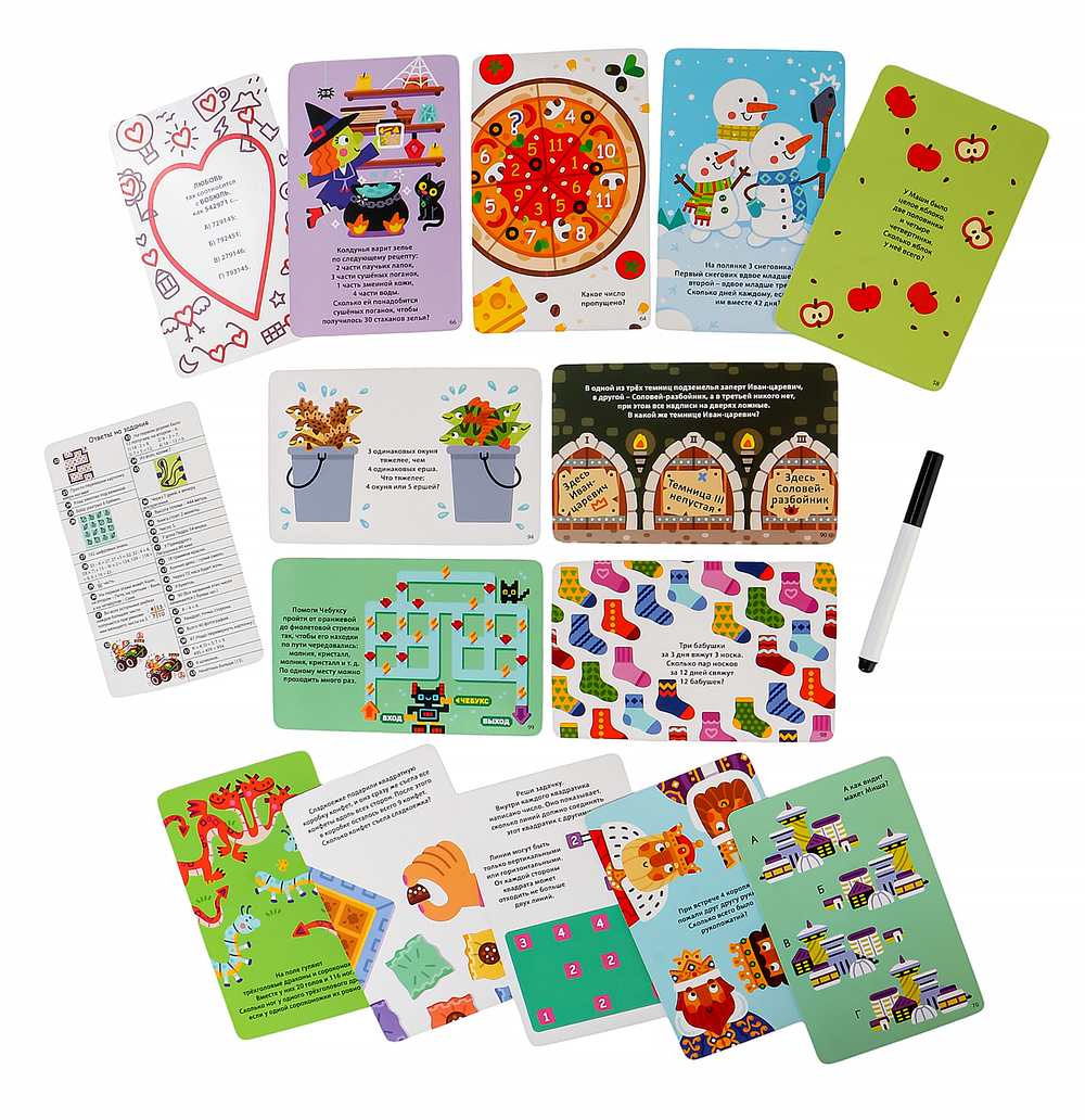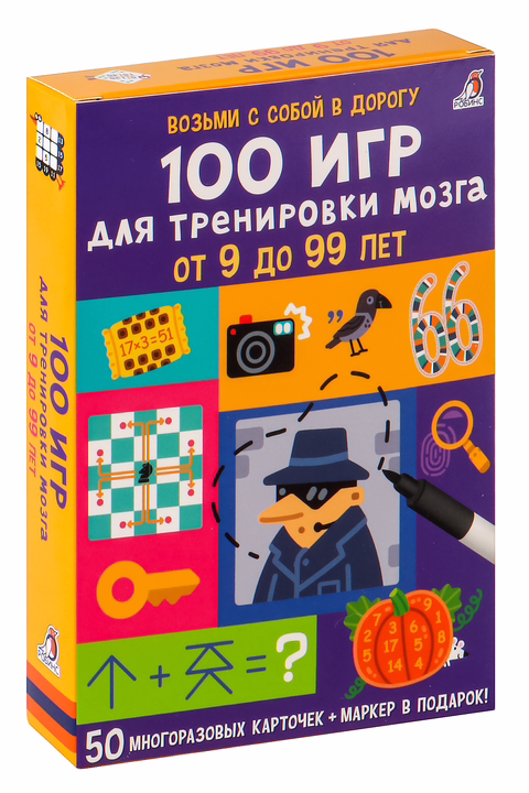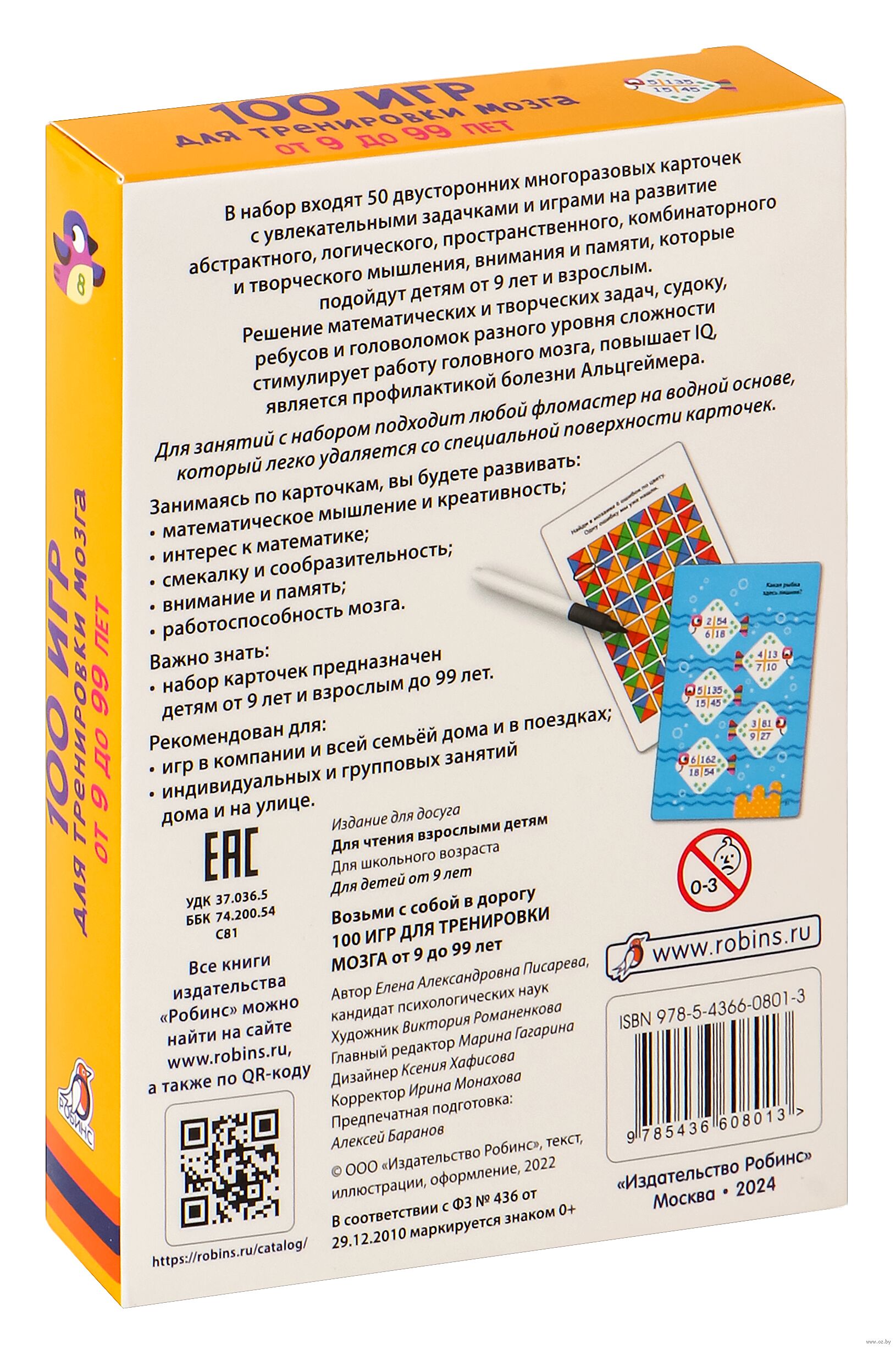 В набор входят 50 двусторонних многоразовых карточек с увлекательными задачками и играми на развитие абстрактного, логического, пространственного, комбинаторного и творческого мышления, внимания и памяти, которые подойдут детям от 9 лет и взрослым.