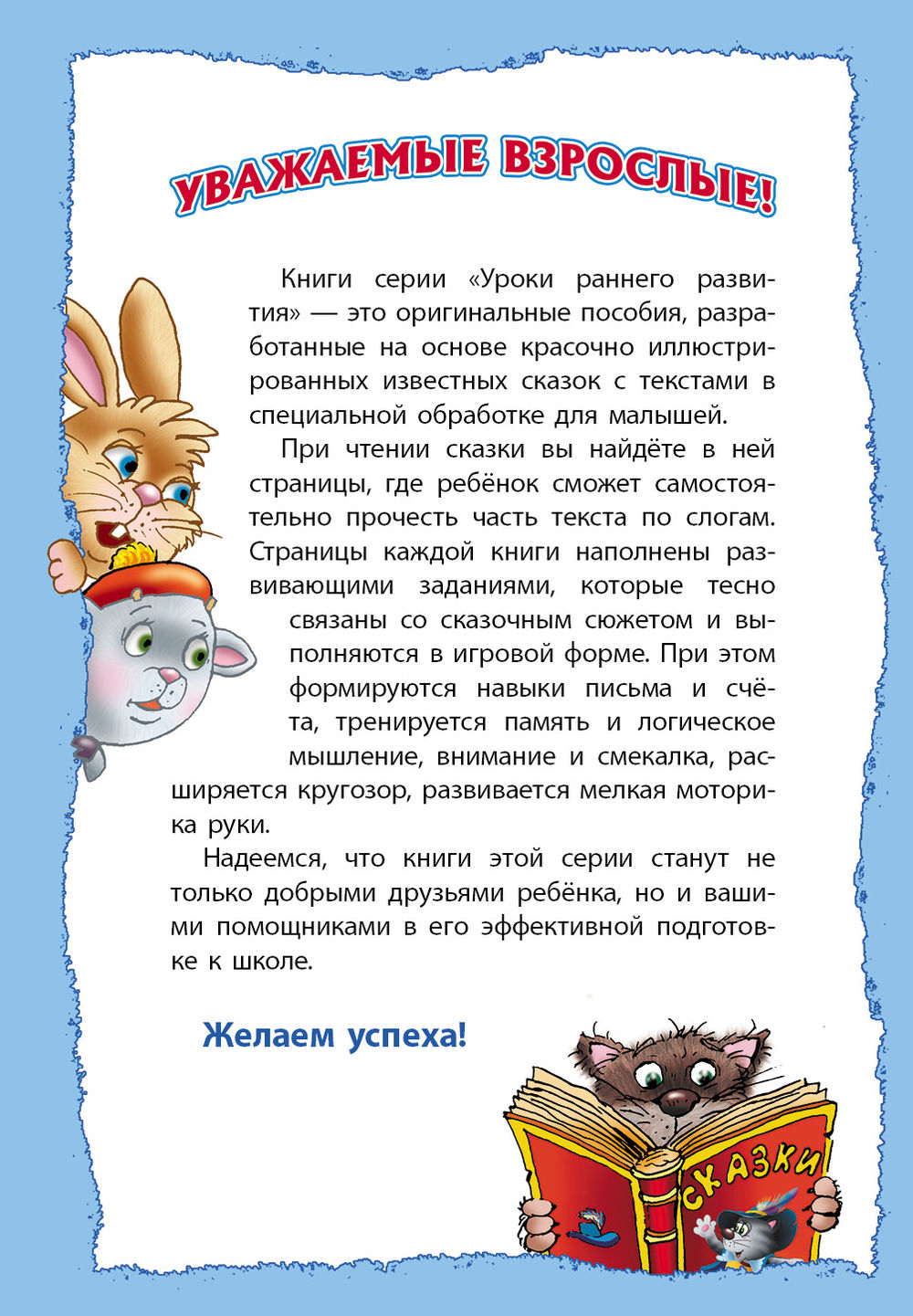 Книги серии "Уроки раннего развития" – это оригинальные пособия, разработанные на основе красочно иллюстрированных известных сказок с текстами в специальной обработке для малышей.