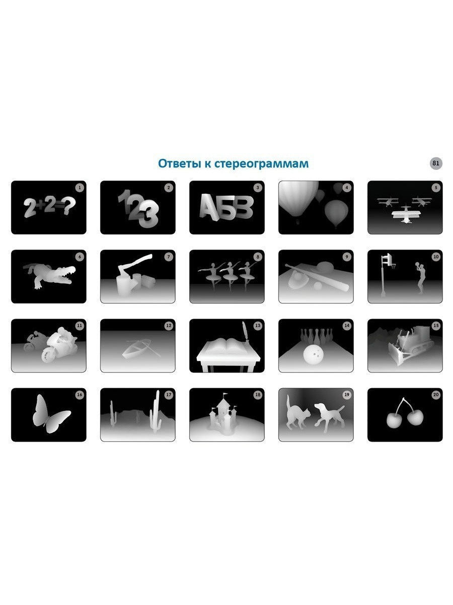 В набор входит 40 двусторонних карточек со стереокартинками разных уровней сложности и видов, 2 карточки с ответами, 1 карточка с гимнастикой для глаз и карточка с инструкцией. Он создан и разработан при поддержке ведущих офтальмологов специально для профилактической поддержки и восстановления зрения.