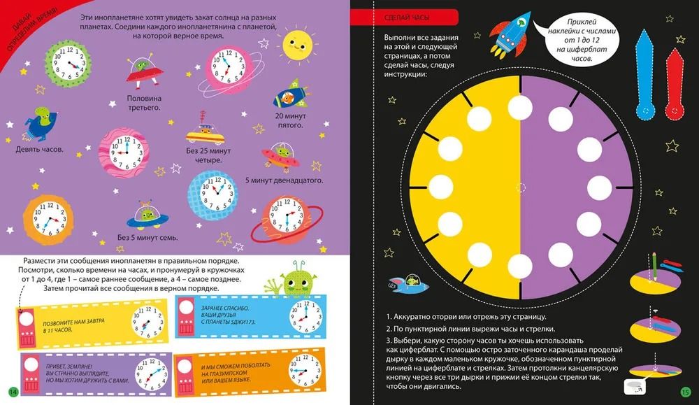 Что найдем внутри: каждый разворот – это настоящее приключение в мире дней, часов и минут. Выполняй задания, раскрашивай, узнавай, разглядывай и клей наклейки!