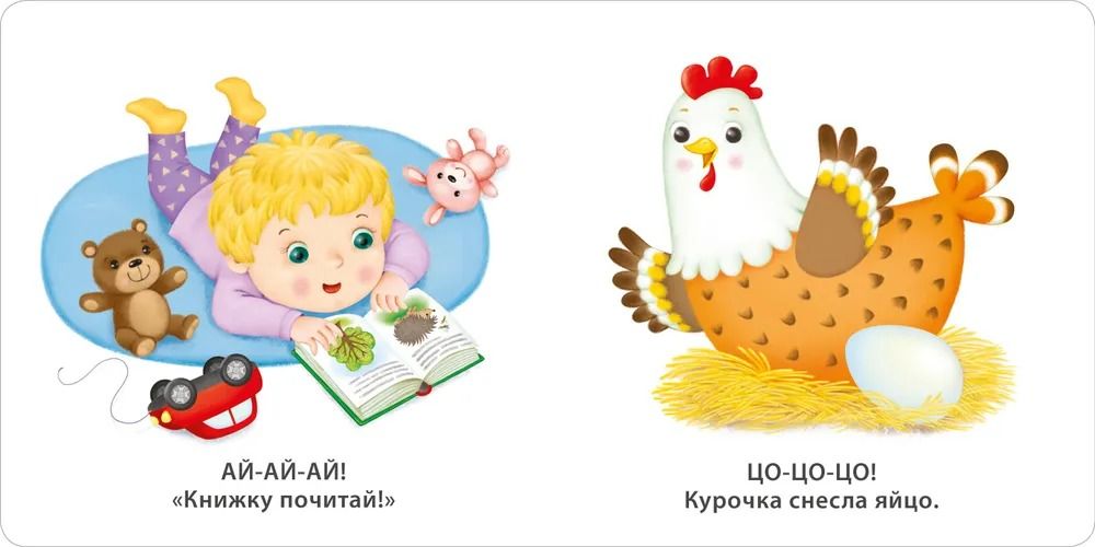 Эта книжка – настоящая находка для любознательного малыша. На каждой ее страничке – яркие картинки и первые бормоталки, которые помогут малышу развивать произношение, чтобы избежать логопедических проблем в будущем.