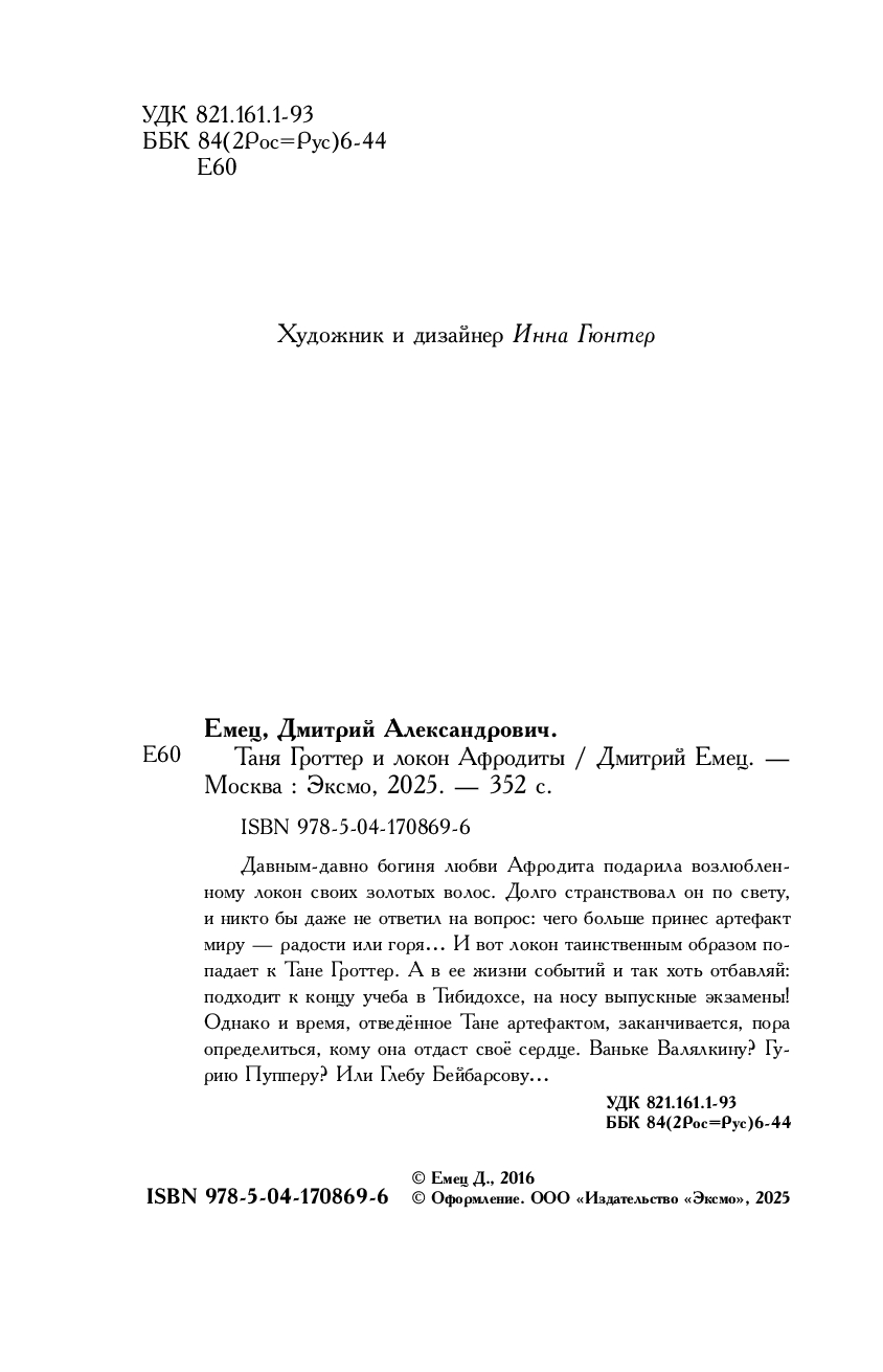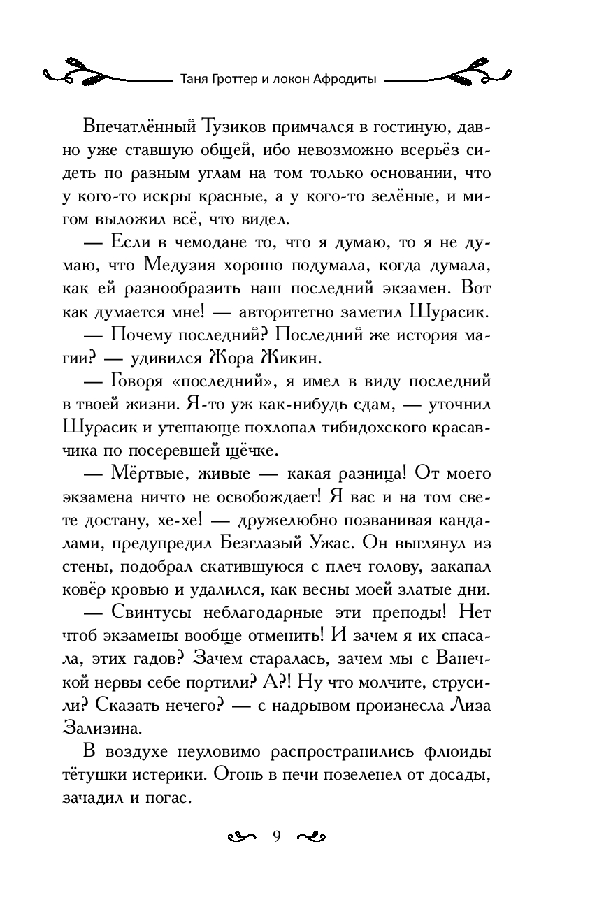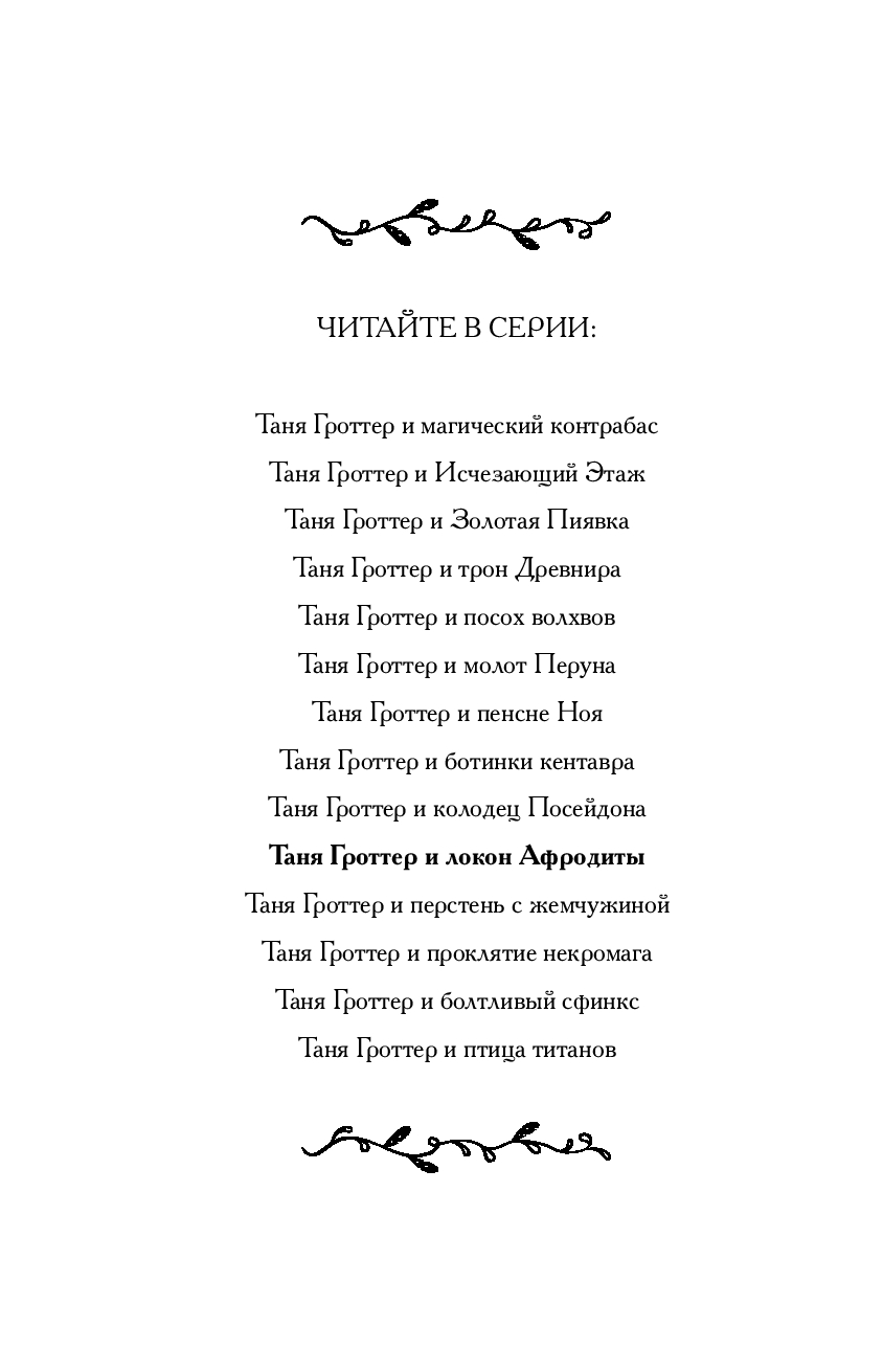 Много столетий странствует по свету локон золотых волос богини любви Афродиты. Давным-давно подарила она его своему возлюбленному, и непонятно, чего больше этот артефакт принес в мир – радости или скорби... И вот локон загадочным образом попадает к Тане Гроттер. А у нее жизнь и так бурлит событиями. Подходит к концу учеба в Тибидохсе. Впереди выпускные экзамены! Однако и время, отведенное Тане артефактом, неумолимо истекает. Чтобы локон Афродиты соединил судьбы, нужно произнести свое имя на один конец пряди и имя избранника – на другой. Кого же выбрать? Ваньку Валялкина? Гурия Пуппера? Глеба Бейбарсова? Но самое главное, кто и зачем прислал ей этот коварный артефакт?..